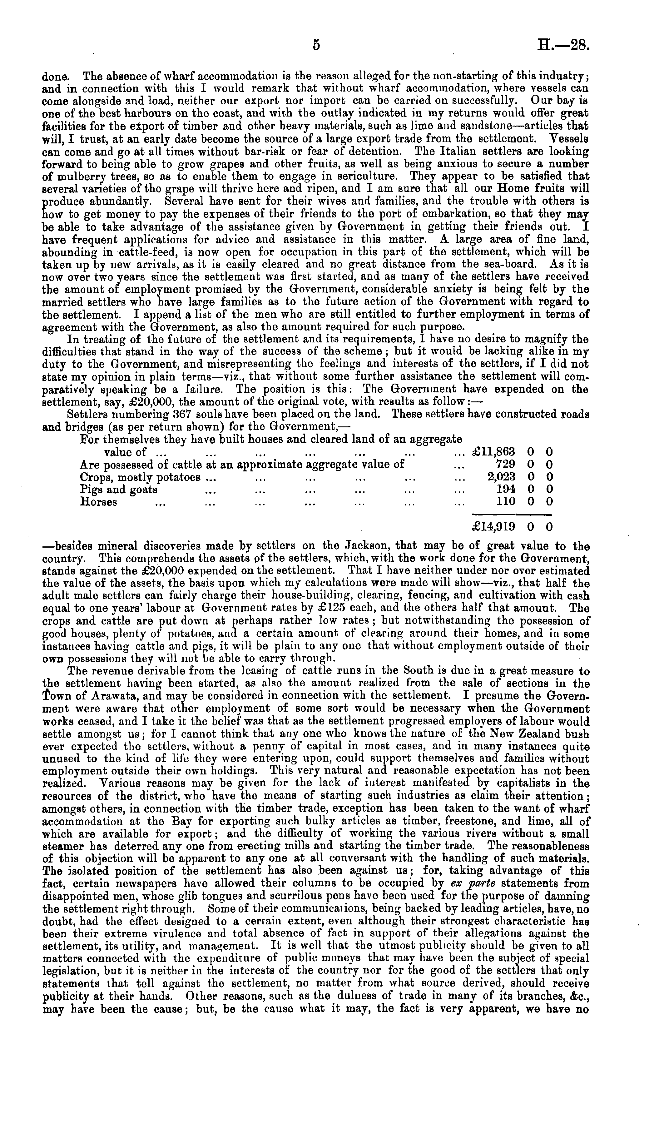 done. The absence of wharf accommodation is the reason alleged for the non-starting of this industry; and in connection with this I would remark that without wharf accommodation, where vessels can come alongside and load, neither our export nor import can be carried ou successfully. Our bay is one of the best harbours on the coast, and with the outlay indicated in my returns would offer great facilities for the export of timber and other heavy materials, such as lime and sandstone—articles that will, I trust, at an early date become the source of a large export trade from the settlemeut. Vessels can come and go at all times without bar-risk or fear of deteution. The Italian settlers are looking forward to being able to grow grapes and other fruits, as well as being anxious to secure a number of mulberry trees, so as to enable them to engage in sericulture. They appear to be satisfied that several varieties of the grape will thrive here and ripen, and I am sure that all our Home fruits will produce abundantly. Several have sent for their wives and families, and the trouble with others ia how to get money to pay the expenses of their friends to the port of embarkation, so that they may be able to take advantage of the assistance given by Government in getting their friends out. I have frequent applications for advice and assistance in this matter. A large area of fine land, abounding in cattle-feed, is now open for occupation in this part of the settlement, which will be taken up by new arrivals, as it is easily cleared and no great distance from the sea-board. As it is now over two years since the settlement was first started, and as many of the settlers have received the amount of employment promised by the Government, considerable anxiety is being felt by the married settlers who have large families as to the future action of the Government with regard to the settlement. I append a list of the men who are still entitled to further employment in terms of agreement with the Government, as also the amount required for such purpose. In treating of the future of the settlement and its requirements, I have no desire to magnify the difficulties that stand in the way of the success of the scheme ; but it would be lacking alike in my duty to the Government, and misrepresenting the feelings and interests of the settlers, if I did not state my opinion in plain terms —viz., that without some further assistance the settlement will comparatively speaking be a failure. The position is this: The Government have expended on the settlement, say, £20,000, the amount of the original vote, with results as follow : — Settlers numbering 367 souls have been placed on the land. These settlers have constructed roads and bridges (as per return shown) for the Government, — For themselves they have built houses and cleared land of an. aggregate value of ... ... ... ... ... ... ... £11,863 0 0 Are possessed of cattle at an approximate aggregate value of ... 729 0 0 Crops, mostly potatoes ... ... ... ... ... ... 2,023 0 0 Pigs and goats ... ... ... ... ... ... 194 0 0 Horses ... ... ... ... ... ... ... 110 0 0 £14,919 0 0 —besides mineral discoveries made by settlers on the Jackson, that may be of great value to the country. This comprehends the assets of the settlers, which, with the work done for the Government, stands against the £20,000 expended on the settlemeut. That I have neither under nor over estimated the value of the assets, the basis upon which my calculations were made will show—viz., that half the adult male settlers can fairly charge their house-building, clearing, fencing, and cultivation with cash equal to one years' labour at Government rates by £125 each, and the others half that amount. The crops and cattle are put down at perhaps rather low rates ; but notwithstanding the possession of good houses, plenty of potatoes, and a certain amount of clearing around their homes, and in some iustances having cattle and pigs, it will be plain to any one that without employment outside of their own possessions they will not be able to carry through. The revenue derivable from the leasing of cattle runs in the South is due in a great measure to the settlement having been started, as also the amount realized from the sale of sections in the Town of Arawata, and may be considered in connection with the settlement. I presume the Government were aware that other employment of some sort would be necessary when the Government works ceased, and I take it the belief was that as the settlement progressed employers of labour would settle amongst us; for I cannot think that any one who knows the nature of the New Zealand bush ever expected the settlors, without a penny of capital in most cases, and in many instances quite unused to the kind of life they were entering upon, could support themselves and families without employment outside their own holdings. This very natural and reasonable expectation has not been realized. Various reasons may be given for the lack of interest manifested by capitalists in the resources of the district, who have the means of starting such industries as claim their attention; amongst others, in connection with the timber trade, exception has beeu taken to the want of wharf accommodation at the Bay for exporting such bulky articles as timber, freestone, and lime, all of which are available for export; and the difficulty of working the various rivers without a small steamer has deterred any one from erecting mills and starting the timber trade. The reasonableness of this objection will be apparent to any one at all conversant with the handling of such materials. The isolated position of the settlement has also been against us; for, taking advantage of this fact, certain newspapers have allowed their columns to be occupied by ex parte statements from disappointed men, whose glib tongues and scurrilous pens have been used for the purpose of damning the settlement right throug