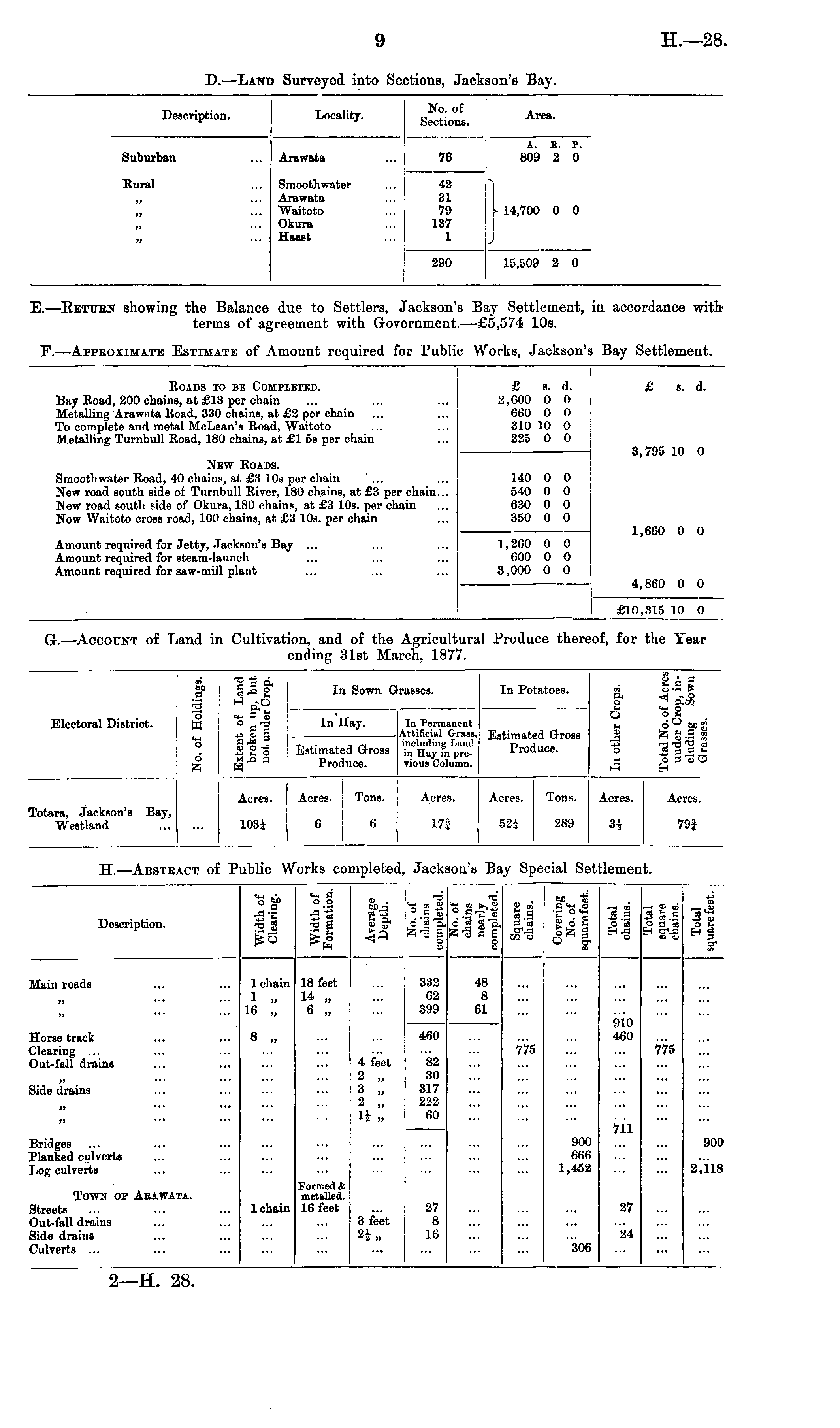 E. —Eettjen showing the Balance due to Settlers, Jackson's Bay Settlement, in accordance with terms of agreement with Government.—£s,s74 10s. F. —Approximate Estimate of Amount required for Public Works, Jackson's Bay Settlement.