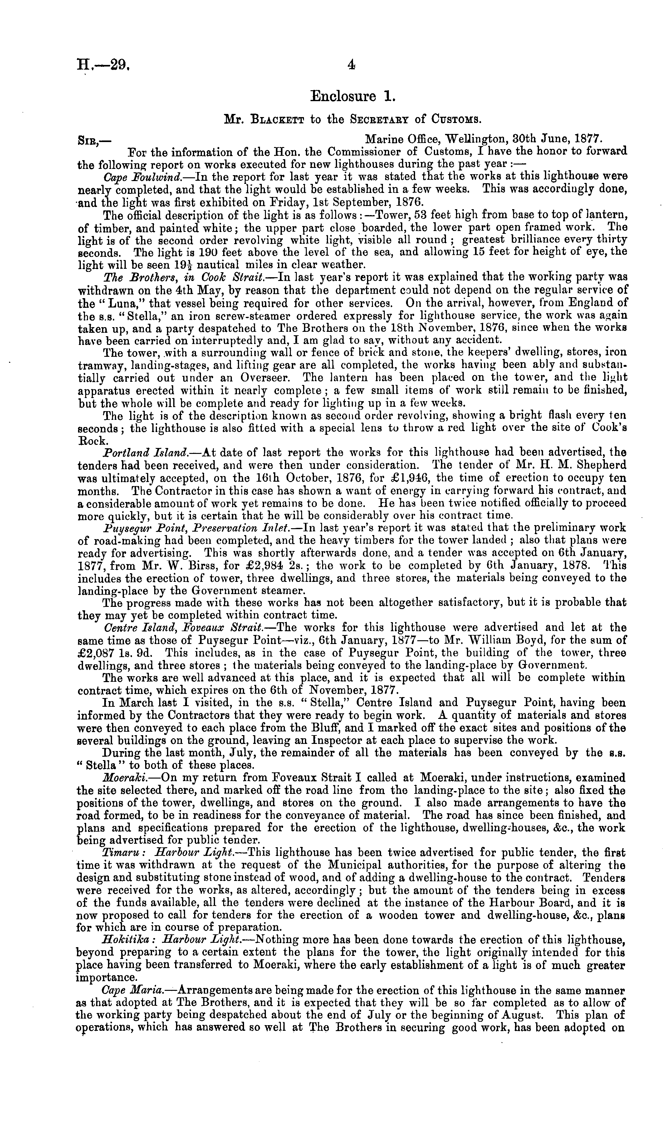 Enclosure 1. Mr. Blackett to the Seceetaey of Customs. Sic,— Marine Office, Wellington, 30th June, 1877. For the information of the Hon. the Commissioner of Customs, I have the honor to forward the following report on works executed for new lighthouses during the past year : — Cape Foulwind. —In the report for last year it was stated that the works at this lighthouse were nearly completed, and that the light would be established in a few weeks. This was accordingly done, and the light was first exhibited on Friday, Ist September, 1876. The official description of the light is as follows : —Tower, 53 feet high from base to top of lantern, of timber, and painted white; the upper part close boarded, the lower part open framed work. The light is of the second order revolving white light, visible all round ; greatest brilliance every thirty seconds. The light is 190 feet above the level of the sea, and allowing 15 feet for height of eye, the light will be seen 19-2- nautical miles in clear weather. The Brothers, in Cook Strait. —In last year's report it was explained that the working party was withdrawn on the 4th May, by reason that the department could not depend on the regular service of the " Luna," that vessel being required for other services. On the arrival, however, from England of the s.s. " Stella," an iron screw-steamer ordered expressly for lighthouse service, the work was again taken up, and a party despatched to The Brothers on the 18th November, 1876, since when the works have been carried on interruptedly and, I am glad to say, without any accident. The tower, with a surrounding wall or fence of brick and stone, the keepers' dwelling, stores, iron tramway, landing-stages, and lifting gear are all completed, the works having been ably and substantially carried out under an Overseer. The lantern has been placed on the tower, and the light apparatus erected within it nearly complete ; a few small items of work still remain to be finished, but the whole will be complete and ready for lighting up in a few weeks. The light is of the description known as second order revolving, showing a bright flash every ten seconds; the lighthouse is also fitted with a special lens to throw a red light over the site of Cook's Rock. Portland Island, —At date of last report the works for this lighthouse had been advertised, the tenders had been received, and were then under consideration. The tender of Mr. H. M. Shepherd was ultimately accepted, on the 16th October, 1876, for £1,946, the time of erection to occupy ten months. The Contractor in this case has shown a want of energy in carrying forward his contract, and a considerable amount of work yet remains to be done. He has been twice notified officially to proceed more quickly, but it is certain that he will be considerably over his contract time. Puyseyur Point, Preservation Inlet. —ln last year's report it was staled that the preliminary work of road-making had been completed, and the heavy timbers for the tower landed ; also that plans were ready for advertising. This was shortly afterwards done, and a tender was accepted on 6th January, 1877, from Mr. W. Birss, for £2,984 25.; the work to be completed by 6th January, 1878. This includes the erection of tower, three dwellings, and three stores, the materials being conveyed to the landing-place by the Government steamer. The progress made with these works has not been altogether satisfactory, but it is probable that they may yet be completed within contract time. Centre Island, Foveaux Strait. —The works for this lighthouse were advertised and let at the same time as those of Puysegur Point—-viz., 6th January, 1877 —to Mr. AVilliain Boyd, for the sum of £2,087 Is. 9d. This includes, as in the case of Puysegur Point, the building of the tower, three dwellings, and three stores ; Ihe materials being conveyed to the landing-place by Government. The works are well advanced at this place, and it is expected that all will be complete within contract time, which expires on the 6th of November, 1877. In March last I visited, in the s.s. " Stella," Centre Island and Puysegur Point, having been informed by the Contractors that they were ready to begin work. A quantity of materials and stores were then conveyed to each place from the Bluff, and I marked off the exact sites and positions of the several buildings on the ground, leaving an Inspector at each place to supervise the work. During the last month, July, the remainder of all the materials has been conveyed by the s.s. " Stella " to both of these places. Moeraki. —On my return from Foveaux Strait I called at Moeraki, under instructions, examined the site selected there, and marked off the road line from the landing-place to the site; also fixed the positions of the tower, dwellings, and stores on the ground. I also made arrangements to have the road formed, to be in readiness for the conveyance of material. The road has since been finished, and plans and specifications prepared for the erection of the lighthouse, dwelling-houses, &c, the work being advertised for public tender. Timaru: Harbour Light. —This lighthouse has been twice advertised for public tender, the first time it was withdrawn at the request of the Municipal authorities, for ihe purpose of altering the design and substituting stone instead of wood, and of adding a dwelling-house to the contract. Tenders were received for the works, as altered, accordingly ; but the amount of the tenders being in excess of the funds available, all the tenders were declined at the instance of the Harbour Board, and it is now proposed to call for tenders for the erection of a wooden tower and dwelling-house, &c, plans for which are in course of preparation. Hokitika : Harbour Light. —Nothing more has been done towards the erection of this lighthouse, beyond preparing to a certain extent the plans for the tower, the light originally intended for this place having been transf