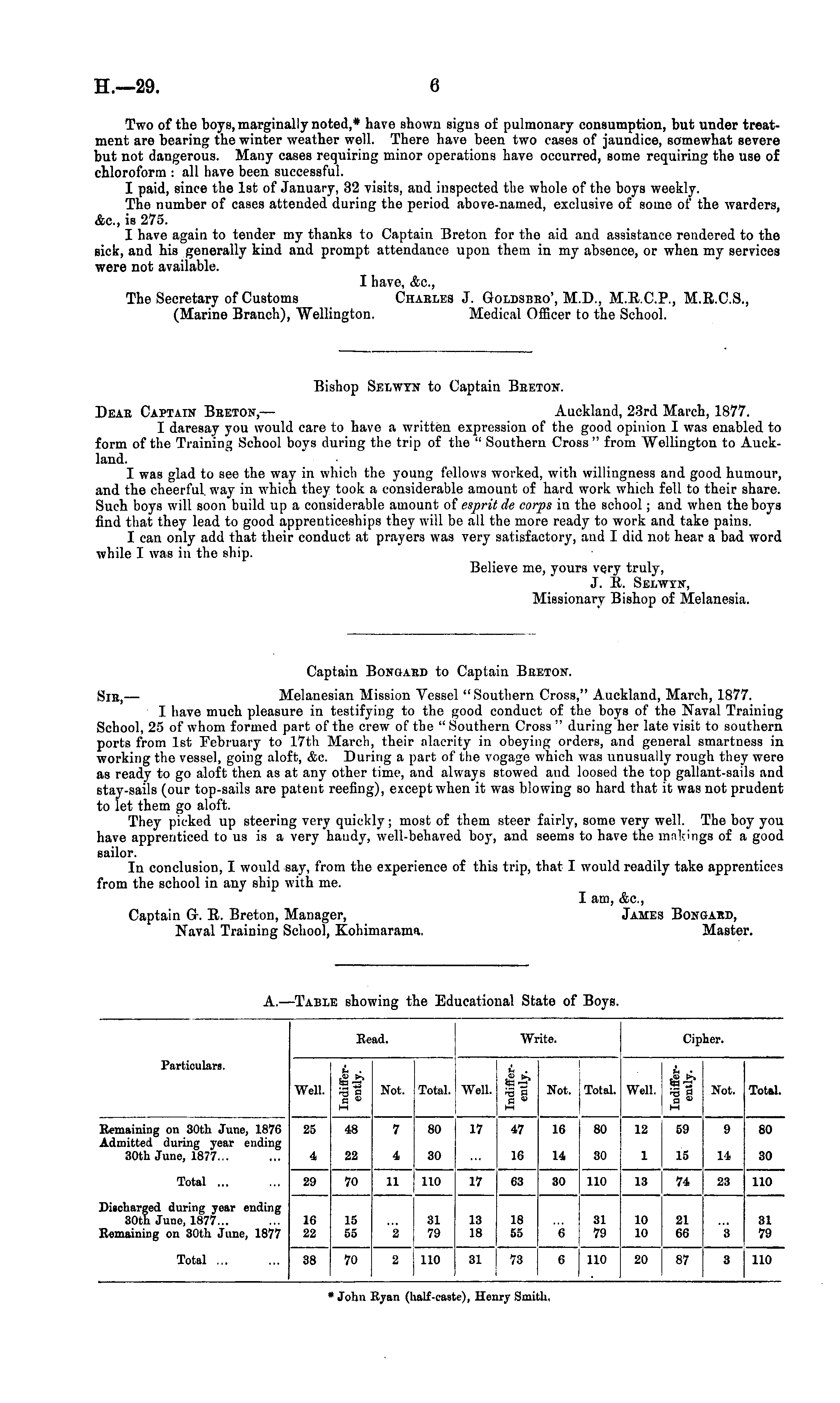 Captain Bongard to Captain Breton. Sic, — Melanesian Mission Vessel "Southern Cross," Auckland, March, 1877. I have much pleasure in testifying to the good conduct of the boys of the Naval Training School, 25 of whom formed part of the crew of the " Southern Cross " during her late visit to southern ports from Ist February to 17th March, their alacrity in obeying orders, and general smartness in working the vessel, going aloft, &c. During a part of the vogago which was unusually rough they were as ready to go aloft then as at any other time, and always stowed and loosed the top gallant-sails and stay-sails (our top-sails are patent reefing), except when it was blowing so hard that it was not prudent to let them go aloft. They picked up steering very quickly; most of them steer fairly, some very well. The boy you have apprenticed to us is a very handy, well-behaved boy, and seems to have the makings of a good sailor. In conclusion, I would say, from the experience of this trip, that I would readily take apprentices from the school in any ship with me. I am, &c, Captain G. R. Breton, Manager, James Bongard, Naval Training School, Kohimarama. Master.