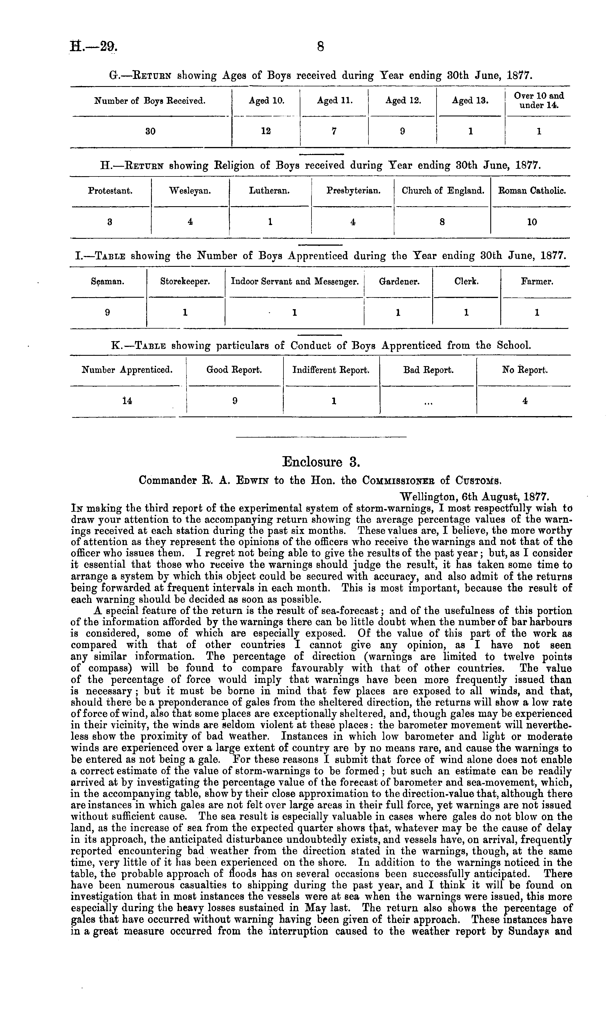 Enclosure 3. Commander R. A. Edwin to the Hon. the Commissioner of Customs, Wellington, 6th August, 1877. In making the third report of the experimental system of storm-warnings, I most respectfully wish to draw your attention to the accompanying return showing the average percentage values of the warnings received at each station during the past six months. These values are, I believe, the more worthy of attention as they represent the opinions of the officers who receive the warnings and not that of the officer who issues them. I regret not being able to give the results of the past year; but, as I consider it essential that those who receive the warnings should judge the result, it has taken some time to arrange a system by which this object could be secured with accuracy, and also admit of the returns being forwarded at frequent intervals in each month. This is most important, because the result of each warning should be decided as soon as possible. A special feature of the return is the result of sea-forecast; and of the usefulness of this portion of the information afforded by the warnings there can be little doubt when the number of bar harbours is considered, some of which are especially exposed. Of the value of this part of the work as compared with that of other countries I cannot give any opinion, as I have not seen any similar information. The percentage of direction (warnings are limited to twelve points of compass) will be found to compare favourably with that of other countries. The value of the percentage of force would imply that warnings have been more frequently issued than is necessary ; but it must be borne in mind that few places are exposed to all winds, and that, should there be a preponderance of gales from the sheltered direction, the returns will show a low rate of force of wind, also that some places are exceptionally sheltered, and, though gales may be experienced in their vicinity, the winds are seldom violent at these places: the barometer movement will nevertheless show the proximity of bad weather. Instances in which low barometer and light or moderate winds are experienced over a large extent of country are by no means rare, and cause the warnings to be entered as not being a gale. For these reasons I submit that force of wind alone does not enable a correct estimate of the value of storm-warnings to be formed ; but such an estimate can be readily arrived at by investigating the percentage value of the forecast of barometer and sea-movement, which, in the accompanying table, show by their close approximation to the direction-value that, although there are instances in which gales are not felt over large areas in their full force, yet warnings are not issued without sufficient cause. The sea result is especially valuable in cases where gales do not blow on the land, as the increase of sea from the expected quarter shows that, whatever may be the cause of delay in its approach, the anticipated disturbance undoubtedly exists, and vessels have, on arrival, frequently reported encountering bad weather from the direction stated in the warnings, though, at the same time, very little of it has been experienced on the shore. In addition to the warnings noticed in the table, the probable approach of floods has on several occasions been successfully anticipated. There have been numerous casualties to shipping during the past year, and I think it will be found on investigation that in most instances the vessels were at sea when the warnings were issued, this more especially during the heavy losses sustained in May last. The return also shows the percentage of gales that have occurred without w-arning having been given of their approach. These instances have in a great measure occurred from the interruption caused to the weather report by Sundays and