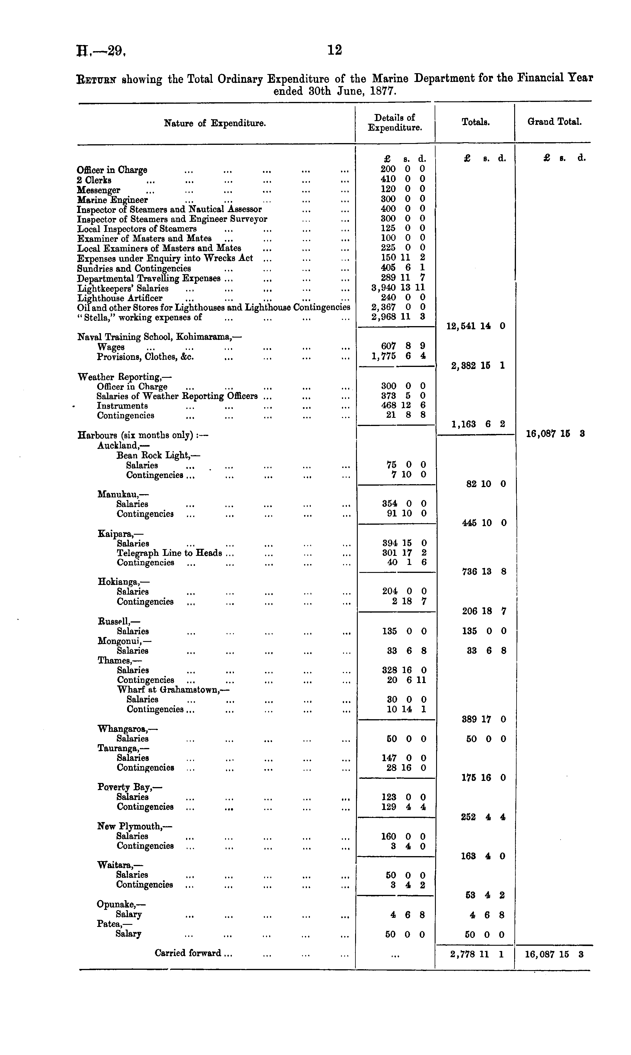 Nature of Expenditure. Details of Expenditure. Totals. Grand Total. £ s. d. 200 0 0 410 0 0 120 0 0 300 0 0 400 0 0 300 0 0 125 0 0 100 0 0 225 0 0 150 11 2 405 6 1 289 11 7 3,940 13 11 240 0 0 2,367 0 0 2,968 11 3 £ b. d. £ s. d. Officer in Charge 2 Clerks Messenger Marine Engineer Inspector of Steamers and Nautical Assessor Inspector of Steamers and Engineer Surveyor Local Inspectors of Steamers Examiner of Masters and Mates Local Examiners of Masters and Mates Expenses under Enquiry into Wrecks Act ... Sundries and Contingencies Departmental Travelling Expenses ... Lightkeepers' Salaries Lighthouse Artificer Oil and other Stores for Lighthouses and Lighthouse Contingencies " Stella," working expenses of Naval Training School, Kohimarama, — Wages Provisions, Clothes, &c. 12,541 14 0 607 8 9 1,775 6 4 2,382 15 1 Weather Reporting, — Officer in Charge Salaries of Weather Reporting Officers ... Instruments Contingencies 300 0 0 373 5 0 468 12 6 21 8 8 1,163 6 2 Harbours (six months only) :— Auckland, — Bean Rock Light, — Salaries Contingencies... 16,087 15 3 75 0 0 7 10 0 Manukau, — Salaries Contingencies 82 10 0 354 0 0 91 10 0 445 10 0 Kaipara,— Salaries Telegraph Line to Heads ... Contingencies 394 15 0 301 17 2 40 1 6 736 13 8 Hokianga,— Salaries Contingencies 204 0 0 2 18 7 206 18 7 Russell, — Salaries Mongonui,— Salaries 135 0 0 135 0 0 33 6 8 33 6 8 Thames, — Salaries Contingencies Wharf at Grahamstown, — Salaries Contingencies... 328 16 0 20 6 11 389 17 0 30 0 0 10 14 1 Whangaroa,— Salaries Tauranga,— Salaries Contingencies 60 0 0 147 0 0 28 16 0 50 0 0 175 16 0 Poverty Bay, — Salaries Contingencies ... ... 123 0 0 129 4 4 252 4 4 New Plymouth,— Salaries Contingencies 160 0 0 3 4 0 163 4 0 Waitara, — Salaries Contingencies 50 0 0 3 4 2 53 4 2 Opunake,— Salary Patea, — Salary 4 6 8 4 6 8 50 0 0 50 0 0 Carried forward ... 2,778 11 1 16,087 15 3