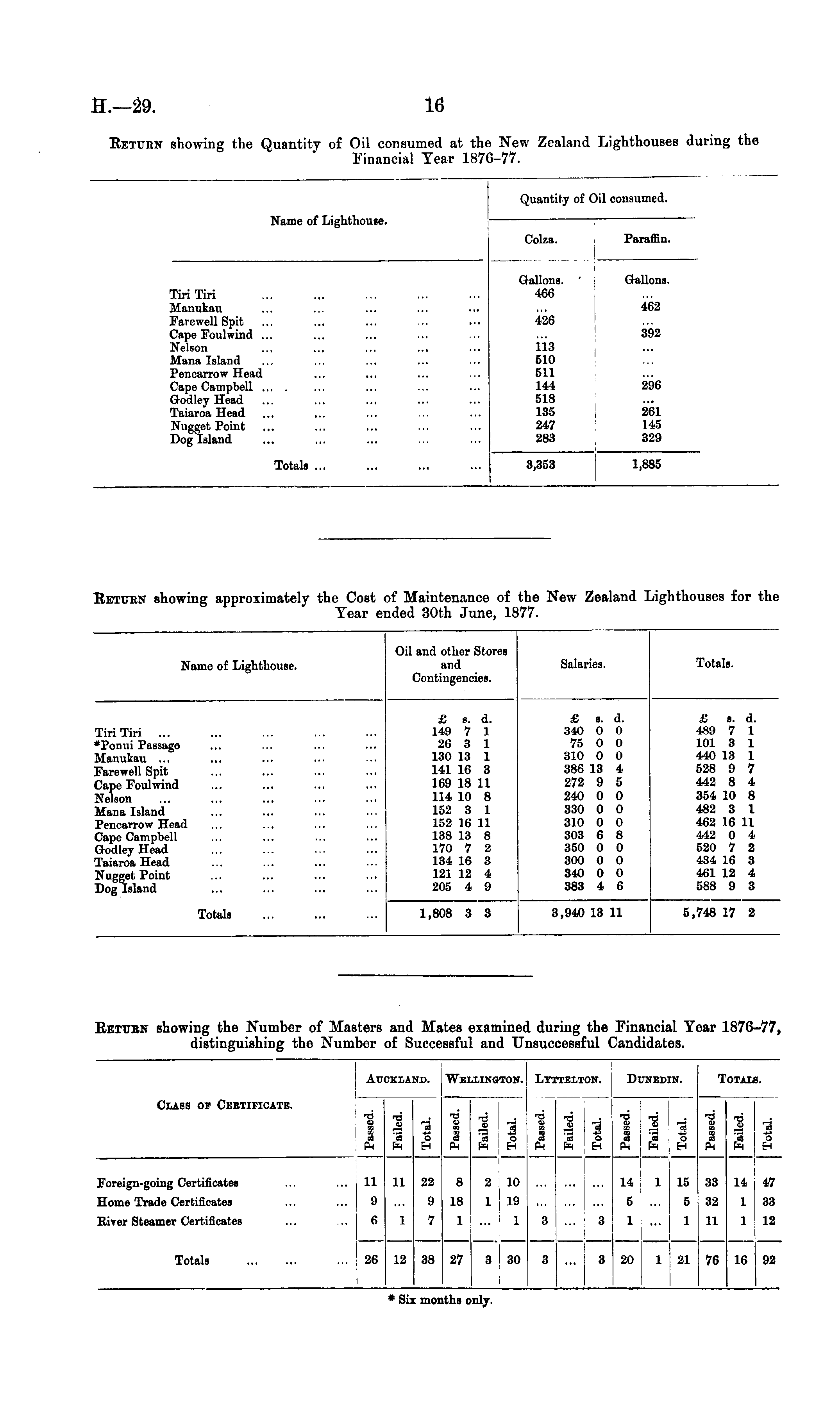 RETURN showing the Quantity of Oil consumed at the New Zealand Lighthouses during the Financial Year 1876-77.