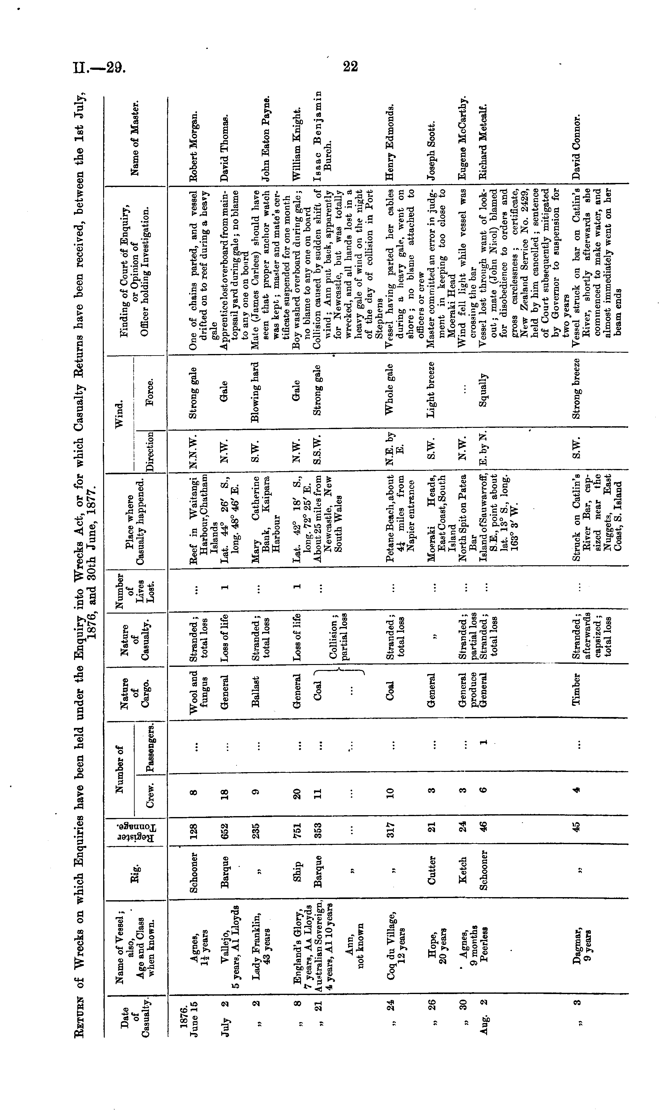 Date of Casualty. Name of Vessel; also, Age and Class when known. I a, Number of Nature Nature of Casualty. Number of Lives Lost. find. Finding of Court of Enquiry, or Opinion of Officer holding Investigation. Rig. Place where Casualty happened. — j Name of Master. Crew. Passengers. Cargo. Direction Force. 1876. June 15 Agnes, 1| years Schooner 128 8 Wool and fungus Stranded; total loss Reef in Wailangi Harbour,Chatham Islands Lat. 44° 26' S., long. 48° 46' E. N.N.W. Strong gale One of chains parted, and vessel drifted on to reef during a heavy gale Apprenticelost overboard from maintopsail yard during gale; no blame to any one on bourd Mate (James Carlees) should have seen that proper anchor watch was kept.; master and mate's certificate suspended for one month Boy washed overboard during gale; no blame to any one on board Collision caused by sudden shift of wind ; Ann put back, apparently for Newcastle, but was totally wrecked, and all hands lost in a heavy gale of wind on the night of the day of collision in Port Stephens Vessel having parted her cables during a heavy gale, went on shore ; no blame attached to officers or crew Master committed an error in judgment in keeping too close to Moeraki Head Wind fell light while vessel was crossing the bar Vessel lost through want of lookout ; mate (John Nicol) blamed for disobedience to orders and gross carelessness ; certificate, New Zealand Service No. 2429, held by him cancelled ; sentence of Court subsequently mitigated by Governor to suspension for two years Vessel struck on bar on Catlin's River, shortly afterwards she commenced to make water, and almost immediately went on her beam ends Robert Morgan. July 2 Vallejo, 5 years, Al Lloyds Barque 652 18 General Loss of life 1 N.W. Gale David Thomas. „ 2 Lady Franklin, 43 years ii 235 9 Ballast Stranded; total loss Mary Catherine Bank, Kaipara Harbour S.W. Blowing hard John Eaton Payne. „ 8 England's Glory, 7 years, Aa Lloyds Australian Sovereign, 4 years, Al 10 years Ship 20 General Loss of life 1 Lat. 42° 18' S., long. 72° 25' E. About 25 miles from Newcastle, New South Wales N.W. Gale William Knight. 751 „ 21 Barque 353 11 Coal - Collision ; partial loss s.s.w. Strong gale Isaac Benjamii Buroh. Ann, not known Coq du Village, 12 years 10 Coal Stranded ; total loss Petane Beach, about 4i miles from Napier entrance Whole gale Henry Edmonds. „ 24 317 N.E. by E. „ 26 Hope, 20 years Cutter 21 3 General ii Moeraki Heads, EastCoast, South Island North Spit on Patea Bar Island of Sau wan-off, S.E., point about lat. 13° S., long. 163° 3' W. S.W. Light breeze Joseph Scott. ,. 30 * Agnes, 9 months Peerless Ketch 24 3 General produce General Stranded ; partial loss Stranded; total loss N.W. Eugene McCarthy. Aug. 2 Schooner 46 6 1 E.byN. Squally Richard Metcalf. Dagmar, 9 years Struck on Catlin's River Bar, capsized near the Nuggets, East Coast, S. Island David Connor. il 3 M 45 Timber Stranded; afterwards capBi'zed ; total loss S.W. Strong breeze