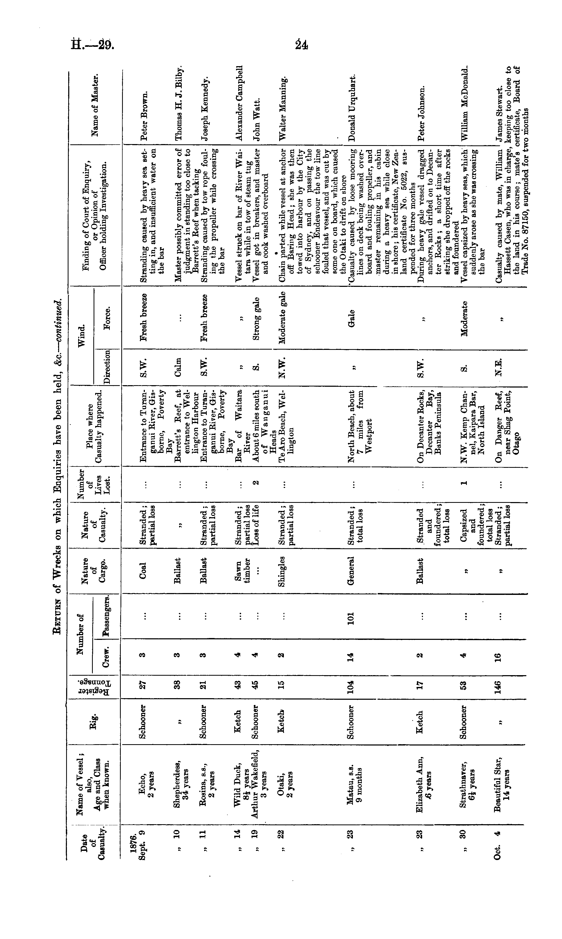 iETDRN Oi reel :s on wl ncl inquiries ave ieen , &c. — continued. Date of Casualty. Name of Vessel; also, Age and Class when known. Rig. ■as Number of Nature Nature of Casualty. Number of Lives Lost. Place where Casually happened. Wind. Finding of Court of Enquiry, or Opinion of Officer holding Investigation. Name of Master. Crew. Passengers. Cargo. Direction Force. 1876. lept. 9 Echo, 2 years Schooner 27 3 Coal Stranded; partial loss Entrance to Turanganui River, Gisbornc, Poverty Bay Barrett's Reef, at entrance to Wellington Harbour Entrance to Turanganui River, Gisborne, Poverty Bay Bar of Waitara River About 6 miles south of Wanganui Heads TeAro Beach, Wellington S.W. Fresh breeze Stranding caused by heavy sea set- Peter Brown. ting in, and insufficient water on the bar ,. 10 Shepherdess, 34 years 11 38 a Ballast ii Calm Master possibly committed error of Thomas H. J. Bilby. judgment in standing too close to Barrett's Reef when tacking Stranding caused by tow rope foul- Joseph Kennedy. ing the propeller while crossing the bar „ H Rosina, s.s., 2 years Schooner 21 3 Ballast Stranded ; partial loss S.W. Fresh breeze Wild Duck, 8J years Arthur Wakefield, 3 years Ketch 4 Sawn timber Stranded; partial loss Loss of life II ii Vessel struck on bar of River Wai- Alexander Campbell tara while in tow of steam tug Vessel got in breakers, and master John Watt. and cook washed overboard „ 14 13 „ 19 Schooner 45 4 2 S. Strong gale „ 22 Otaki, 2 years Ketch 15 2 Shingles Stranded; partial loss N.W. Moderate gale Chain parted while vessel at anchor Walter Manning, off Baring Head; she was then towed into harbour by the City of Sydney, and on passing the schooner Endeavour the tow line fouled that vessel, and was cut by some one on board, which caused the Otaki to drift on shore 'Casualty caused by loose mooring Donald Urquhart. lines on deck being washed overboard and fouling propeller, and master remaining in his cabin during a heavy sea while close in shore; his certificate, New Zealand certificate No. 5022, suspended for three months During heavy gale vessel dragged Peter Johnson, anchors, and drifted on to Decanter Rocks ; a short time after striking she dropped off the rocks and foundered Vessel capsized by heavy seas, which William McDonald. suddenly arose as she was crossing the bar „ 23 Matau, s.s. 9 months Schooner 104 14 101 General Stranded ; total loss North Beach, about 7 miles from Westport ii Gale „ 23 Elizabeth Ann, ,6 years Ketch 17 Ballast Stranded and foundered; total loss On Decanter Rocks, Decanter Bay, Banks Peninsula S.W. „ 30 Strathnaver, 6J years Schooner 53 4 n Capsized and foundered; total loss Stranded ; partial loss 1 N.W. Kemp Channel, Kaipara Bar, North Island S. Moderate Beautiful Star, 14 years ii 16 ii On Danger Reef, near Shag Point, Otago N.E. ii Casualty caused by mate, William ' James Stewart. Hassett Casen, who was in charge, keeping too close to the land in his course; mate's certificate, Board of Trade No. 87150, suspended for two months Oct. 4 146