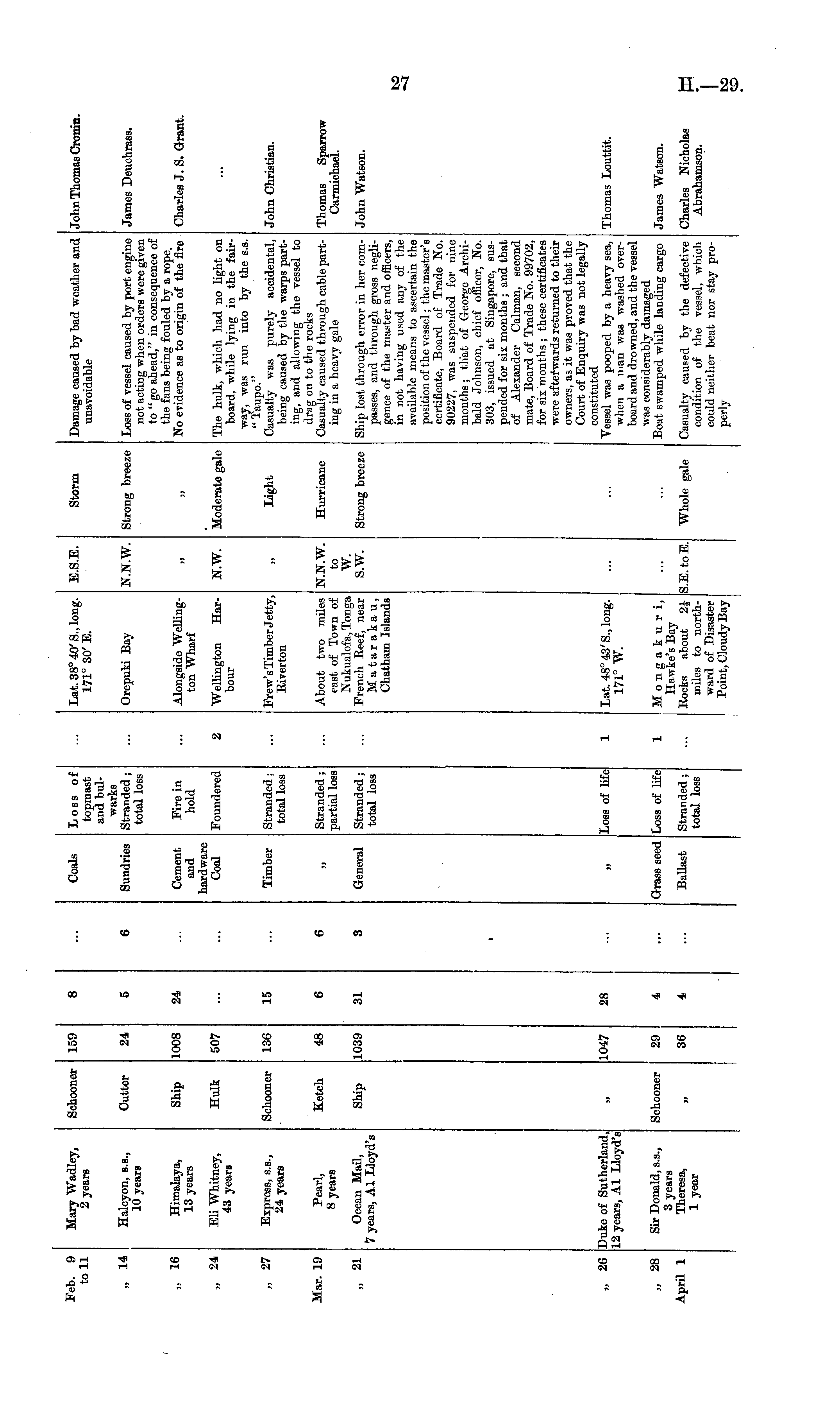 Feb. 9 toll Mary Wadley, 2 years Schooner 159 8 Coals Loss of topmast and bulwarks Stranded ; total loss Lat. 38° 40' S., long. 171° 30' E. E.S.E. Storm Damage caused by bad weather and unavoidable John Thomas Cronin „ 14 Halcyon, s.s., 10 years Cutter 5 6 Sundries Orepuki Bay N.N.W. Strong breeze Loss of vessel caused by port engine not acting when orders were given to " go ahead," in consequence of the fans being fouled by a rope. No evidence as to origin of the fire James Deuchrass. 24 „ 16 Himalaya, 13 years Ship 1008 24 Cement and hardware Coal Fire in hold Alongside Wellington Wharf ii Charles J. S. Grant ii „ 24 Eli Whitney, 43 years Hulk 507 Foundered 2 Wellington Harbour N.W. Moderate gale The hulk, which had no light on board, while lying in the fairway, was run into by the s.s. " Taupo." Casualty was purely accidental, being caused by the warps parting, and allowing the vessel to drag on to the rocks Casualty caused through cable parting in a heavy gale „ 27 Express, s.s., 24 years Schooner 15 Timber Stranded; total loss Frew's Timber Jetty, Riverton Light John Christian. 136 Mar. 19 Pearl, 8 years Ketch 48 6 6 ii Stranded ; partial loss About two miles east of Town of Nukualofa, Tonga French Reef, near Matarakau, Chatham Islands N.N.W. to W. S.W. Hurricane Thomas Sparrow Carmichael. ., 21 Ocean Mail, 7 years, Al Lloyd's Ship 1039 31 3 General Stranded; total loss Strong breeze Ship lost through error in her compasses, and through gross negligence of the master and officers, in not having used any of the available means to ascertain the position of the vessel; the master's certificate, Board of Trade No. 90227, was suspended for nine months; that of George Archibald Johnson, chief officer, No. 303, issued at Singapore, suspended for six months ; and that of Alexander Caiman, second mate, Board of Trade No. 99702, for six months ; these certificates were afterwards returned to their owners, as it was proved that the Court of Enquiry was not legally constituted Vessel was pooped by a heavy sea, when a man was washed overboard and drowned, and the vessel was considerably damaged Boat swamped while landing cargo John Watson. „ 26 Duke of Sutherland, 12 years, Al Lloyd's 1047 28 Loss of life I 1 Lat. 48° 43' S., long. 171° W. Thomas Louttit. ii ii I •■* „ 28 Sir Donald, s.s., 3 years Theresa, 1 year Schooner 4 Grass seed Loss of life 1 Mongakuri, Hawke's Bay Rocks about 2J miles to northward of Disaster Point, Cloudy Bay ... James Watson. 29 April 1 ii 36 4 Ballast Stranded ; total loss S.E. to E. Whole gale Casualty caused by the defective condition of the vessel, which could neither heat nor stay properly Charles Nicholas Abrahamson.