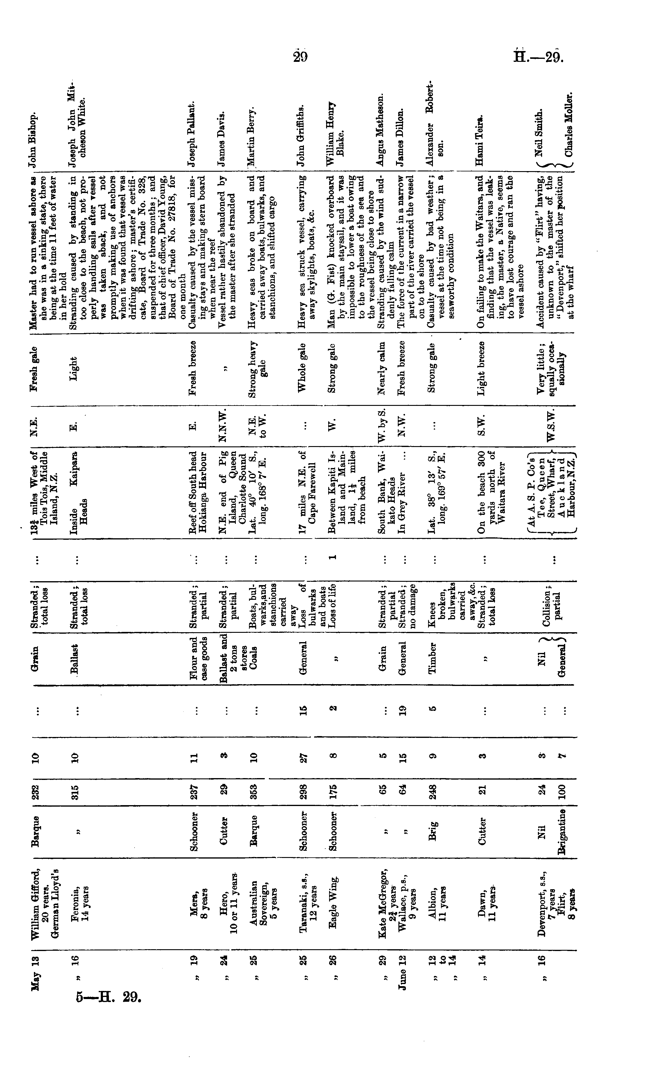 May 13 William Gifford, 20 vears. German Lloyd's Barque 232 10 Grain Stranded; total loss 13| miles West of Tois Tois, Middle Island, N.Z. N.E. Fresh gale Master had to run vessel ashore as she was in a sinking state, there being at the time 11 feet of water in her hold Stranding caused by standing in too close to the beach, not properly handling sails after vessel was taken aback, and not promptly making use of anchors when it was found that vessel was drifting ashore; master's certificate, Board of Trade No. 328, suspended for three months ; and that of chief officer, David Young, Board of Trade No. 27818, for one month Casualty caused by the vessel missing stays and making stern board when near the reef Vessel rather hastily abandoned by the master after she stranded John Bishop. Or » I6 Feronia, 14 years ii 10 Ballast Stranded; total loss Inside Kaipara Heads E. Light Joseph John Mitcheson White. 315 to CO „ 19 Joseph Pallant. Mera, 8 years Schooner 237 11 Flour and case goods Stranded ; partial Reef off South head Hokianga Harbour E. Fresh breeze „ 24 Hero, 10 or 11 years Cutter 29 3 Ballast and 2 tons stores Coals Stranded; partial N.E. end of Pig Island, Queen Charlotte Sound Lat. 40° 10' S., long. 168° 7' E. N.N.W. James Davis. „ 25 Australian Sovereign, 5 years Barque 353 10 Boats, bulwarks, and stanchions carried away Loss of bulwarks and boats Loss of life N.E. to W. Strong heavy gale Heavy seas broke on board and carried away boats, bulwarks, and stanchions, and shifted cargo Martin Berry. „ 25 Taranaki, s.s., 12 years Schooner 15 General 17 miles N.E. of Cape Farewell Whole gale Heavy sea struck vessel, carrying away skylights, boats, &c. John Griffiths. 298 27 „ 26 Eagle Wing. Schooner 175 8 2 ii 1 Between Kapiti Island and Mainland, li miles from beach w. Strong gale Man (G. Fist) knocked overboard by the main staysail, and it was impossible to lower a boat owing to the roughness of the sea and the vessel being close to shore Stranding caused by the wind suddenly falling calm The force of the current in a narrow part of the river carried the vessel on to the shore Casualty caused by bad weather; vessel at the time not being in a seaworthy condition William Henry Blake. „ 29 Kate McGregor, 2| years Wallace, p.s., 9 years 65 5 Grain Stranded; partial Stranded; no damage South Bank, Waikato Heads In Grey River W. by S. Nearly calm Angus Matheson. June 12 ii 64 15 19 General N.W. Fresh breeze James Dillon. ,. 12 to „ 14 Albion, 11 years Brig 248 9 5 Timber Knees broken, bulwarks carried away, &c. Stranded; total loss Lat. 38° 13' S., long. 169° 57' E. Strong gale Alexander Robert son. „ 14 Dawn, 11 years Cutter 21 ii On the beach 300 yards north of Waitara River S.W. Light breeze On failing to make the Waitara, and finding that the vessel was leaking, the master, a Native, seems to have lost courage and ran the vessel ashore Hami Teira. „ 16 Devenport, s.s., 7 years Flirt, 8 years Nil 24 3 Nil -\ General j Collision; partial f At A. S. P. Co's^j Tee, Queen -} Street, Wharf, JAuckland Harbour, N.Z.J Very little; squally occasionally Accident caused by "Flirt" having, unknown to the master of the " Devenport," shifted her position at the wharf f Neil Smith. C Charles Moller. W.S.W. Brigantine 100 7