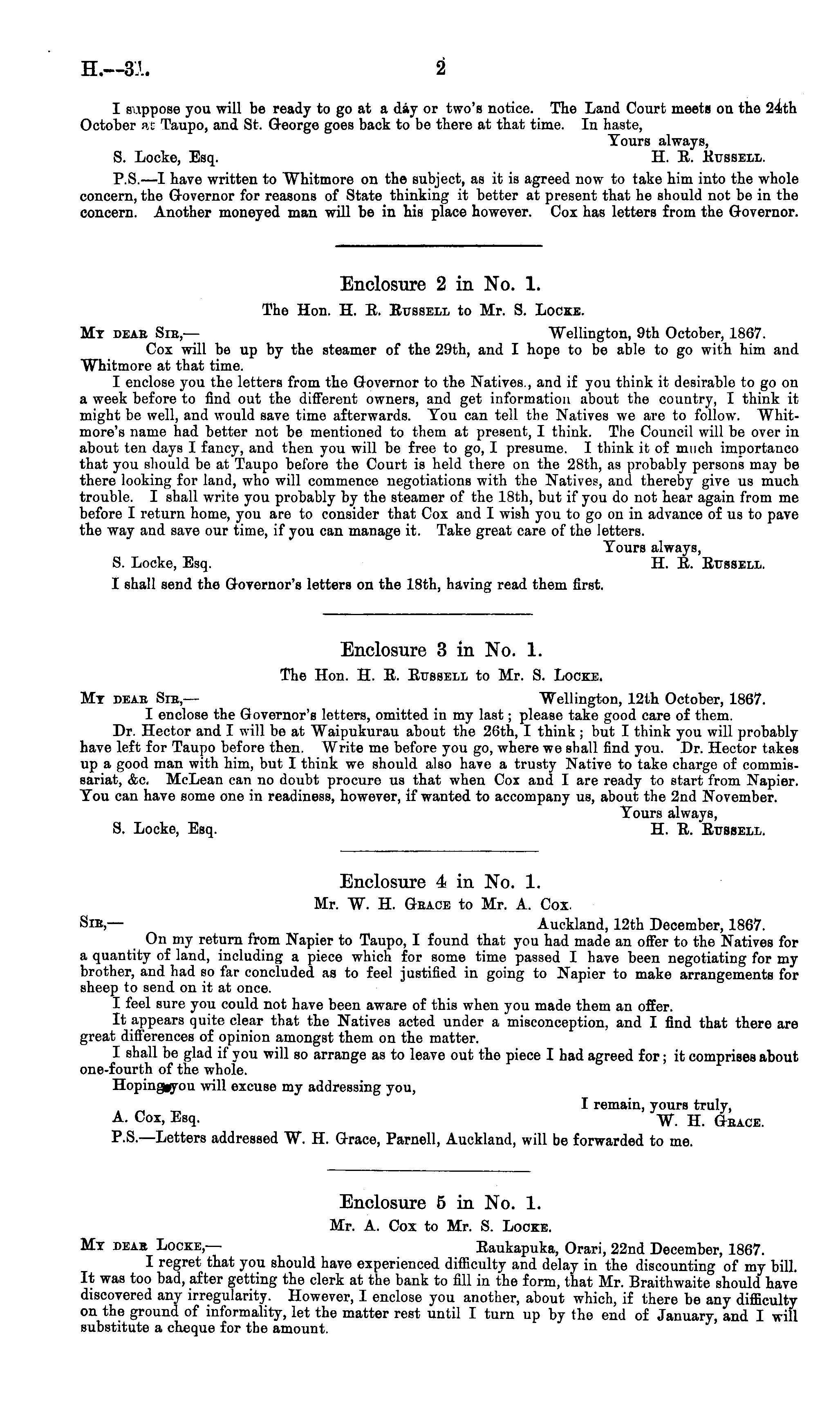 Enclosure 2 in No. 1. The Hon. H. R. Russell to Mr. S. Locke. Mt deae Sic, — Wellington, 9th October, 1867. Cox will be up by the steamer of the 29th, and I hope to be able to go with him and Whitmore at that time. I enclose you the letters from the Governor to the Natives., and if you think it desirable to go on a week before to find out the different owners, and get information about the country, I think it might be well, and would save time afterwards. Tou can tell the Natives we are to follow. Whitmore's name had better not be mentioned to them at present, I think. The Council will be over in about ten days I fancy, and then you will be free to go, I presume. I think it of much importanco that you should be at Taupo before the Court is held there on the 28th, as probably persons may be there looking for land, who will commence negotiations with the Natives, and thereby give us much trouble. I shall write you probably by the steamer of the 18th, but if you do not hear again from me before I return home, you are to consider that Cox and I wish you to go on in advance of us to pave the way and save our time, if you can manage it. Take great care of the letters. Tours always, S. Locke, Esq. H. R. Russell. I shall send the Governor's letters on the 18th, having read them first.