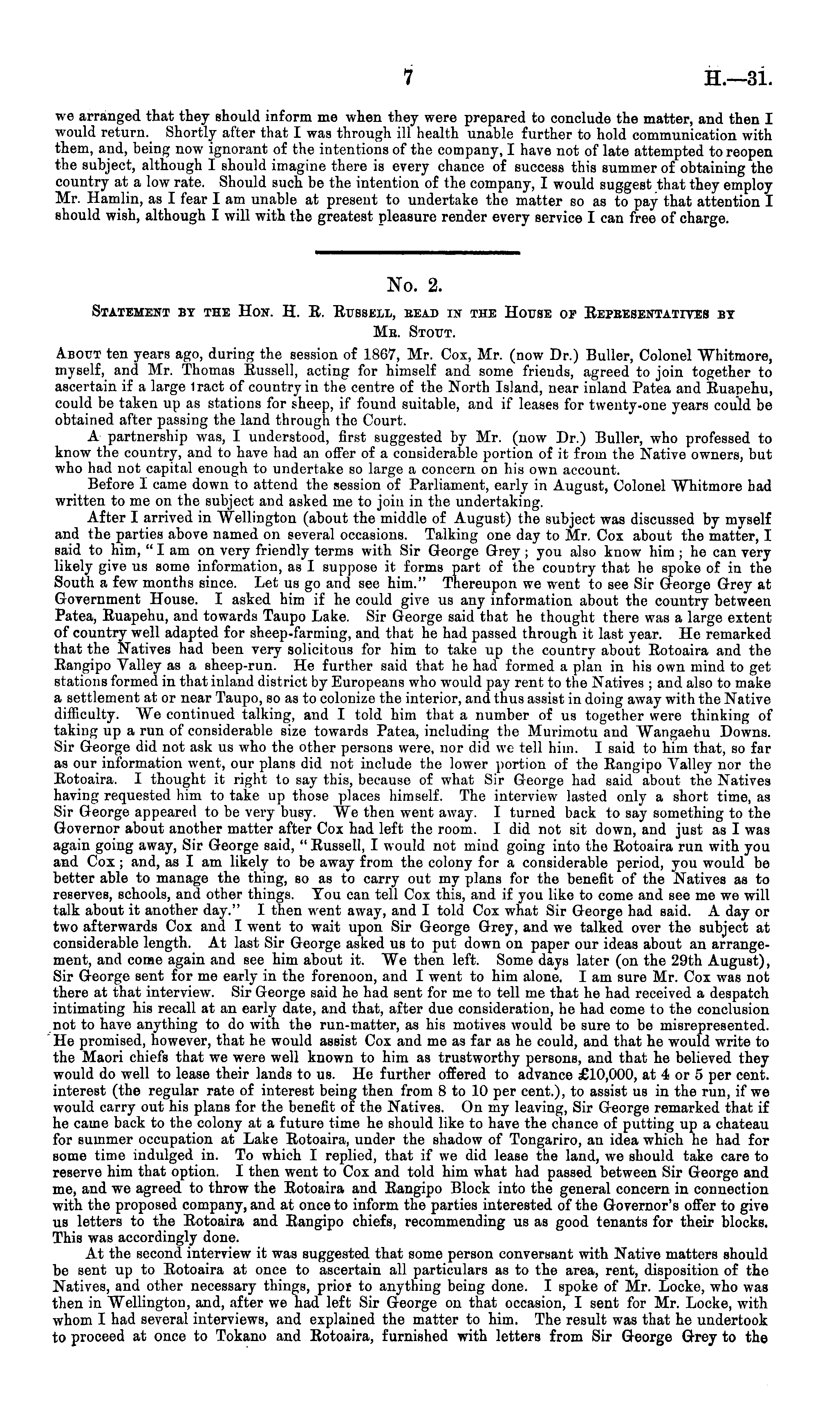 No. 2. Statement by the Hon. H. E. Russell, bead in the House of Representatives by Mb. Stout. About ten years ago, during the session of 1867, Mr. Cox, Mr. (now Dr.) Butter, Colonel "Whitmore, myself, and Mr. Thomas Russell, acting for himself and some friends, agreed to join together to ascertain if a large Iract of country in the centre of the North Island, near inland Patea and Ruapehu, could be taken up as stations for sheep, if found suitable, and if leases for twenty-one years could be obtained after passing the land through the Court. A partnership was, I understood, first suggested by Mr. (now Dr.) Buller, who professed to know the country, and to have had an offer of a considerable portion of it from the Native owners, but who had not capital enough to undertake so large a concern on his own account. Before I came down to attend the session of Parliament, early in August, Colonel Whitmore had written to me on the subject and asked me to join in the undertaking. After I arrived in Wellington (about the middle of August) the subject was discussed by myself and the parties above named on several occasions. Talking one day to Mr. Cox about the matter, I said to him, "I am on very friendly terms with Sir George Grey ; you also know him; he can very likely give us some information, as I suppose it forms part of the country that he spoke of in the South a few months since. Let us go and see him." Thereupon we went to see Sir George Grey at Government House. I asked him if he could give us any information about the country between Patea, Ruapehu, and towards Taupo Lake. Sir George said that he thought there was a large extent of country well adapted for sheep-farming, and that he had passed through it last year. He remarked that the Natives had been very solicitous for him to take up the country about Rotoaira and the Rangipo Valley as a sheep-run. He further said that he had formed a plan in his own mind to get stations formed in that inland district by Europeans who would pay rent to the Natives ; and also to make a settlement at or near Taupo, so as to colonize the interior, and thus assist in doing away with the Native difficulty. We continued talking, and I told him that a number of us together were thinking of taking up a run of considerable size towards Patea, including the Murimotu and Wangaehu Downs. Sir George did not ask us who the other persons were, nor did we tell him. I said to him that, so far as our information went, our plans did not include the lower portion of the Rangipo Valley nor the Rotoaira. I thought it right to say this, because of what Sir George had said about the Natives having requested him to take up those places himself. The interview lasted only a short time, as Sir George appeared to be very busy. We then went away. I turned back to say something to the Governor about another matter after Cox had left the room. I did not sit down, and just as I was again going away, Sir George said, " Russell, I would not mind going into the Rotoaira run with you and Cox ; and, as I am likely to be away from the colony for a considerable period, you would be better able to manage the thing, so as to carry out my plans for the benefit of the Natives as to reserves, schools, and other things. Tou can tell Cox this, and if you like to come and see me we will talk about it another day." I then went away, and I told Cox what Sir George had said. A day or two afterwards Cox and I went to wait upon Sir George Grey, and we talked over the subject at considerable length. At last Sir George asked us to put down on paper our ideas about an arrangement, and come again and see him about it. We then left. Some days later (on the 29th August), Sir George sent for me early in the forenoon, and I went to him alone. lam sure Mr. Cox was not there at that interview. Sir George said he had sent for me to tell me that he had received a despatch intimating his recall at an early date, and that, after due consideration, he had come to the conclusion not to have anything to do with the run-matter, as his motives would be sure to be misrepresented. He promised, however, that he would assist Cox and me as far as he could, and that he would write to the Maori chiefs that we were well known to him as trustworthy persons, and that he believed they would do well to lease their lands to us. He further offered to advance £10,000, at 4or 5 per cent, interest (the regular rate of interest being then from 8 to 10 per cent.), to assist us in the run, if we would carry out his plans for the benefit of the Natives. On my leaving, Sir George remarked that if he came back to the colony at a future time he should like to have the chance of putting up a chateau for summer occupation at Lake Rotoaira, under the shadow of Tongariro, an idea which he had for some time indulged in. To which I replied, that if we did lease the land, we should take care to reserve him that option. I then went to Cox and told him what had passed between Sir George and me, and we agreed to throw the Rotoaira and Rangipo Block into the general concern in connection with the proposed company, and at once to inform the parties interested of the Governor's offer to give us letters to the Rotoaira and Rangipo chiefs, recommending us as good tenants for their blocks. This was accordingly done. At the second interview it was suggested that some person conversant with Native matters should be sent up to Rotoaira at once to ascertain all particulars as to the area, rent, disposition of the Natives, and other necessary things, prior to anything being done. I spoke of Mr. Locke, who was then in Wellington, and, after we had left Sir George on that occasion, I sent for Mr. Locke, with whom I had several interviews, and explained the matter to him. The result was that he undertook to proceed at once to Tokano and Rotoaira, furnished with letters from Sir George Grey to the