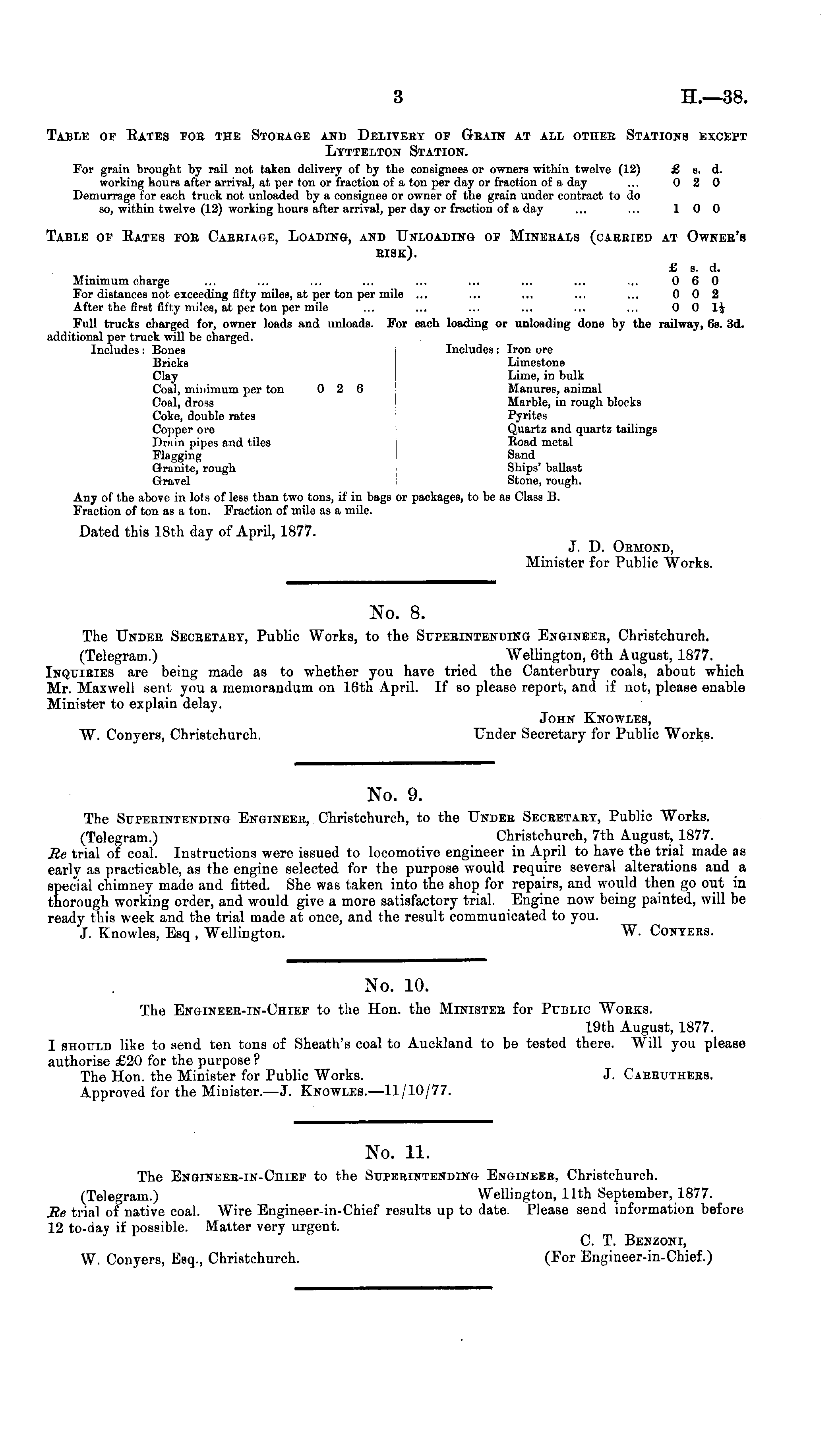 No. 11. The Engineer-in-Chief to the Superintending Engineer, Christehurch. (Telegram.) Wellington, Hth September, 1877. Be trial of native coal. Wire Engineer-in-Chief results up to date. Please send information before 12 to-day if possible. Matter very urgent. C. T. Benzoni, W. Couyers, Esq., Christchurch. (For Engineer-in-Chief.)