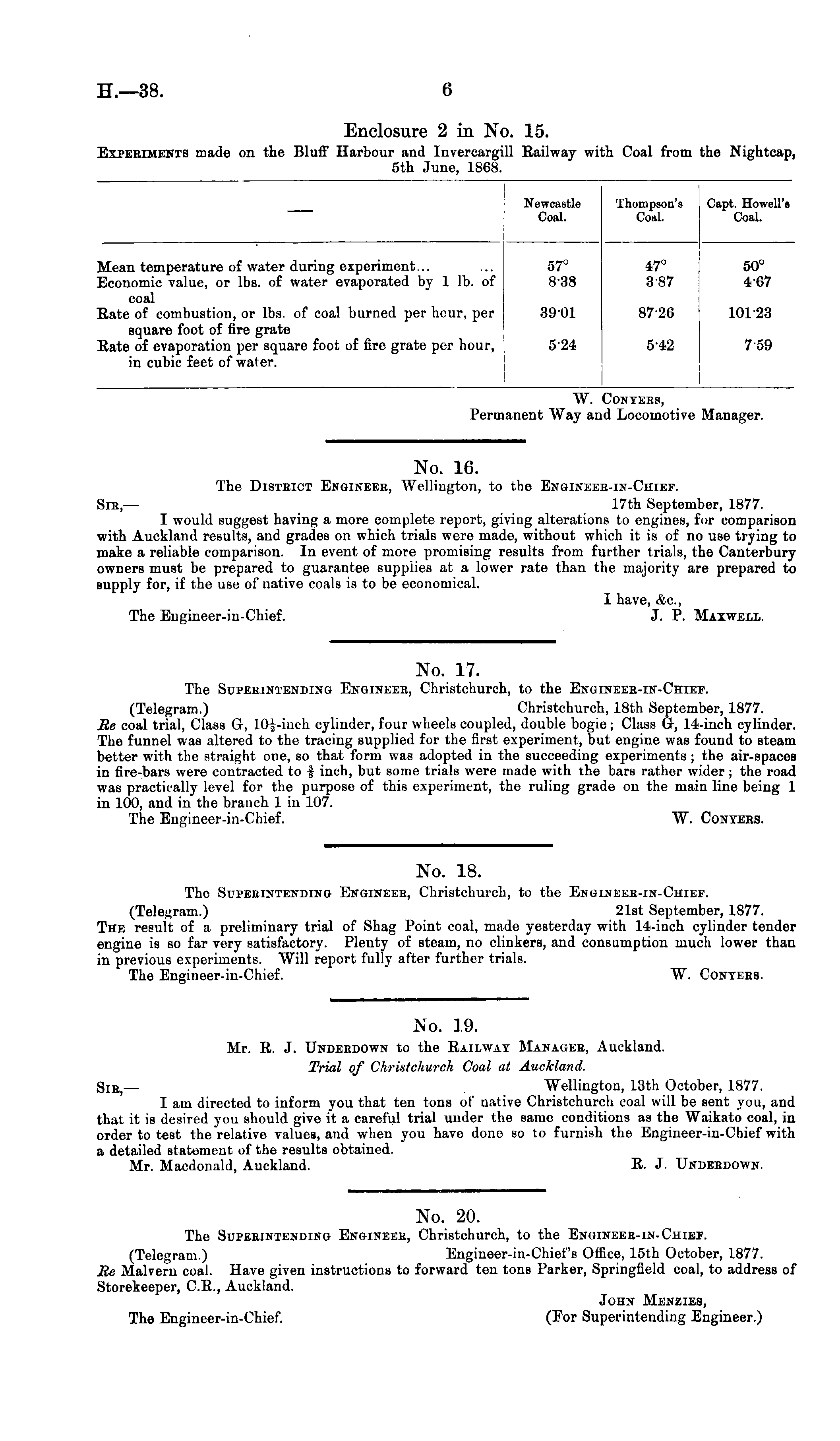 No. 16. The District Engineer, "Wellington, to the Engineer-in-Chief. Sir,— 17th September, 1877. I would suggest having a more complete report, giving alterations to engines, for comparison with Auckland results, and grades on which trials were made, without which it is of no use trying to make a reliable comparison. In event of more promising results from further trials, the Canterbury owners must be prepared to guarantee supplies at a lower rate than the majority are prepared to supply for, if the use of native coals is to be economical. I have, &c, The Engineer-in-Chief. J. P. Maxwell.