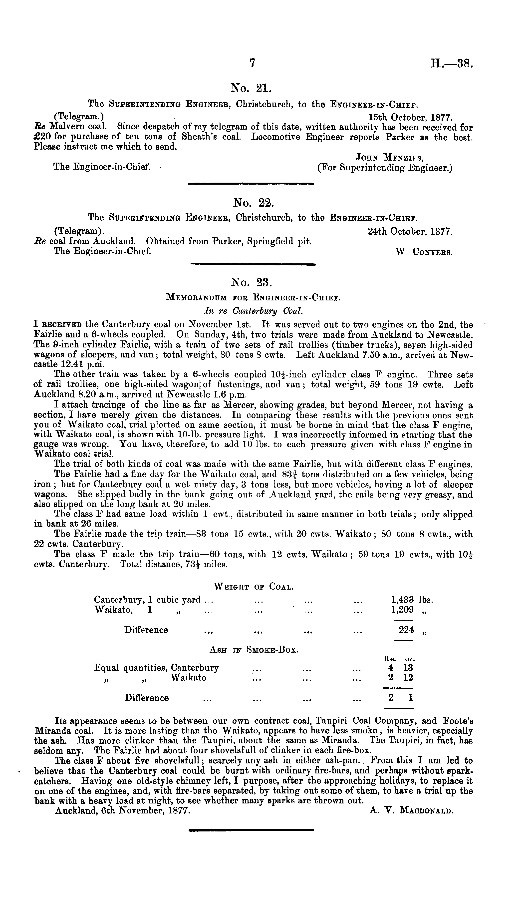 No. 21. The Superintending Engineeb, Christchurch, to the Engineeb-in-Chief. (Telegram.) 15th October, 1877. Me Malvern coal. Since despatch of my telegram of this date, written authority has been received for £20 for purchase of ten tons of Sheath's coal. Locomotive Engineer reports Parker as the best. Please instruct me which to send. John Menzies, The Engineer-in-Chief. (For Superintending Engineer.)