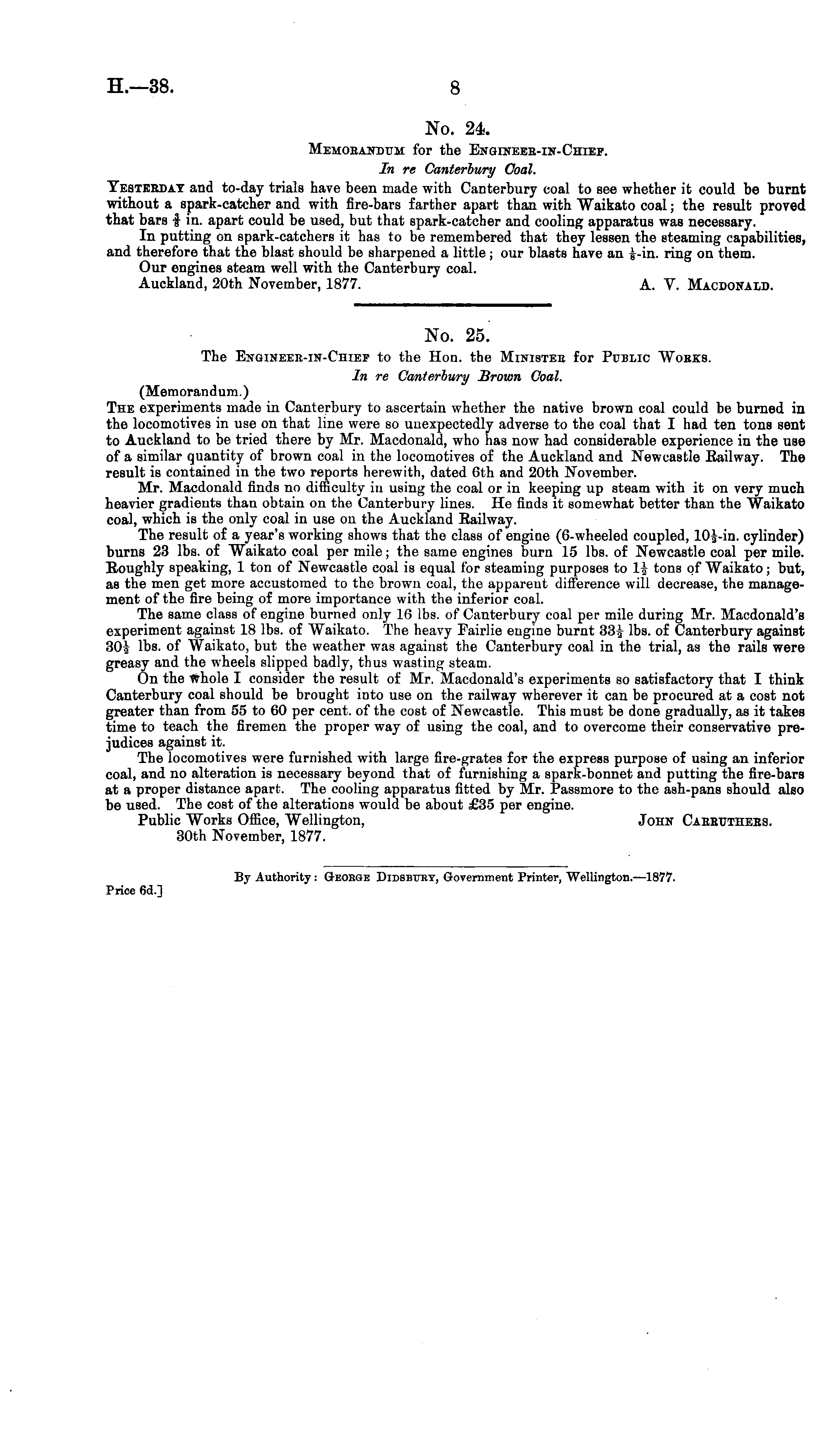 No. 24. Memobandtjm for the Engineeb-in-Chiep. In re Canterbury Coal. Yestebdat and to-day trials have been made with Canterbury coal to see whether it could be burnt without a spark-catcher and with fire-bars farther apart than with Waikato coal; the result proved that bars -| in. apart could be used, but that spark-catcher and cooling apparatus was necessary. In putting on spark-catchers it has to be remembered that they lessen the steaming capabilities, and therefore that the blast should be sharpened a little; our blasts have an -y-in. ring on them. Our engines steam well with the Canterbury coal. Auckland, 20th November, 1877. A. V. Macdonald.