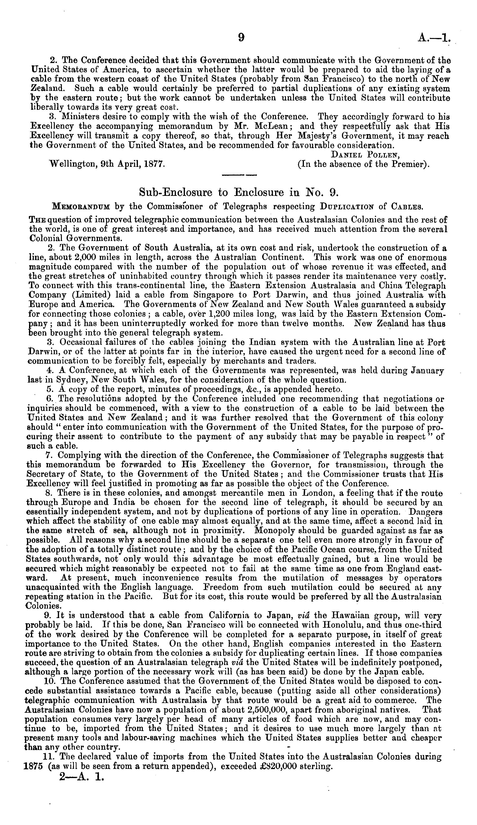 2. The Conference decided that this Government should communicate with the Government of the United States of America, to ascertain whether the latter would be prepared to aid the laying of a cable from the western coast of the United States (probably from San Francisco) to the north of New Zealand. Such a cable would certainly be preferred to partial duplications of any existing system by the eastern route; but the work cannot be undertaken unless the United States will contribute liberally towards its very great cost. 3. Ministers desire to comply with the wish of the Conference. They accordingly forward to his Excellency the accompanying memorandum by Mr. McLean; and they respectfully ask that His Excellency will transmit a copy thereof, so that, through Her Majesty's Government, it may reach the Government of the United States, and be recommended for favourable consideration. Daniel Pollen, Wellington, 9th April, 1877. (In the absence of the Premier). Sub-Enclosure to Enclosure in -No. 9. Memorandum by the Commissioner of Telegraphs respecting Duplication of Cables. The question of improved telegraphic communication between the Australasian Colonies and the rest of the world, is one of great interest and importance, and has received much attention from the several Colonial Governments. 2. The Government of South Australia, at its own cost and risk, undertook the construction of a line, about 2,000 miles in length, across the Australian Continent. This work was one of enormous magnitude compared with the number of the population out of whose revenue it was effected, and the great stretches of uninhabited country through which it passes render its maintenance very costly. To connect with this trans-continental line, the Eastern Extension Australasia aud China Telegraph Company (Limited) laid a cable from Singapore to Port Darwin, and thus joined Australia with Europe and America. The Governments of New Zealand and New South Wales guaranteed a subsidy for connecting those colonies ; a cable, over 1,200 miles long, was laid by the Eastern Extension Company ; and it has been uninterruptedly worked for more than twelve months. New Zealand has thus been brought into the general telegraph system. 3. Occasional failures of the cables joining the Indian system with the Australian line at Port Darwin, or of the latter at points far in the interior, have caused the urgent need for a second line of communication to be forcibly felt, especially by merchants and traders. 4. A Conference, at which each of the Governments was represented, was held during January last in Sydney, New South Wales, for the consideration of the whole question. 5. A copy of the report, minutes of proceedings, &c, is appended hereto. 6. The resolutions adopted by the Conference included one recommending that negotiations or inquiries should be commenced, with a view to the construction of a cable to be laid between the United States and New Zealand ; and it was further resolved that the Government of this colony should " enter into communication with the Government of the United States, for the purpose of procuring their assent to contribute to the payment of any subsidy that may be payable in respect " of such a cable. 7. Complying with the direction of the Conference, the Commissioner of Telegraphs suggests that this memorandum be forwarded to His Excellency the Governor, for transmission, through the Secretary of State, to the Government of the United States ; and the Commissioner trusts that His Excellency will feel justified in promoting as far as possible the object of the Conference. 8. There is in these colonies, and amongst mercantile men in London, a feeling that if the route through Europe and India be chosen for the second line of telegraph, it should be secured by an essentially independent system, and not by duplications of portions of any line in operation. Dangers which affect the stability of one cable may almost equally, and at the same time, affect a second laid in the same stretch of sea, although not in proximity. Monopoly should be guarded against as far as possible. All reasons why a second line should be a separate one tell even more strongly in favour of the adoption of a totally distinct route ; and by the choice of the Pacific Ocean course, from the United States southwards, not only would this advantage be most effectually gained, but a line would be secured which might reasonably be expected not to fail at the same time as one from England eastward. At present, much inconvenience results from the mutilation of messages by operators unacquainted with the English language. Freedom from such mutilation could be secured at any repeating station iv the Pacific. But for its cost, this route would be preferred by all the Australasian Colonies. 9. It is understood that a cable from California to Japan, via the Hawaiian group, will very probably be laid. If this be done, San Francisco will be connected with Honolulu, and thus one-third of the work desired by the Conference will be completed for a separate purpose, in itself of great importance to the United States. On the other hand, English companies interested in the Eastern route are striving to obtain from the colonies a subsidy for duplicating certain lines. If those companies succeed, the question of an Australasian telegraph via the United States will be indefinitely postponed, although a large portion of the necessary work will (as has been said) be done by the Japan cable. 10. The Conference assumed that the Government of the United States would be disposed to concede substantial assistance towards a Pacific cable, because (putting aside all other considerations) telegraphic communication with Australasia by that route would be a great aid to commerce. The Australasian Colonies have now a population of about 2,500,000, apart from aboriginal natives. That population consumes very largely per head of many articles of food which are now, and may co