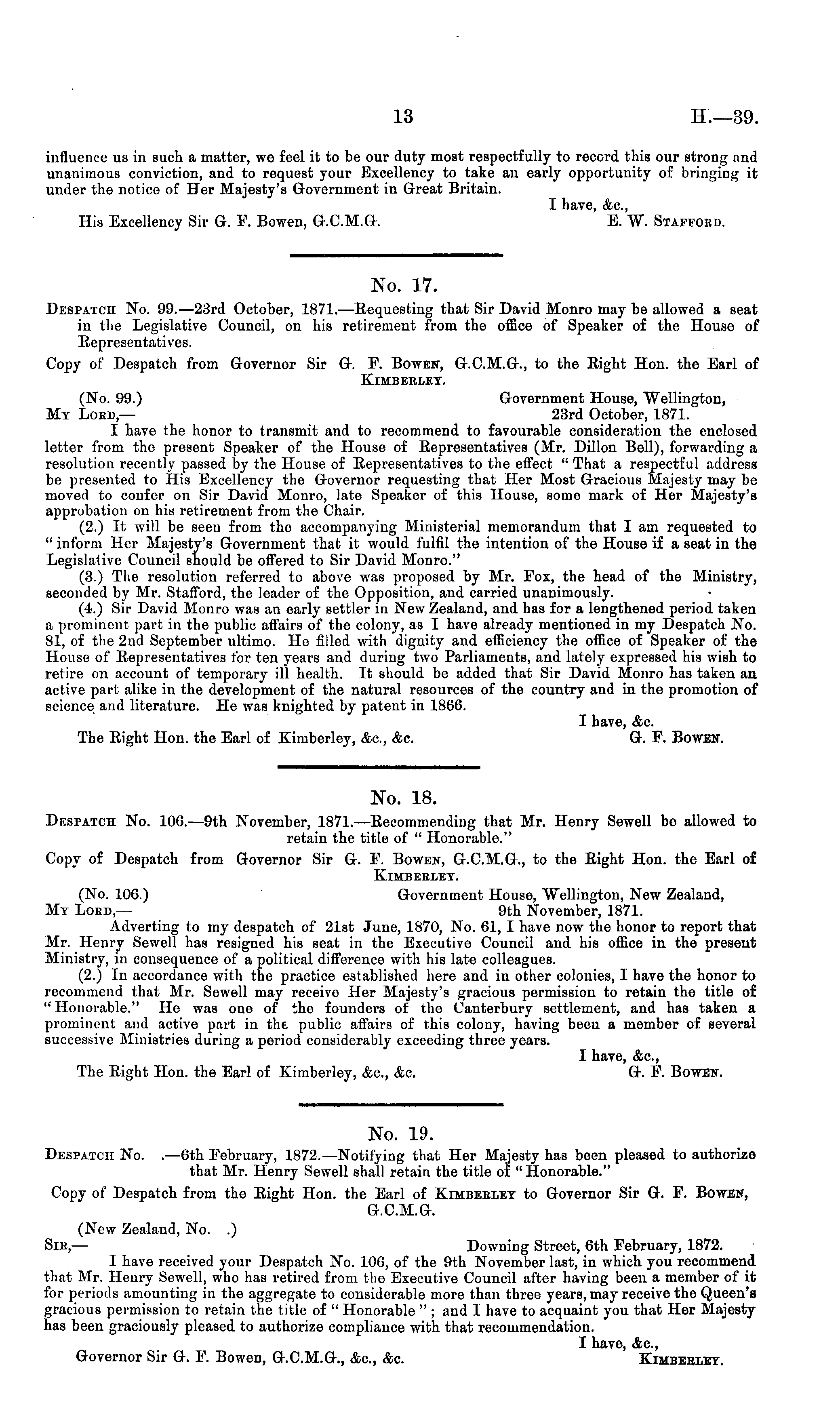 No. 19. Despatch No. . —6th February, 1872.—Notifying that Her Majesty has been pleased to authorize that Mr. Henry Sewell shall retain the title of " Honorable." Copy of Despatch from the Right Hon. the Earl of Kimberley to Governor Sir G. F. Bowen, G.C.AI.G. (New Zealand, No. .) Sir, — Downing Street, 6th February, 1872. I have received your Despatch No. 106, of the 9th November last, in which you recommend that A[r. Henry Sewell, who has retired from the Executive Council after having been a member of it for periods amounting in the aggregate to considerable more than three years, may receive the Queen's gracious permission to retain the title of " Honorable " ; and I have to acquaint you that Her Alajesty has been graciously pleased to authorize compliance with that recommendation. I have, &c, Governor Sir G. F. Bowen, G.C.M.G., &c, &c. Kimberley.
