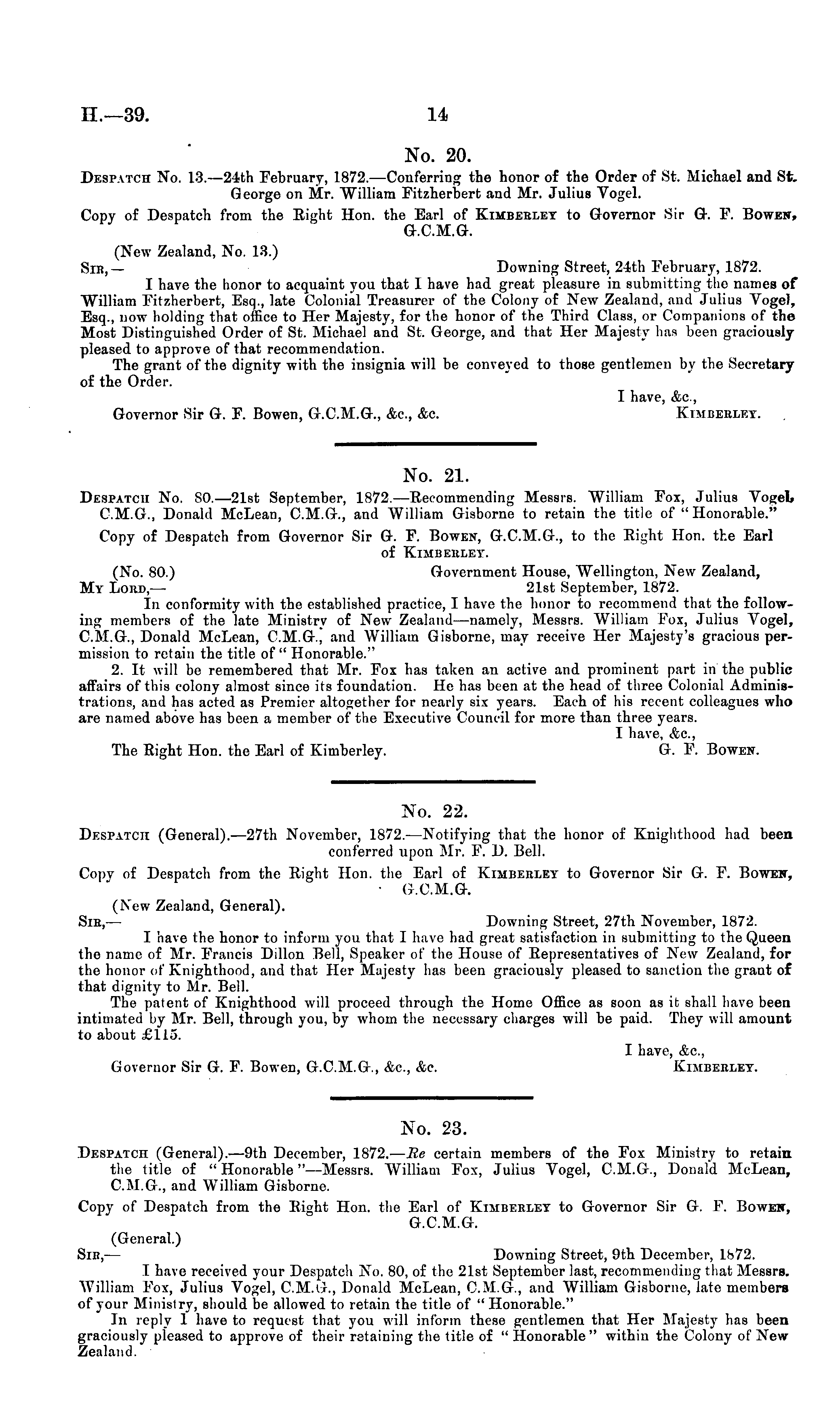 No. 20. Despatch No. 13. —24th February, 1872. —Conferring the honor of the Order of St. Alichael and St. George on Mr. William Fitzherbert and Mr. Julius Vogel. Copy of Despatch from the Right Hon. the Earl of Kimberley to Governor Sir G. F. Bowen, G.C.M.G. (New Zealand, No. 13.) Sir,— Downing Street, 24th February, 1872. I have the honor to acquaint you that I have had great pleasure in submitting the names of William Fitzherbert, Esq., late Colonial Treasurer of the Colony of New Zealand, and Julius Vogel, Esq., now holding that office to Her Majesty, for the honor of the Third Class, or Companions of the Most Distinguished Order of St. Alichael and St. George, and that Her Alajesty has been graciously pleased to approve of that recommendation. The grant of the dignity with the insignia will be conveyed to those gentlemen by the Secretary of the Order. I have, Ac., Governor Sir G. F. Bowen, G.C.AI.G., &c, Ac. Kimberley.