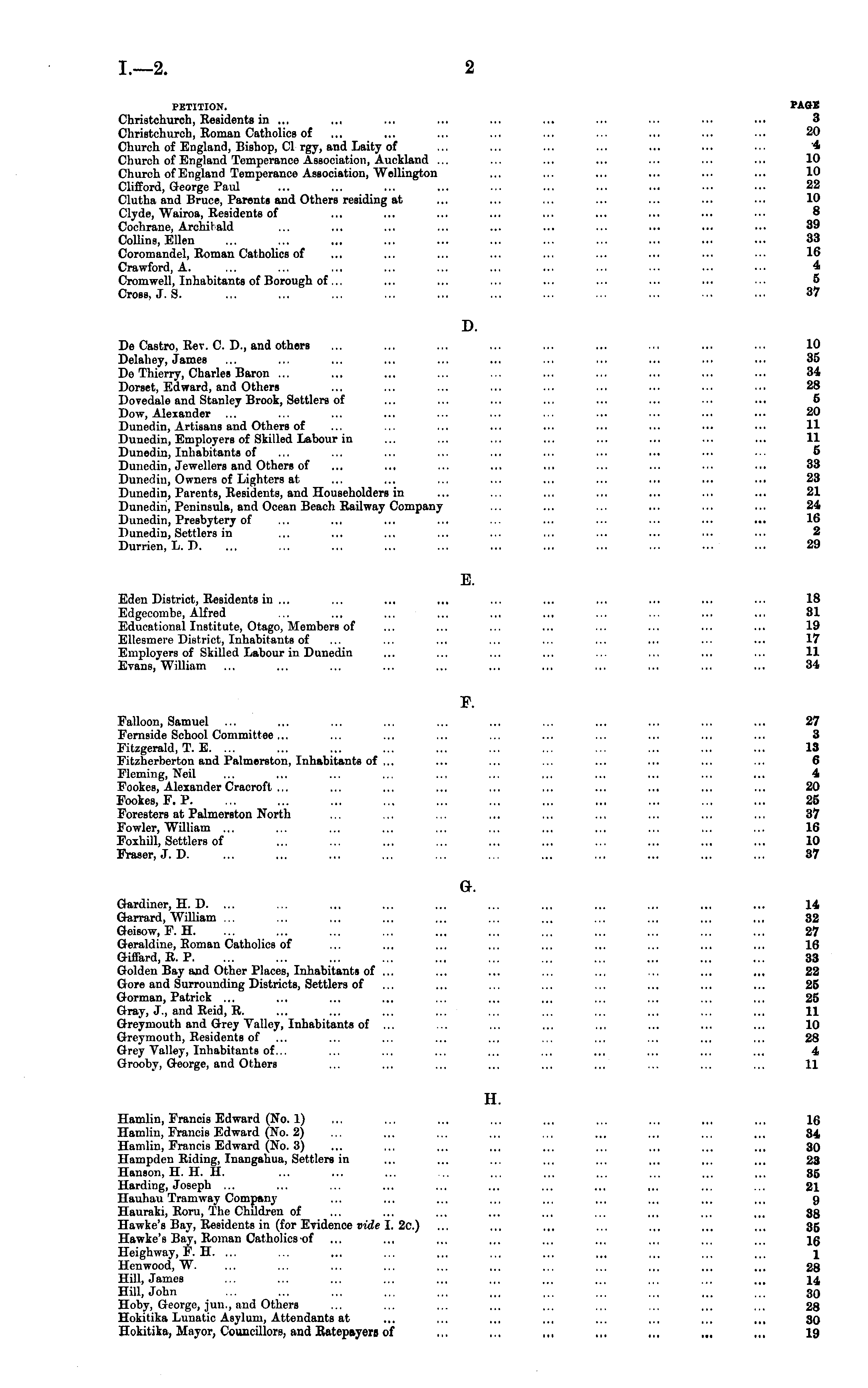 PETITION. PAGE Christchurch, Residents in ... ... ... ... ... ... ... ... ... ... 3 Christchurch, Roman Catholics of ... ... ... ... ... ... ... ... ... 20 Church of England, Bishop, CI rgy, and Laity of ... ... ... ... ... ... ... 4 Church of England Temperance Association, Auckland ... ... ... ... ... ... ... 10 Church of England Temperance Association, Wellington ... ... ... ... ... ... 10 Clifford, George Paul ... ... _ ... ... ... ... ... ... ... ... 22 Clutha and Bruce, Parents and Others residing at ... ... ... ... ... ... ... 10 Clyde, Wairoa, Residents of ... ... ... ... ... ... ... ... ■■• 8 Cochrane, Architald ... ... ... ... ... ... ... ... ... ••• 39 Collins, Ellen ... ... ... ... ... ... ... ... ... ... ... 33 Coromandel, Roman Catholics of ... ... ... ... ... ... ... ... ■■■ 16 Crawford, A. ... ... ... ... ... ... ... ... ... ... •■■ 4 Cromwell, Inhabitants of Borough 0f... ... ... ... ... ... ... ... •■• 5 Cross, J. S. ... ... ... ... ... ... ... .. ... ••. ••• 37 D. De Castro, Rev. C. D., and others ... ... ... ... ... ... ... ... ... 10 Delahey, James ... ... ... ... ... ... ... ... ... ... ... 35 De Thierry, Charles Baron ... ... ... ... ... ... ... ... ... ... 34 Dorset, Edward, and Others ... ... ... ... ... ... ... ... ... 28 Dovedale and Stanley Brook, Settlers of ... ... ... ... ... ... ... ... 6 Dow, Alexander ... ... ... ... ... ... ... ... ... ... ... 20 Dunedin, Artisans and Others of ... ... ... ... ... ... ... ... ... 11 Dunedin, Employers of Skilled Labour in ... ... ... ... ... ... ... ... 11 Dunedin, Inhabitants of ... ... ... ... ... ... ... ... ••• •■■ 5 Dunedin, Jewellers and Others of ... ... ... ... ... ... ... ... ... 33 Dunedin, Owners of Lighters at ... ... ... ... ... ... ... ... ... 23 Dunedin, Parents, Residents, and Householders in ... ... ... ... ... ... ... 21 Dunedin, Peninsula, and Ocean Beach Railway Company ... ... ... ... ... ... 24 Dunedin, Presbytery of ... ... ... ... ... ... ... ... ... ... 16 Dunedin, Settlers in ... ... .... ... ... ... ... ... ... ... 2 Durrien, L. D. ... ... ... ... ... ... ... ... ... •••' ... 29 E. Eden District, Residents in ... ... ... ... ... ... ... ... ... ... 18 Edgecombe, Alfred ... ... ... ... ... ... ... ... ... ... 31 Educational Institute, Otago, Members of ... ... ... ... ... ... ... ... 19 Ellesmere District, Inhabitants of ... ... ... ... ... ... ... ... ... 17 Employers of Skilled Labour in Dunedin ... ... ... ... ... ... ... ... 11 Evans, William ... ... ... ... ... ... ... ... ... ... ... 34 F. Falloon, Samuel ... ... ... ... ... ... ... ... ... ... ... 27 Fernside School Committee... ... ... ... ... ... ... ... ... ... 3 Fitzgerald, T. E. ... ... ... ... ... ... ... ... ... ... ... 13 Fitzherberton and Palmerston, Inhabitants of ... ... ... ... ... ... ... ... 6 Fleming, Neil ... ... ... ... ... ... ... ... ... ... ... 4 Fookes, Alexander Cracroft ... ... ... ... ... ~. ... ... ... ... 20 Fookes, F. P 25 Foresters at Palmerston North ... ... ... ... ... ... ... ... ... 37 Fowler, William ... ... ... ... ... ... ... ... ... ... ... 16 Foxhill, Settlers of ... ... ... ... ... ... ... ... ... . ... 10 Fraser, J. D. ... ... ... ... ... ... ... ... ... ... ... 37 G. Gardiner, H. D. ... ... ... ... ... ... ... ... ... ... ... 14 Garrard, W Tilliam ... ... ... ... ... ... ... ... ... ... ... 32 Geisow, F. H. ... ... ... ... ... ... ... ... ... ... ... 27 Geraldine, Koman Catholics of ... ... ... ... ... ... ... ... ... 16 Giffard, R. P. ... ... ... ... ... ... ... ... ... ... ... 33 Golden Bay and Other Places, Inhabitants of ... ... ... ... .., ... ... ... 22 Gore and Surrounding Districts, Settlers of ... ... ... ... ... ... ... ... 25 Gorman, Patrick ... ... ... ... ... ... ... ... ... ... ... 25 Gray, J., and Reid, R. ... ... ... ... ... ... ... ... ... ... 11 Greymouth and Grey Valley, Inhabitants of ... ... ... ... ... ... ... ... 10 Greymouth, Residents of ... ... ... ... ... ... ... ... ... ... 28 Grey Valley, Inhabitants 0f... ... ... ... ... ... ... ... ... ... 4 Grooby, George, and Others ... ... ... ... ... ... ... ... ... 11 H. Hamlin, Francis Edward (No. 1) ... ... ... ... ... ... ... ... ... 16 Hamlin, Francis Edward (No. 2) ... ... ... ... ... ... ... ... ... 34 Hamlin, Francis Edward (No. 3) ... ... ... ... ... ... ... ... ... 30 Hampden Riding, Inangahua, Settlers in ... ... ... ... ... ... ... ... 23 Hanson, H. H. H. ... ... ... ... ... ... ... ... ... 35 Harding, Joseph ... ... ... ... ... ... ... ... ~. ... ... 21 Hauhau Tramway Company ... ... ... ~, ... ... ... ... ... 9 Hauraki, Roru, The Children of ... ... ... ... ... ... ... ... ... 38 Hawke's Bay, Residents in (for Evidence vide I. 2c.) ... ... ... ... ... ... ... 35 Hawke's Bay, Roman Catholics of ... ... ... ... ... ... ... ... ... 16 Heighway, F. H. ... ... ... ... ... ... ... ... ~. ... ... X Henwood, W. ... ... ... ... ... ... ... ... ... ... ... 28 Hill, James ... ... ... ... ... ... ... ... ... ... ... 14 Hill, John ... ... ... ... ... ... ... ... ... ... ... 30 Hoby, George, jun., and Others ... ... ... ... ... ... ... ... ... 28 Hokitika Lunatic Asylum, Attendants at ... ... ... ... ... ... ... ... 30 Hokitika, Mayor, Councillors, and Ratepayers of ~. ... ~, ~. ~, ... ~, 19