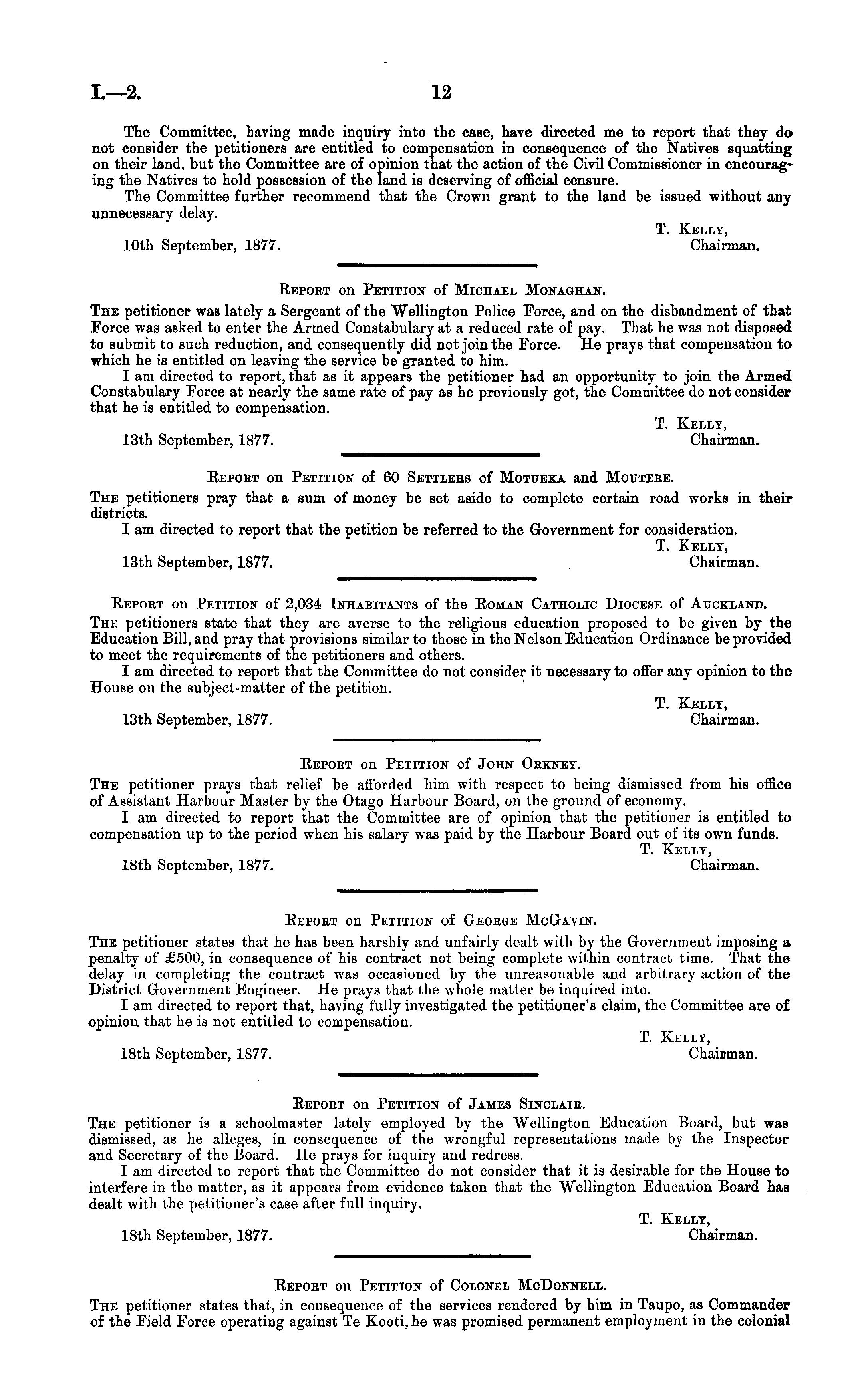 Repoet on Petition of Michael Monaghan. The petitioner was lately a Sergeant of the Wellington Police Force, and on the disbandment of that Force was asked to enter the Armed Constabulary at a reduced rate of pay. That he was not disposed to submit to such reduction, and consequently did not join the Force. He prays that compensation to which he is entitled on leaving the service be granted to him. I am directed to report, that as it appears the petitioner had an opportunity to join the Armed Constabulary Force at nearly the same rate of pay as he previously got, the Committee do not consider that he is entitled to compensation. T. Kelly, 13th September, 1877. Chairman.