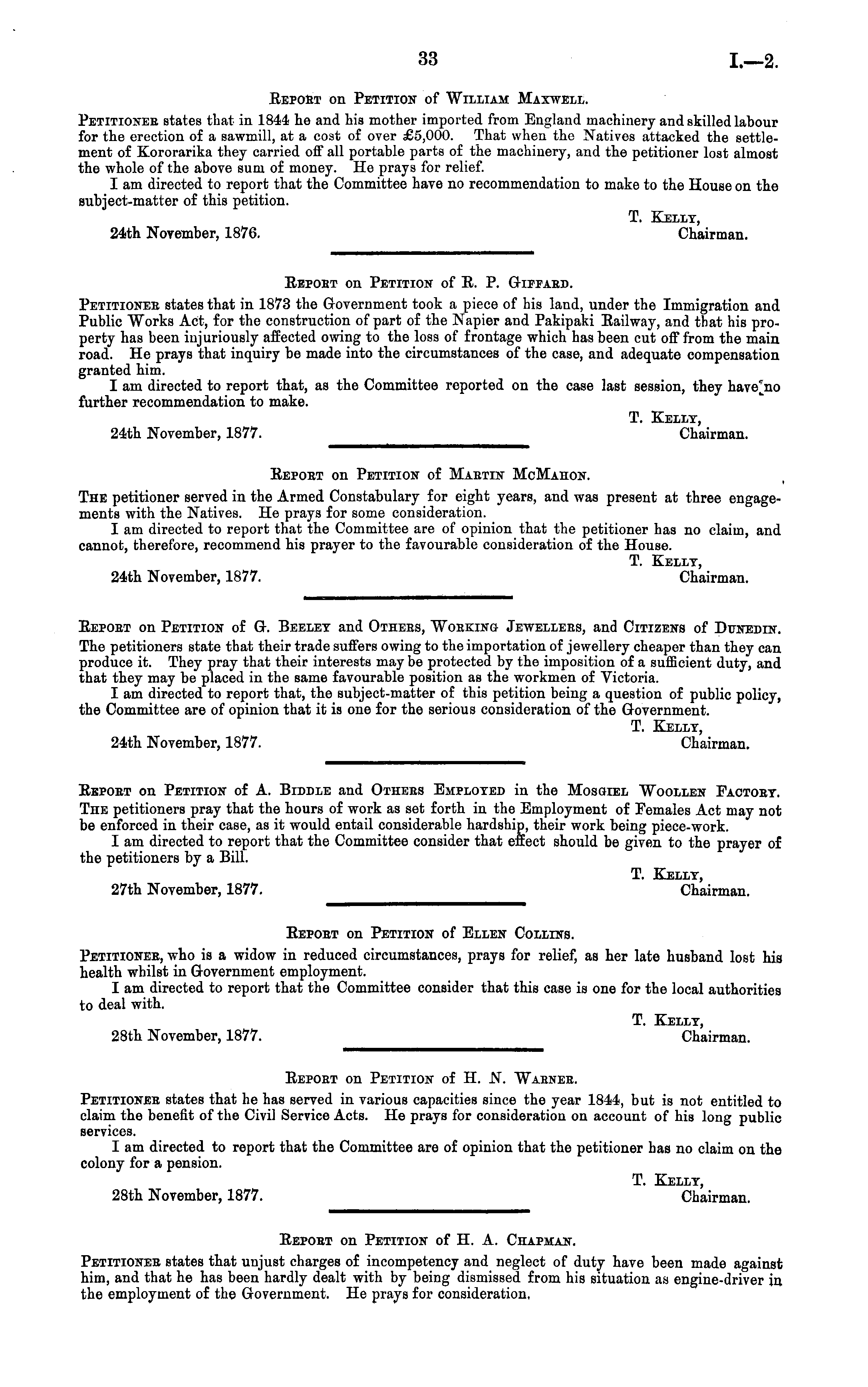 Repoet on Petition of William Maxwell. Petitionee states that in 1844 he and his mother imported from England machinery and skilled labour for the erection of a sawmill, at a cost of over £5,000. That when the Natives attacked the settlement of Kororarika they carried off all portable parts of the machinery, and the petitioner lost almost the whole of the above sum of money. He prays for relief. I am directed to report that the Committee have no recommendation to make to the House on the subject-matter of this petition. T. Kelly, 24th November, 1876. Chairman.