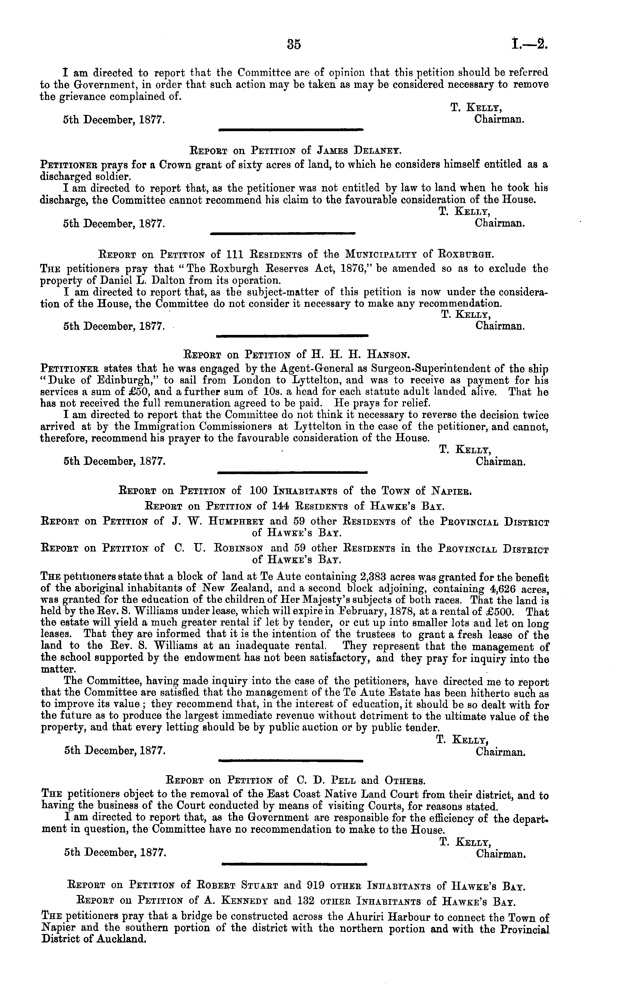 Report on Petition of 100 Inhabitants of the Town of Napier. Repoet on Petition of 144 Residents of Hawke's Bay. Repoet on Petition of J. W. Humpheey and 59 other Residents of the Pbovincial Disteict of Hawke's Bay. Repoet on Petition of C. U. Robinson and 59 other Residents in the Provincial District of Hawke's Bay. The petitioners state that a block of land at Te Aute containing 2,383 acres was granted for the benefit of the aboriginal inhabitants of New Zealand, and a second block adjoining, containing 4,626 acres, was granted for the education of the children of Her Majesty's subjects of both races. That the land is held by the Rev. S. Williams under lease, which will expire in February, 1878, at a rental of £500. That the estate will yield a much greater rental if let by tender, or cut up into smaller lots aud let on long leases. That they are informed that it is the intention of the trustees to grant a fresh lease of the land to the Rev. S. Williams at an inadequate rental. They represent that the management of the school supported by the endowment has not been satisfactory, and they pray for inquiry into the matter. The Committee, having made inquiry into the case of the petitioners, have directed me to report that the Committee are satisfied that the management of the To Aute Estate has been hitherto such as to improve its value ; they recommend that, in the interest of education, it should be so dealt with for the future as to produce the largest immediate revenue without detriment to the ultimate value of the property, and that every letting should be by public auction or by public tender. T. Kelly, sth December, 1877. Chairman.