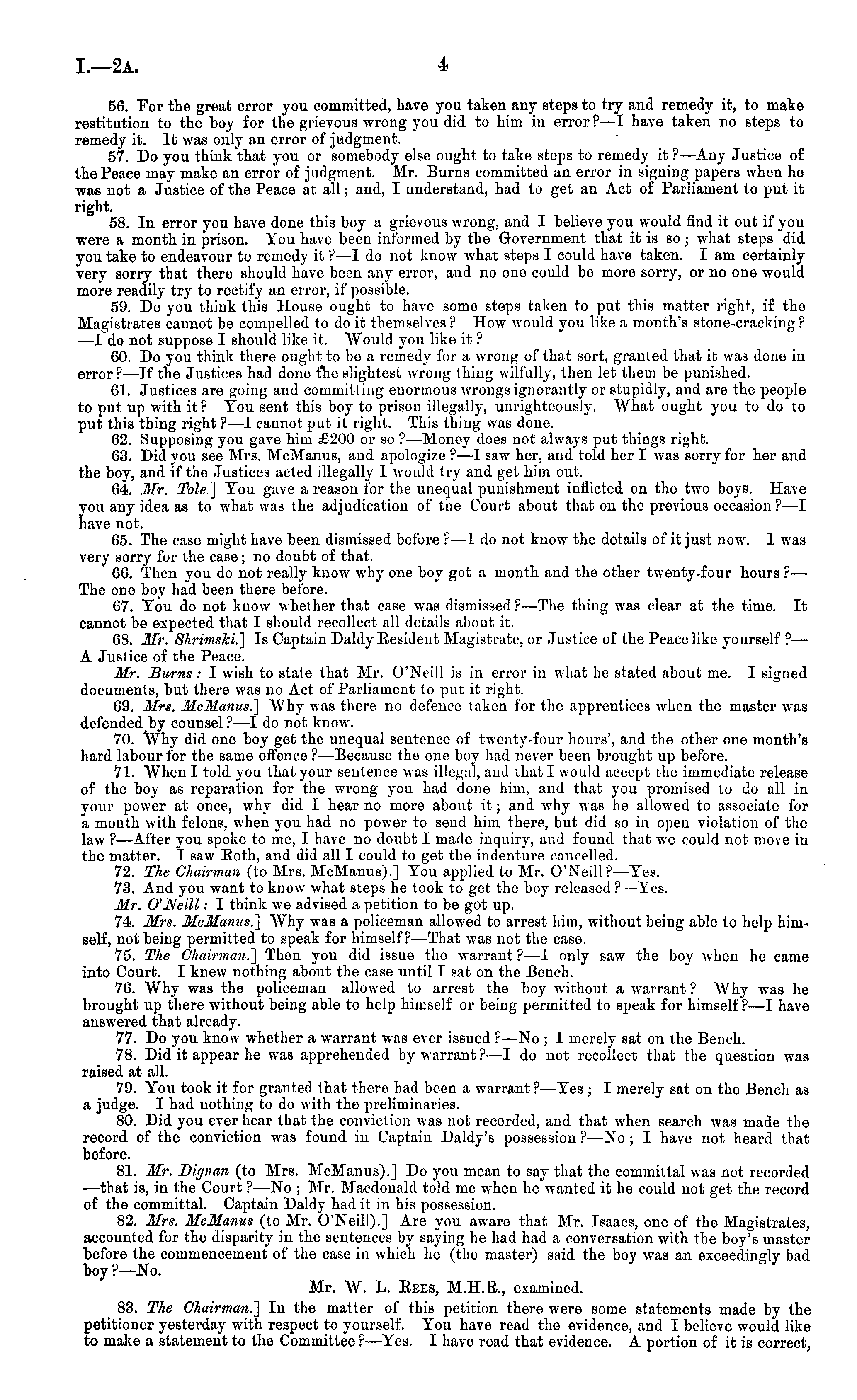 56. For the great error you committed, have you taken any steps to try and remedy it, to make restitution to the boy for the grievous wrong you did to him in error? —I have taken no steps to remedy it. It was only an error of judgment. 57. Do you think that you or somebody else ought to take steps to remedy it ? —Any Justice of the Peace may make an error of judgment. Mr. Burns committed an error in signing papers when he was not a Justice of the Peace at all; and, I understand, had to get an Act of Parliament to put it right. 58. In error you have done this boy a grievous wrong, and I believe you would find it out if you were a month in prison. You have been informed by the Government that it is so ; what steps did you take to endeavour to remedy it ?—I do not know what steps I could have taken. I am certainly very sorry that there should have been any error, and no one could be more sorry, or no one would more readily try to rectify an error, if possible. 59. Do you think this House ought to have some steps taken to put this matter right, if the Magistrates cannot be compelled to doit themselves? How would you like a month's stone-cracking? —I do not suppose I should like it. Would you like it ? 60. Do you think there ought to be a remedy for a wrong of that sort, granted that it was done in error? —If the Justices had done tTie slightest wrong thing wilfully, then let them be punished. 61. Justices are going and committing enormous wrongs ignorantly or stupidly, and are the people to put up with it? You sent this boy to prison illegally, unrighteously. What ought you to do to put this thing right ? —I cannot put it right. This thing was done. 62. Supposing you gave him £200 or so ?—Money does not always put things right. 63. Did you see Mrs. McManus, and apologize ? —I saw her, and told her I was .sorry for her and the boy, and if the Justices acted illegally I would try and get him out. 64. Mr. Tole] You gave a reason for the unequal punishment inflicted on the two boys. Have you any idea as to what was the adjudication of the Court about that on the previous occasion ? —I have not. 65. The case might have been dismissed before ?—I do not know the details of it just now. I was very sorry for the case ; no doubt of that. 66. Then you do not really know why one boy got a month and the other twenty-four hours ? —■ The one boy had been there before. 07. You do not know whether that case was dismissed ?—The thing was clear at the time. It cannot be expected that I should recollect all details about it. 6S. Mr. Shrimshi."] Is Captain Daldy Resident Magistrate, or Justice of the Peace like yourself ?— A Justice of the Peace. Mr. Burns : I wish to state that Mr. O'Neill is in error in what he stated about me. I signed documents, but there was no Act of Parliament to put it right. 69. Mrs. McManus.] Why was there no defence taken for the apprentices when the master was defended by counsel ? —1 do not know. 70. Why did one boy get the unequal sentence of twenty-four hours', and the other one month's hard labour for the same offence ? —Because the one boy had never been brought up before. 71. When I told you that your sentence was illegal, and that I would accept the immediate release of the boy as reparation for the wrong you had done him, and that you promised to do all in your power at once, why did I hear no more about it; and why was he allowed to associate for a month with felons, when you had no power to send him there, but did so in. open violation of the law ?—After you spoke to me, I have no doubt I made inquiry, and found that we could not move in the matter. I saw Roth, and did all I could to get the indenture cancelled. 72. The Chairman (to Mrs. McManus).] You applied to Mr. O'Neill? —Yes. 73. And you want to know what steps he took to get the boy released ? —Yes. Mr. O'Neill: I think we advised a petition to be got up. 74. Mrs. McManus.'] Why was a policeman allowed to arrest him, without being able to help himself, not being permitted to speak for himself? —That was not the case. 75. The Chairman.'] Then you did issue the warrant ? —I only saw the boy when he came into Court. I knew nothing about the case until I sat on the Bench. 76. Why was the policeman allowed to arrest the boy without a warrant ? Why was he brought up there without being able to help himself or being permitted to speak for himself?—I have answered that already. 77. Do you know whether a warrant was ever issued ?—No ; I merely sat on the Bench. 78. Did it appear he was apprehended by warrant ?• —I do not recollect that the question was raised at all. 79. You took it for granted that there had been a warrant ?—Yes ; I merely sat on the Bench as a judge. I had nothing to do witli the preliminaries. 80. Did you ever hear that the conviction was not recorded, and that when search was made the record of the conviction was found in Captain Daldy's possession ? —No ; I have not heard that before. 81. Mr. Dignan (to Mrs. McMauus).] Do you mean to say that the committal was not recorded —that is, in the Court ? —No ; Mr. Macdonald told me when he wanted it he could not get the record of the committal. Captain Daldy had it in his possession. 82. Mrs. McManus (to Mr. O'Neill).] Are you aware that Mr. Isaacs, one of the Magistrates, accounted for the disparity in the sentences by saying he had had a conversation with the boy's master before the commencement of the case in which he (the master) said the boy was an exceedingly bad boy ?—No. Mr. W. L. Eees, M.H.E., examined. 83. The Chairman.] In the matter of this petition there were some statements made by the np+.if.innpT vpsfprrlmr wi^Vi TPnnppf ■fr> Trniivsplf Ynn linrn vpo/l -flj/i oi,-i^onr*p nnd T Ti^H^t-** *tt/mi1^ lilr^