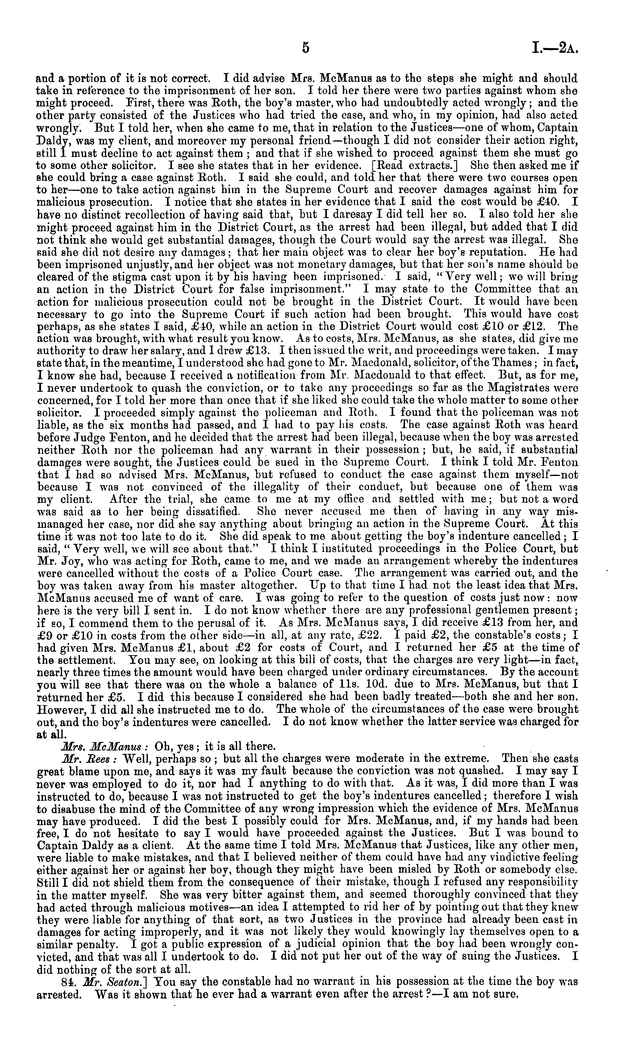 and a portion of it is not correct. I did advise Mrs. McManus as to the steps she might and should take in reference to the imprisonment of her son. I told her there were two parties against whom she might proceed. First, there was Roth, the boy's master, who had undoubtedly acted wrongly ; and the other party consisted of the Justices who had tried the case, and who, in my opinion, had also acted wrongly. But I told her, when she came to me, that in relation to the Justices —one of whom, Captain Daldy, was my client, and moreover my personal friend—though I did not consider their action right, still 1 must decline to act against them ; and that if she wished to proceed against them she must go to some other solicitor. I see she states that in her evidence. [Read extracts.] She then asked me if she could bring a case against Roth. I said she could, and told her that there were two courses open to her—one to take action against him in the Supreme Court and recover damages against him for malicious prosecution. I notice that she states in her evidence that I said the cost would be £40. I have no distinct recollection of having said that, but I daresay I did tell her so. 1 also told her she might proceed against him in the District Court, as the arrest had been illegal, but added that I did not think she would get substantial damages, though the Court would say the arrest was illegal. She said she did not desire any damages ; that her main object was to clear her boy's reputation. He had been imprisoned unjustly, and her object was not monetary damages, but that her son's name should bo cleared of the stigma cast upon it by his having been imprisoned. I said, "Very well; we will bring an action in the District Court for false imprisonment." I may state to the Committee that an action for malicious prosecution could not be brought in the District Court. It would have been necessary to go into the Supremo Court if such action had been brought. This would have cost perhaps, as she states I said, £10, while an action in the District Court would cost £10 or £L2. The action was brought, with what result you know. As to costs, Mrs. McManus, as she states, did give me authority to draw her salary, and I drew £13. I then issued the writ, and proceedings were taken. I may state that, in the meantime, I understood she had gone to Mr. Macdonald, solicitor, of the Thames ; in fact, I know she had, because I received a notification from Mr. Macdonald to that effect. But, as for me, I never undertook to quash the conviction, or to take any proceedings so far as the Magistrates were concerned, for I told her more than once that if she liked she could take the whole matter to some other solicitor. I proceeded simply against the policeman and Roth. I found that the policeman was not liable, as the six months had passed, and I had to pay his costs. The case against Roth was heard before Judge Fenton, and ho decided that the arrest had been illegal, because when the boy was arrested neither Roth nor the policeman had any warrant in their possession ; but, he said, if substantial damages were sought, the Justices could be sued in the Supreme Court. I think I told Mr. Fenton that I had so advised Mrs. McManus, but refused to conduct the case against them myself—not because I was not convinced of the illegality of their conduct, but because one of them was my client. After the trial, she came to me at my office and settled with me; but not a word was said as to her being dissatified. She never accused me then of having in any way mismanaged her case, nor did she say anything about bringing an action in the Supreme Court. At this time it was not too late to do it. She did speak to me about getting the boy's indenture cancelled ; I said, " Very well, we will see about that." I think I instituted proceedings in the Police Court, but Mr. Joy, who was acting for Roth, came to me, and we made an arrangement whereby the indentures were cancelled without the costs of a Police Court case. The arrangement was carried out, and the boy was taken away from his master altogether. Up to that time I had not the least idea that Mrs. McManus accused me of want of care. I was going to refer to the question of costs just now: now here is the very bill I sent in. Ido not know whether there arc any professional gentlemen present; if eo, I commend them to the perusal of it. As Mrs. McManus says, I did receive £13 from her, and £9 or £10 in costs from the other side —in all, at any rate, £22. I paid £2, the constable's costs; I had given Mrs. McManus £1, about £2 for costs of Court, and I returned her £5 at the time of the settlement. You may see, on looking at this bill of costs, that the charges are very light—in fact, nearly three times the amount would have been charged under ordinary circumstances. By the account you will see that there was on the whole a balance of lls. lOd. due to Mrs. McManus, but that I returned her £5. I did this because I considered she had been badly treated —both she and her son. However, I did all she instructed me to do. The whole of the circumstances of the case were brought out, and the boy's indentures were cancelled. Ido not know whether the latter service was charged for at all. Mrs. McManus : Oh, yes ; it is all there. Mr. Bees : "Well, perhaps so ; but all the charges were moderate in the extreme. Then she casts great blame upon me, and savs it was my fault because the conviction was not quashed. I may say I never was employed to do it, nor had I anything to do with that. As it was, I did more than I was instructed to do, because I was not instructed to get the boy's indentures cancelled; therefore 1 wish to disabuse the mind of the Committee of any wrong impression which the evidence of Mrs. McManus may have produced. I did the best I possibly could for Mrs. McManus, and, if my hands had been free, Ido not hesitate to say I would have proceeded against the Justices. But