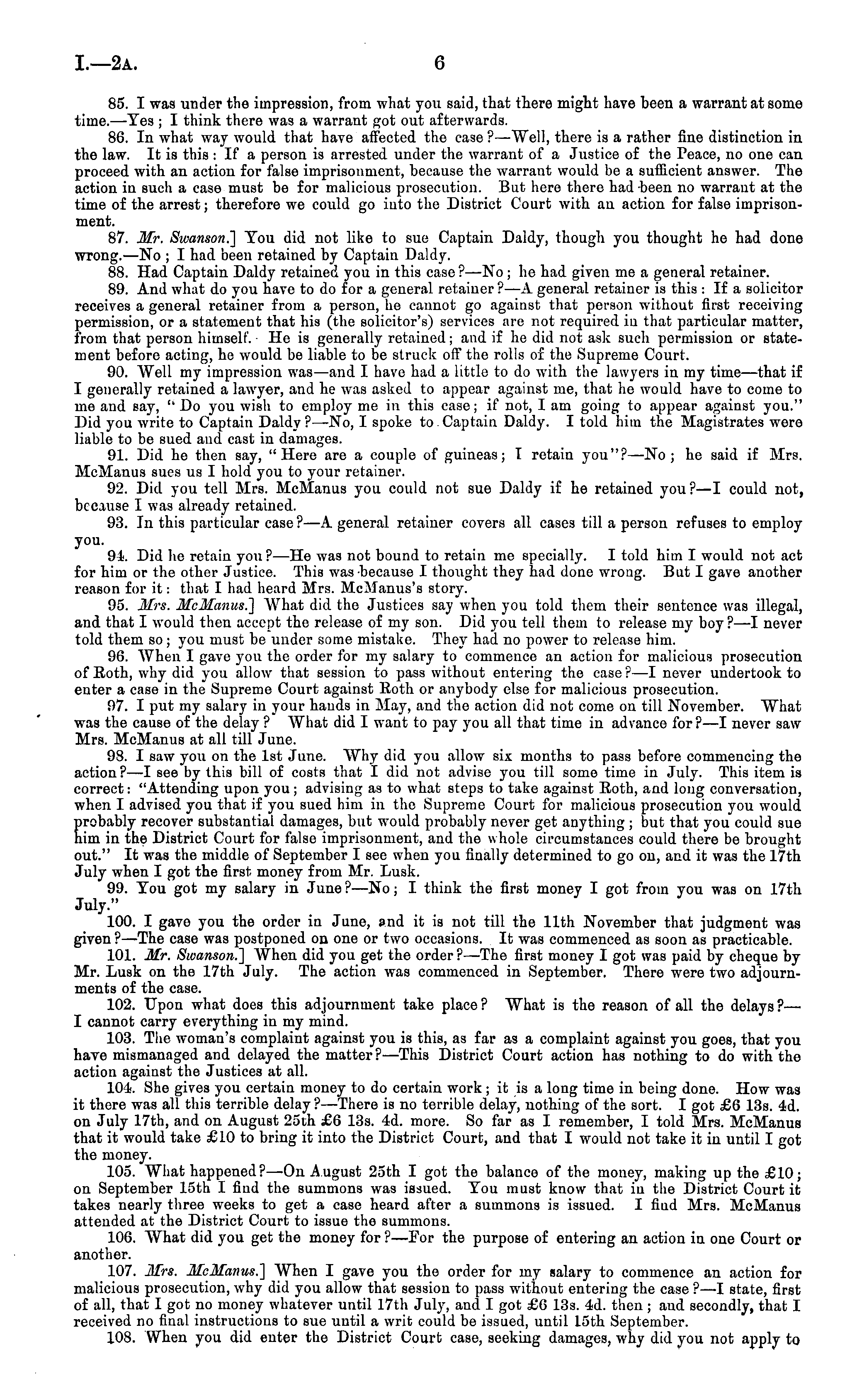 85. I was under the impression, from what you said, that there might have been a warrant at some time. —Yes ; I think there was a warrant got out afterwards. 86. In what way would that have affected the case ? —Well, there is a rather fine distinction in the law. It is this :If a person is arrested under the warrant of a Justice of the Peace, no one can proceed with an action for false imprisonment, because the warrant would be a sufficient answer. The action in such a case must be for malicious prosecution. But here there had been no warrant at the time of the arrest; therefore we could go iuto the District Court with an action for false imprisonment. 87. Mr. Sivanson.~] You did not like to sue Captain Daldy, though you thought he had done wrong. —No ; I had been retained by Captain Daldy. 88. Had Captain Daldy retained you in this case ?—No; he had given me a general retainer. 89. And what do you have to do for a general retainer? —A general retainer is this : If a solicitor receives a general retainer from a person, he cannot go against that person without first receiving permission, or a statement that his (the solicitor's) services are not required iu that particular matter, from that person himself. He is generally retained; and if he did not ask such permission or statement before acting, ho would be liable to be struck off the rolls of the Supreme Court. 90. Well my impression was —and I have had a little to do with the lawyers in my time—that if I generally retained a lawyer, and he was asked to appear against me, that he would have to come to me aud say, "Do you wish to employ me in this case; if not, I am going to appear against you." Did you write to Captain Daldy ?—No, I spoke to Captain Daldy. I told him the Magistrates wore liable to be sued and cast in damages. 91. Did he then say, "Here are a couple of guineas; I retain you"?—No; he said if Mrs. McManus sues us I hold you to your retainer. 92. Did you tell Mrs. McManus you could not sue Daldy if he retained you?—l could not, because I was already retained. 93. In this particular case ?—A general retainer covers all cases till a person refuses to employ you. 94. Did lie retain you? —He was not bound to retain me specially. I told him I would not act for him or the other Justice. This was because I thought they had done wrong. But I gave another reason for it: that I had heard Mrs. McManus's story. 95. Mrs. McManus^] What did the Justices say when you told them their sentence was illegal, and that I would then accept the release of my son. Did you tell them to release my boy ? —I never told them so ; you must be under some mistake. They had no power to release him. 96. When I gave j'ou the order for my salary to commence an action for malicious prosecution of Eoth, why did you allow that session to pass without entering the case? —I never undertook to enter a case in the Supreme Court against Eoth or anybody else for malicious prosecution. 97. I put my salary in your hands in May, and the action did not come on till November. What was the cause of the delay ? What did I want to pay you all that time in advance for? —I never saw Mrs. McManus at all till June. 98. I saw you on the Ist June. Why did you allow six months to pass before commencing the action? —I see by this bill of costs that I did not advise you till some time in July. This item is correct: "Attending upon you ; advising as to what steps to take against Eoth, and long conversation, when I advised you that if you sued him in the Supreme Court for malicious prosecution you would probably recover substantial damages, but would probably never get anything ; but that you could sue him in the District Court for false imprisonment, and the whole circumstances could there be brought out." It was the middle of September I see when you finally determined to go on, and it was the 17th July when I got the first money from Mr. Lusk. 99. You got my salary in June ?—No; I think the first money I got from you was on 17th July." 100. I gave you the order in June, »nd it is not till the 11th November that judgment was given ? —The case was postponed on one or two occasions. It was commenced as soon as practicable. 101. Mr. Swanson.] When did you get the order ?—The first money I got was paid by cheque by Mr. Lusk on the 17th July. The action was commenced in September. There were two adjournments of the case. 102. Upon what does this adjournment take place? What is the reason of all the delays?— I cannot carry everything in my mind. 103. The woman's complaint against you is this, as far as a complaint against you goes, that you have mismanaged and delayed the matter?—This District Court action has nothing to do with the action against the Justices at all. 101. She gives you certain money to do certain work ;it is a long time in being done. How was it there was all this terrible delay ? —There is no terrible delay, nothing of the sort. I got £6 13s. 4d. on July 17th, and on August 25th £6 13s. 4d. more. So far as I remember, I told Mrs. McManus that it would take £10 to bring it into the District Court, and that I would not take it in until I got the money. 105. What happened? —On August 25th I got the balance of the money, making up the £10; on September 15th I find the summons was issued. You must know that iu the District Court it takes nearly three weeks to get a case heard after a summons is issued. I find Mrs. McManus attended at the District Court to issue the summons. 106. What did you get the money for ?—For the purpose of entering an action in one Court or another. 107. Mrs. McManus.'] When I gave you the order for my salary to commence an action for malicious prosecution, why did you allow that session to pass without entering the case ?—I state, first of all, that I got no money whatever until 17th July, and I got £6 13s. 4d. then; and secondly, that I received no final instructions to sue until a writ could be 