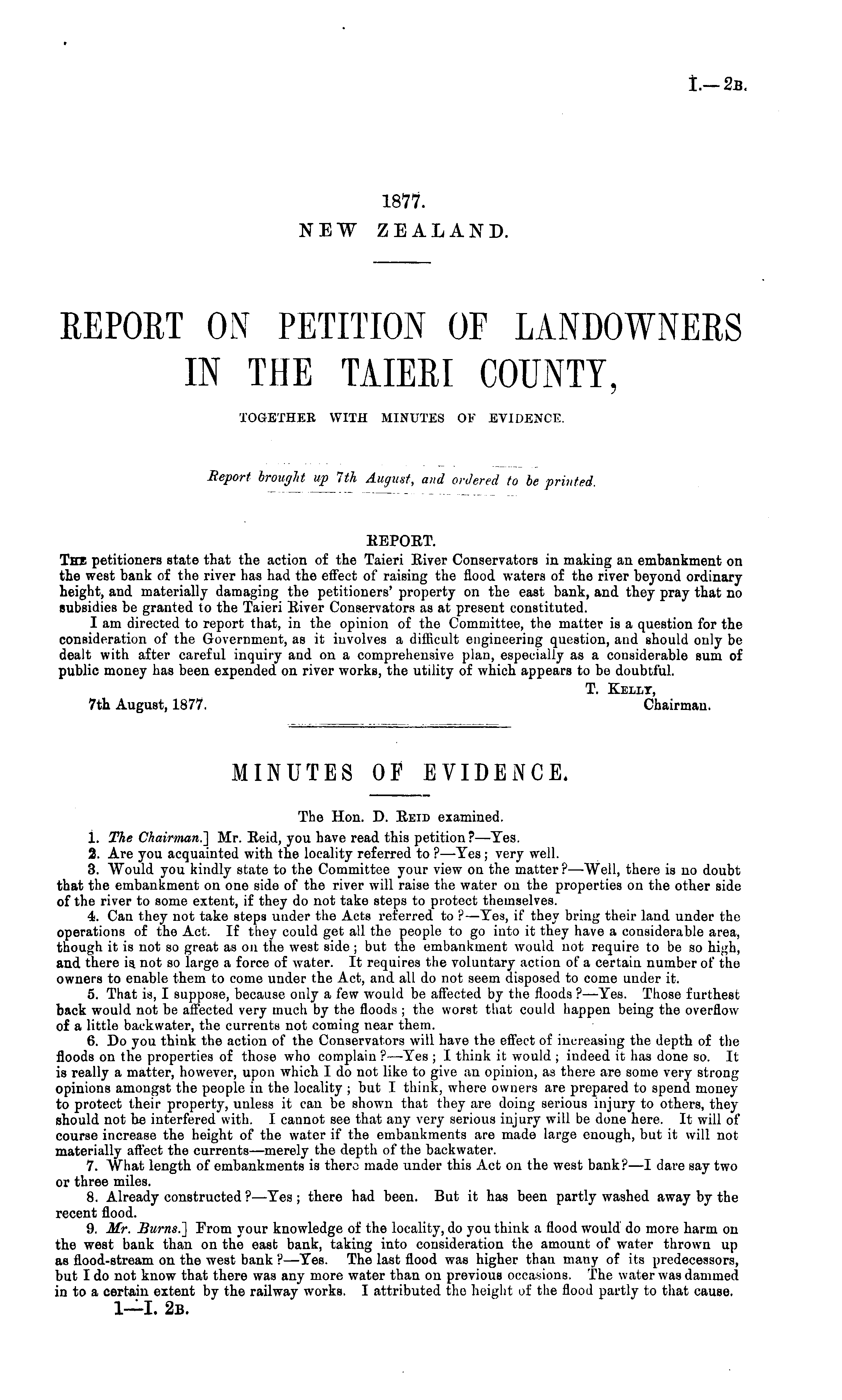 REPORT ON PETITION OF LANDOWNERS IN THE TAIERI COUNTY, TOGETHER WITH MINUTES OF EVIDENCE.