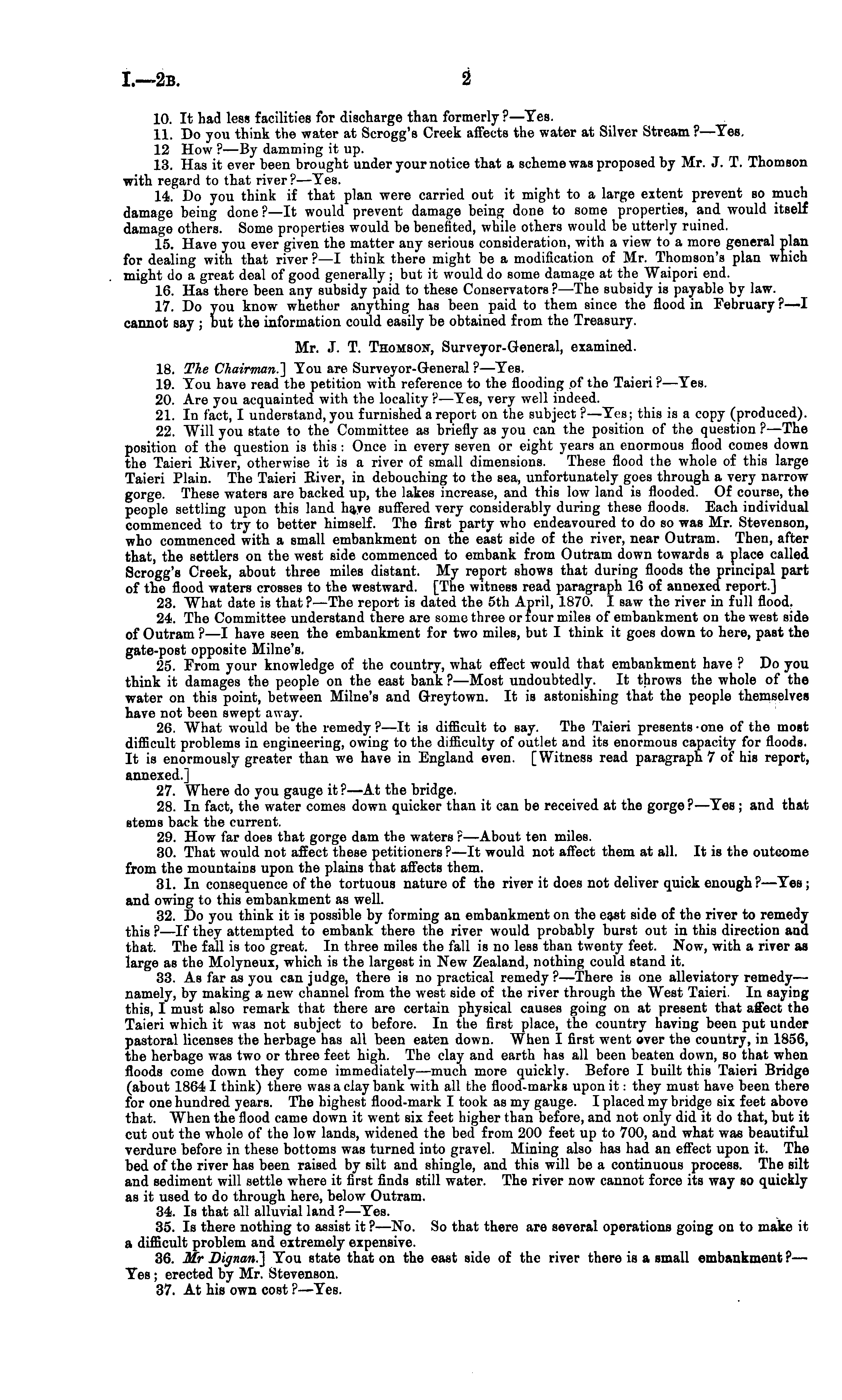10. It had less facilities for discharge than formerly ?—Yes. 11. Do you think the water at Scrogg's Creek affects the water at Silver Stream ?—Yes. 12 How ? —By damming it up. 13. Has it ever been brought under your notice that a scheme was proposed by Mr. J. T. Thomson with regard to that river ? —Yes. 14. Do you think if that plan were carried out it might to a large extent prevent so much damage being done ?—lt would prevent damage being done to some properties, and would itself damage others. Some properties would be benefited, while others would be utterly ruined. 15. Have you ever given the matter any serious consideration, with a view to a more general plan for dealing with that river ? —I think there might be a modification of Mr. Thomson's plan which might do a great deal of good generally ; but it would do some damage at the Waipori end. 16. Has there been any subsidy paid to these Conservators ?—The subsidy is payable by law. 17. Do you know whether anything has been paid to them since the flood in February ?—I cannot say ; but the information could easily be obtained from the Treasury. Mr. J. T. Thomson, Surveyor-General, examined. 18. The Chairman.] You are Surveyor-General?—Yes. 19. You have read the petition with reference to the flooding of the Taieri ?—Yes. 20. Are you acquainted with the locality ?—Yes, very well indeed. 21. In fact, I understand, you furnished a report on the subject ?—Yes; this is a copy (produced). 22. Will you state to the Committee as briefly as you can the position of the question ?—The position of the question is this: Once in every seven or eight years an enormous flood comes down the Taieri River, otherwise it is a river of small dimensions. These flood the whole of this large Taieri Plain. The Taieri River, in debouching to the sea, unfortunately goes through a very narrow gorge. These waters are backed up, the lakes increase, and this low land is flooded. Of course, the people settling upon this land have suffered very considerably during these floods. Each individual commenced to try to better himself. The first party who endeavoured to do so was Mr. Stevenson, who commenced with a small embankment on the east side of the river, near Outram. Then, after that, the settlers on the west side commenced to embank from Outram down towards a place called Scrogg's Creek, about three miles distant. My report shows that during floods the principal part of the flood waters crosses to the westward. [The witness read paragraph 16 of annexed report.] 23. What date is that ? —The report is dated the sth April, 1870. I saw the river in full flood. 24. The Committee understand there are some three or four miles of embankment on the west side of Outram ?—I have seen the embankment for two miles, but I think it goes down to here, past the gate-post opposite Milne's. 25. From your knowledge of the country, what effect would that embankment have ? Do you think it damages the people on the east bank ?—Most undoubtedly. It throws the whole of the water on this point, between Milne's and Greytown. It is astonishing that the people themselves have not been swept away. 26. What would be the remedy? —It is difficult to say. The Taieri presents one of the most difficult problems in engineering, owing to the difficulty of outlet and its enormous capacity for floods. It is enormously greater than we have in England even. [Witness read paragraph 7of his report, annexed.] 27. Where do you gauge it ?—At the bridge. 28. In fact, the water comes down quicker than it can be received at the gorge?— Yes ; and that stems back the current. 29. How far does that gorge dam the waters ?—About ten miles. 30. That would not affect these petitioners ?—lt would not affect them at all. It is the outcome from the mountains upon the plains that affects them. 31. In consequence of the tortuous nature of the river it does not deliver quick enough ?—Yes; and owing to this embankment as well. 32. Do you think it is possible by forming an embankment on the east side of the river to remedy this ?—lf they attempted to embank there the river would probably burst out in this direction and that. The fall is too great. In three miles the fall is no less than twenty feet. Now, with a river as large as the Molyneux, which is the largest in New Zealand, nothing could stand it. 33. As far as you can judge, there is no practical remedy?— There is one alleviatory remedy— namely, by making a new channel from the west side of the river through the West Taieri. In saying this, I must also remark that there are certain physical causes going on at present that affect the Taieri which it was not subject to before. In the first place, the country having been put under pastoral licenses the herbage has all been eaten down. When I first went over the country, in 1856, the herbage was two or three feet high. The clay and earth has all been beaten down, so that when floods come down they come immediately—much more quickly. Before I built this Taieri Bridge (about 1864 I think) there was a clay bank with all the flood-marks upon it: they must have been there for one hundred years. The highest flood-mark I took as my gauge. I placed my bridge six feet above that. When the flood came down it went six feet higher than before, and not only did it do that, but it cut out the whole of the low lands, widened the bed from 200 feet up to 700, and what was beautiful verdure before in these bottoms was turned into gravel. Mining also has had an effect upon it. The bed of the river has been raised by silt and shingle, and this will be a continuous process. The silt and sediment will settle where it first finds still water. The river now cannot force its way so quickly as it used to do through here, below Outram. 34. Is that all alluvial land ? —Yes. 35. Is there nothing to assist it ?—No. So that there are several operations going on to make it a difficult problem and extrem