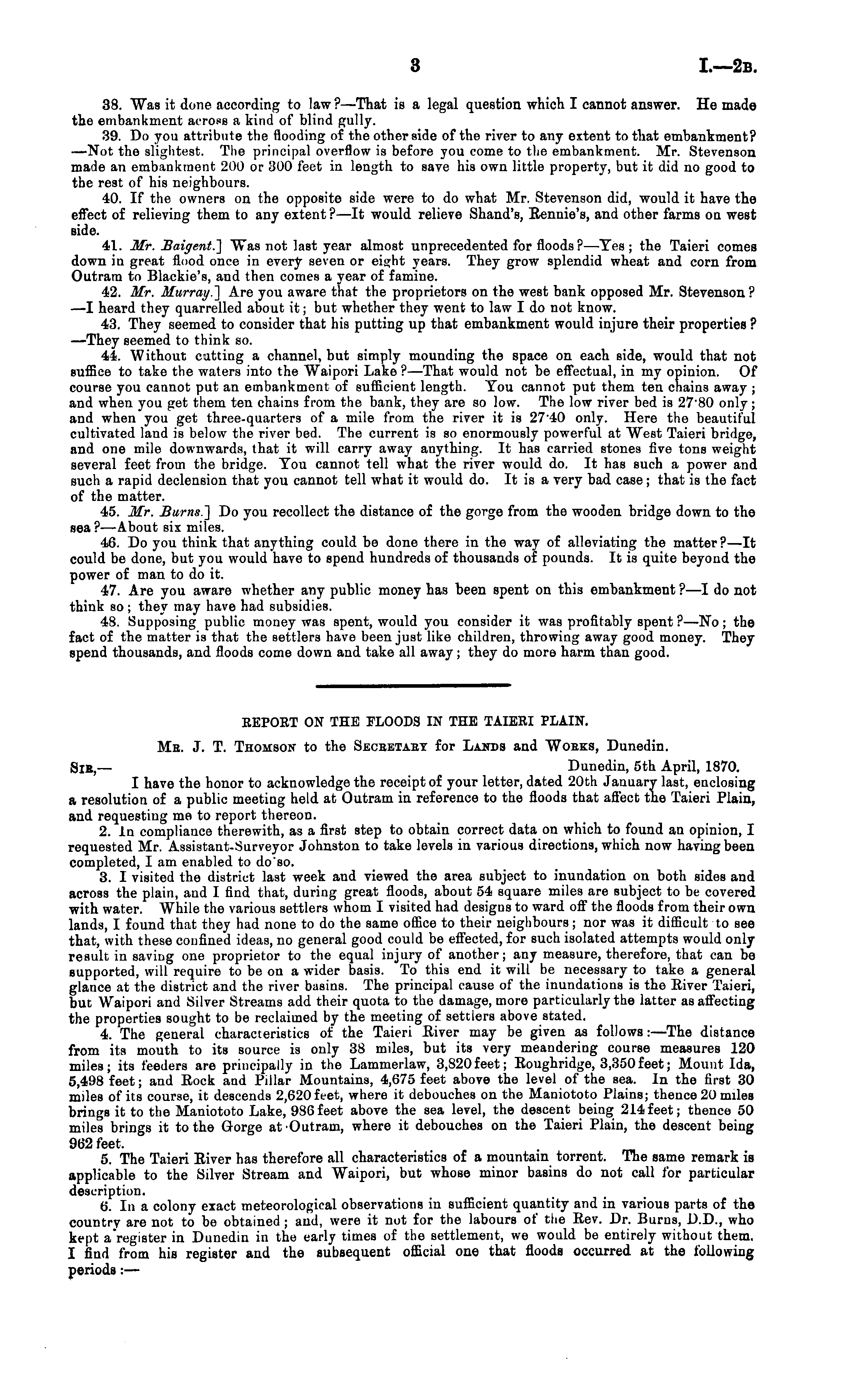 REPORT ON THE FLOODS IN THE TAIERI PLAIN. Me. J. T. Thomson to the Seceetaey for Lands and Wobks, Dunedin. Sir,— Dunedin, sth April, 1870. I have the honor to acknowledge the receipt of your letter, dated 20th January last, enclosing a resolution of a public meeting held at Outram in reference to the floods that affect the Taieri Plain, and requesting me to report thereon. 2. in compliance therewith, as a first step to obtain correct data on which to found an opinion, I requested Mr. Assistant-Surveyor Johnston to take levels in various directions, which now having been completed, I am enabled to do so. 3. I visited the district last week and viewed the area subject to inundation on both sides and across the plain, and I find that, during great floods, about 54 square miles are subject to be covered with water. While the various settlers whom I visited had designs to ward off the floods from their own lands, I found that they had none to do the same office to their neighbours; nor was it difficult to see that, with these confined ideas, no general good could be effected, for such isolated attempts would only result in saving one proprietor to the equal injury of another; any measure, therefore, that can be supported, will require to be on a wider basis. To this end it will be necessary to take a general glance at the district and the river basins. The principal cause of the inundations is the River Taieri, but Waipori and Silver Streams add their quota to the damage, more particularly the latter as affecting the properties sought to be reclaimed by the meeting of settlers above stated. 4. The general characteristics of the Taieri River may be given as follows:—The distance from its mouth to its source is only 38 miles, but its very meandering course measures 120 miles; its feeders are principally in the Lammerlaw, 3,B2ofeet; Roughridge, 3,3sofeet; Mount Ida, 5,498 feet; and Rock and Prllar Mountains, 4,675 feet above the level of the sea. In tho first 30 miles of its course, it descends 2,62ofeet, where it debouches on the Maniototo Plains; thence 20 miles brings it to the Maniototo Lake, 986 feet above the sea level, the descent being 214 feet; thence 50 miles brings it to the Gorge at Outram, where it debouches on the Taieri Plain, the descent being 962 feet. 5. The Taieri River has therefore all characteristics of a mountain torrent. The same remark is applicable to the Silver Stream and Waipori, but whose minor basins do not call for particular description. 6. In a colony exact meteorological observations in sufficient quantity and in various parts of tho country are not to be obtained ; and, were it not for the labours of the Rev. Dr. Burns, D.D., who kept a "register in Dunedin in the early times of the settlement, we would be entirely without them. I find from his register and the subsequent official one that floods occurred at the following periods:—