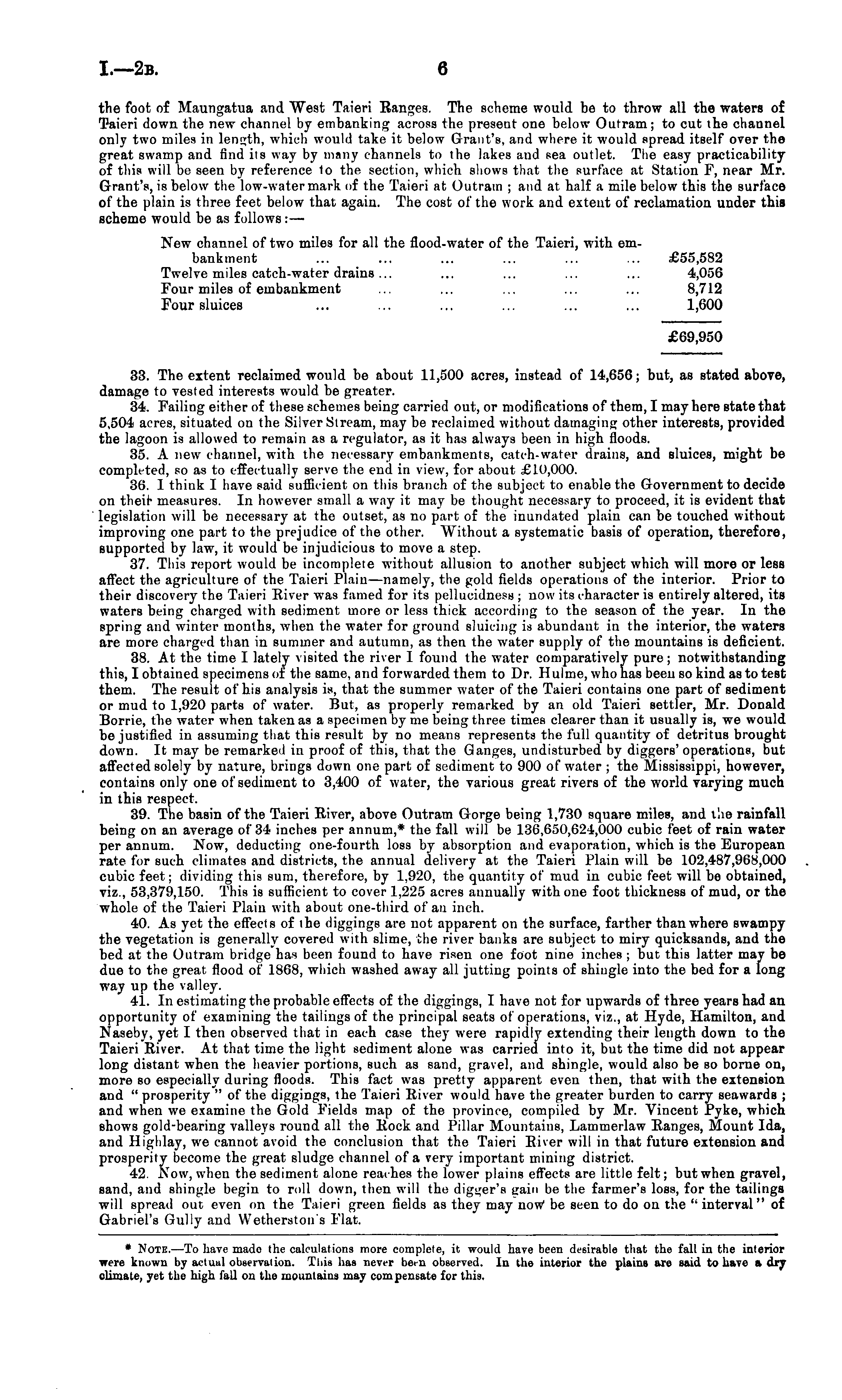 the foot of Maungatua and West Taieri Ranges. The scheme would be to throw all the waters of Taieri down the new channel by embanking across the present one below Outram; to cut the channel only two miles in length, which would take it below Grant's, and where it would spread itself over the great swamp and find its way by many channels to the lakes aud sea outlet. The easy practicability of this will be seen by reference to the section, which shows that the surface at Station F, near Mr. Grant's, is below the low-watermark of the Taieri at Outrarn ; and at half a mile below this the surface of the plain is three feet below that again. The cost of the work and extent of reclamation under this scheme would be as follows:— New channel of two miles for all the flood-water of the Taieri, with embankment ... ... ... ... ... ... £55,582 Twelve miles catch-water drains ... ... ... ... ... 4,056 Four miles of embankment ... ... ... ... ... 8,712 Four sluices ... ... ... ... ... ... 1,600 £69,950 33. The extent reclaimed would be about 11,500 acres, instead of 14,656; but, as stated above, damage to vested interests would be greater. 34. Failing either of these schemes being carried out, or modifications of them, I may here state that 5,504 acres, situated on the Silver Stream, may be reclaimed without damaging other interests, provided the lagoon is allowed to remain as a regulator, as it has always been in high floods. 35. A new channel, with the necessary embankments, catch-water drains, and sluices, might be completed, so as to effectually serve the end in view, for about £10,000. 36. 1 think I have said sufficient on this branch of the subject to enable the Government to decide on their measures. In however small a way it may be thought necessary to proceed, it is evident that legislation will be necessary at the outset, as no part of the inundated plain can be touched without improving one part to the prejudice of the other. Without a systematic basis of operation, therefore, supported by law, it would be injudicious to move a step. 37. This report would be incomplete without allusion to another subject which will more or less affect the agriculture of the Taieri Plain —namely, the gold fields operatioirs of the interior. Prior to their discovery the Taieri River was famed for its pellucidness ; now its character is entirely altered, its waters being charged with sediment more or less thick according to the season of the year. In the spring and winter months, when the water for ground sluicing is abundant in the interior, the waters are more charged than in summer and autumn, as then the water supply of the mountains is deficient. 38. At the time I lately visited the river 1 found the water comparatively pure; notwithstanding this, I obtained specimens of the same, and forwarded them to Dr. Hulme, who has been so kind as to test them. The result of his analysis is, that the summer water of the Taieri corrtains one part of sediment or mud to 1,920 parts of water. But, as properly remarked by an old Taieri settler, Mr. Donald Borrie, the water when taken as a specimen by me being three times clearer than it usually is, we would be justified in assuming that this result by no means represents the full quantity of detritus brought down. It may be remarked in proof of this, that the Ganges, urrdisturbed by diggers'operations, but affected solely by nature, brings down one part of sediment to 900 of water ; the Mississippi, however, contains only one of sediment to 3,400 of water, the various great rivers of the world varying much in this respect. 39. The basin of the Taieri River, above Outram Gorge being 1,730 square miles, and the rainfall being on an average of 34 inches per annum,* the fall will be 136,650,624,000 cubic feet of rain water per annum. Now, deducting oire-fourth loss by absorption arrd evaporation, which is the European rate for such climates and districts, the annual delivery at the Taieri Wain will be 102,487,965,000 cubic feet; dividing this sum, therefore, by 1,920, the quantity of mud in cubic feet will be obtained, viz., 53,379,150. This is sufficient to cover 1,225 acres annually with one foot thickness of mud, or the whole of the Taieri Plain with about one-third of an inch. 40. As yet the effects of the diggings are not apparent on the surface, farther than where swampy the vegetation is generally covered with slime, the river banks are subject to miry quicksands, and the bed at the Outram bridge has been found to have risen one foot nine inches ; but this latter may be due to the great flood of 1868, which washed away all jutting points of shingle into the bed for a long way up the valley. 41. In estimating the probable effects of the diggings, I have not for upwards of three years had an opportunity of examining the tailings of the principal seats of operations, viz., at Hyde, Hamilton, arrd Naseby, yet I then observed that in each case they were rapidly extending their lerrgth down to the Taieri River. At that time the light sediment alone was carried into it, but the time did not appear long distant when the heavier portions, such as sand, gravel, and shingle, would also be so borne on, more so especially during floods. This fact was pretty apparent even then, that with the extension and " prosperity " of the diggings, the Taieri River would have the greater burden to carry seawards ; and when we examine the Gold Fields map of the province, compiled by Mr. Vincent Pyke, which shows gold-bearing valleys round all the Rock and Pillar Mountains, Lammerlaw Ranges, Mount Ida, and Highlay, we cannot avoid the conclusion that the Taieri River will in that future extension and prosperity become the great sludge channel of a very important mining district. 42. Now, when the sediment alone reaches the lower plains effects are little felt; but when gravel, sand, aird shingle begin to roll down, then will the digger's gain be the farmer's loss, for the tailings will spr