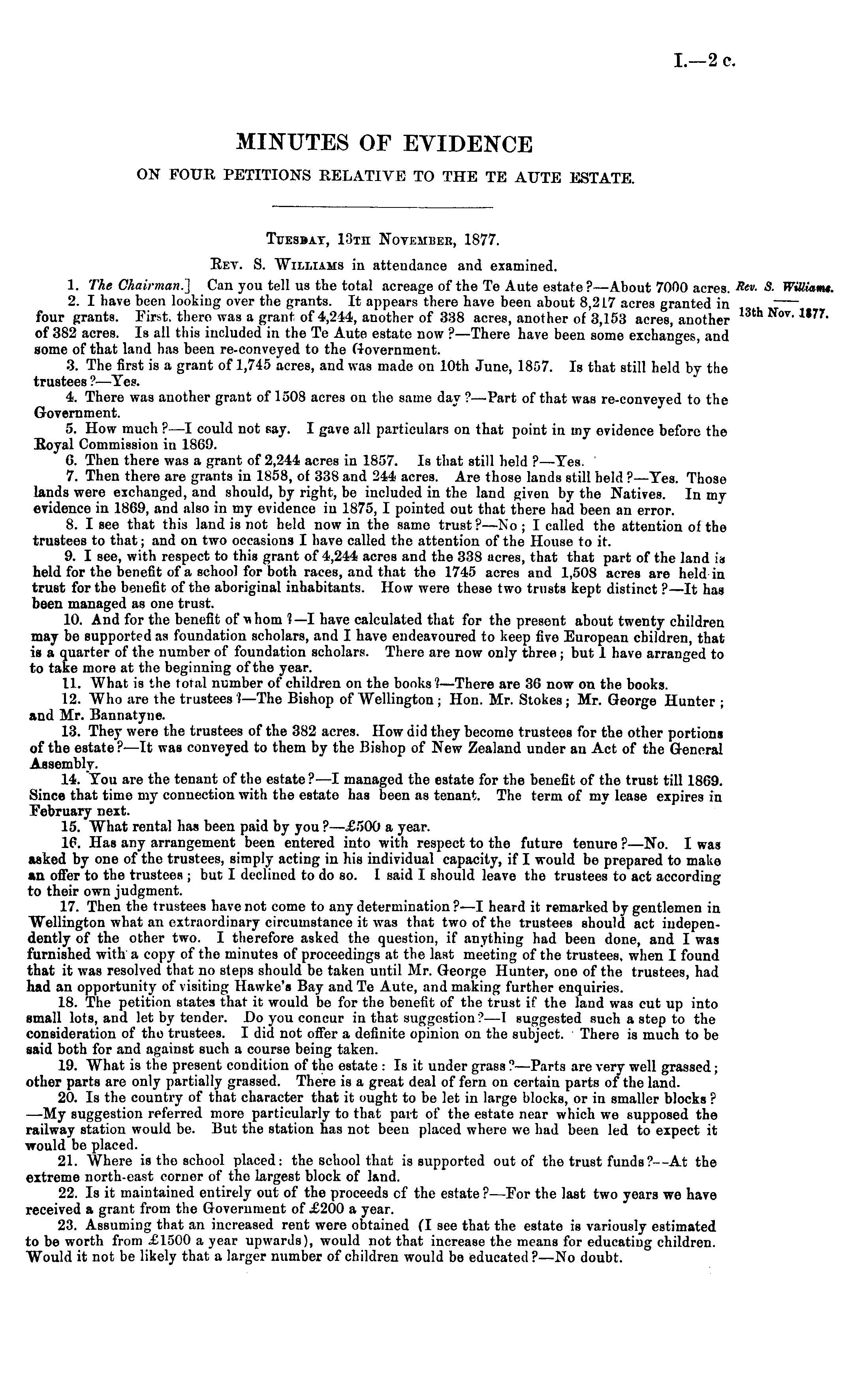 Tuesbat, 13th November, 1577. Ret. S. Williams in attendance and examined. 1. I'he Chairman.] Can you tell us the total acreage of'the Te Aute estate?— About 7000 acres. 2. I have been looking over the grants. It appears there have been about 8,2 L 7 acres granted in four grants. First, there was a grant of 4,214, another of 338 acres, another of 3,153 acres, another of 382 acres. Is all this included in the Te Aute estate now ?—There have been some exchanges, and some of that land has been re-conveyed to the Government. 3. The first is a grant of 1,745 acres, and was made on 10th June, 1857. Is that still held by the trustees ?—Yes. 4. There was another grant of 1508 acres on the same day ?—Part of that was re-conveyed to the Government. 5. How much ?—I could not say. I gave all particulars on that point in my evidence before the Royal Commission in 1869. 6. Then there was a grant of 2,244 acres in 1857. Is that still held ?—Tes. 7. Then there are grants in 1858, of 338 and 244 acres. Are those lands still held ?—Tes. Those lands were exchanged, and should, by right, be included in the land given by the Natives. In my evidence in 1869, and also in my evidence iv 1875, I pointed out that there had been an error. 8. I see that this land is not held now in the same trust?—No ; I called the attention of the trustees to that; and on two occasions I have called the attention of the House to it. 9. I see, with respect to this grant of 4,244 acres and the 338 acres, that that part of the land is held for the benefit of a school for both races, and that the 1745 acres and 1,508 acres are held in trust for the benefit of'the aboriginal inhabitants. How were these two trusts kept distinct ?—lt has been managed as one trust. 10. And for the benefit of'whom ?—I have calculated that for the present about twenty children may be supported as foundation scholars, and I have endeavoured to keep five European children, that is a quarter of the number of foundation scholars. There are now only three; but 1 have arranged to to take more at the beginning of the year. 11. What is the total number of children on the books ?—There are 36 now on the books. 12. Who are the trustees!—The Bishop of Wellington ; Hon. Mr. Stokes; Mr. George Hunter ; and Mr. Bannatyne. 13. They were the trustees of the 382 acres. How did they become trustees for the other portions of the estate?—lt was conveyed to them by the Bishop of New Zealand under an Act of the General Assembly. 14. Tou are the tenant of the estate?—I managed the estate for the benefit of the trust till 1869. Since that time my connection with the estate has been as tenant. The term of my lease expires in February next. 15. What rental has been paid by you ?—£soo a year. IP. Has any arrangement been entered into with respect to the future tenure ?—No. I was asked by one of the trustees, simply acting in his individual capacity, if I would be prepared to make an offer to the trustees ; but I declined to do so. I said I should leave the trustees to act according to their own judgment. 17. Then the trustees have not come to any determination ?—I heard it remarked by gentlemen in Wellington what an extraordinary circumstance it was that two of the trustees should act independently of the other two. I therefore asked the question, if anything had been done, and I was furnished with a copy of the minutes of proceedings at the last meeting of the trustees, when I found that it was resolved that no steps should be taken until Mr. George Hunter, one of the trustees, had had an opportunity of visiting Hawke's Bay and Te Aute, and making further enquiries. 18. The petition states that it would be for the benefit of the trust if the land was cut up into small lots, and let by tender. Do you concur in that suggestion'?—l suggested such a step to the consideration of tho trustees. I did not offer a definite opinion on the subject. There is much to be said both for and against such a course being taken. .19. What is the present condition of the estate : Is it under grass ?—Parts are very well grassed; other parts are only partially grassed. There is a great deal of fern on certain parts of the land. 20. Is the country of that character that it ought to be let in large blocks, or in smaller blocks ? —My suggestion referred more particularly to that part of the estate near which we supposed the railway station would be. But the station has not been placed where we had been led to expect it would be placed. 21. Where is the school placed: the school that is supported out of the trust funds?—At the extreme north-east corner of the largest block of land. 22. Is it maintained entirely out of the proceeds cf the estate ?—For the last two years we have received a grant from the Government of £200 a year. 23. Assuming that an increased rent were obtained CI see that the estate is variously estimated to be worth from £1500 a year upwards), would not that increase the means for educating children. Would it not be likely that a larger number of children would be educated?—No doubt.