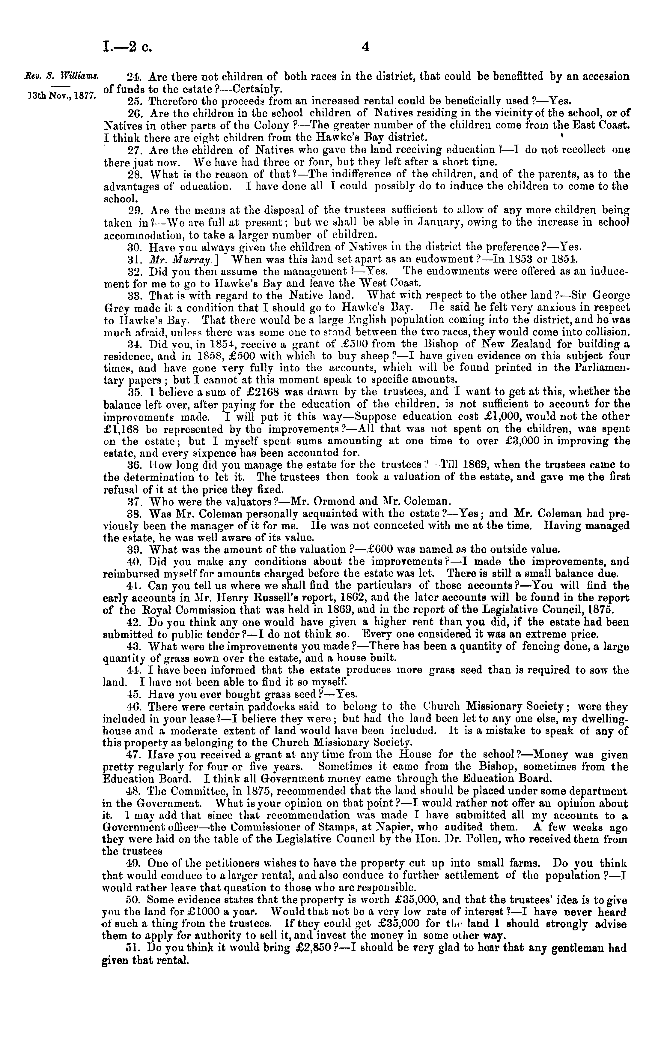 . 24. Are there not children of both races in the district, that could be benefitted by an accession of funds to the estate ?—Certainly. 25. Therefore the proceeds from an increased rental could be beneficially used ?—Tes. 26. Are the children in the school children of Natives residing in the vicinity of the school, or of Natives in other parts of the Colony ?—The greater number of the children come from the East Coast. I think there are eight children from the Hawke's Bay district. • 27. Are the children of Natives who gave the land receiving education I —l do not recollect one there just now. We have had three or four, but they left after a short time. 28. What is the reason of that ?—The indifference of the children, and of the parents, as to the advantages of education. I have done all I could possibly do to induce the children to come to the school. 29. Are the means at the disposal of the trustees sufficient to allow of any more children being taken in ?—Wo are full at present; but we shall be able in January, owing to the increase in school accommodation, to take a larger number of children. 30. Have you always given the children of Natives in the district the preference ?—Tes. 31. Mr. Murray] When was this land set apart as an endowment ?—ln 1853 or 1854. 32. Did you then assume the management t —Tes. The endowments were offered as an inducement for me to go to Hawke's Bay and leave the AVest Coast. 33. That is with regard to the Native land. AVhat with respect to the other land?— Sir George Grey made it a condition that I should go to Hawke's Bay. He said he felt very anxious in respect to Hawke's Bay. That there would be a large English population coming into the district, and he was much afraid, unless there was some one to stnnd between the two races, they would come into collision. 34. Did you, in 185 i, receive a grant of £500 from the Bishop of New Zealand for building a residence, and in 1858, £500 with which to buy sheep ?—I have given evidence on this subject four times, and have gone very fully into the accounts, which will be found printed in the Parliamentary papers ; but I cannot at this moment speak to specific amounts. 35. I believe a sum of £2168 was drawn by the trustees, and I want to get at this, whether the balance left over, after paying for the education of the children, is not sufficient to account for the improvements made. I will put it this way—Suppose education cost £1,000, would not the other £1,168 be represented by the improvements?—All that was not spent on the children, was spent on the estate; but I myself spent sums amounting at one time to over £3,000 in improving the estate, and every sixpence has been accounted for. 36. How long did you manage the estate for the trustees'?—Till 1869, when the trustees came to the determination to let it. The trustees then took a valuation of the estate, and gave me the first refusal of it at the price they fixed. 37. Who were the valuators?—Mr. Ormond and Air. Coleman. 38. Was Mr. Coleman personally acquainted with the estate ?—Tes; and Mr. Coleman had previously been the manager of it for me. He was not connected with me at the time. Having managed the estate, he was well aware of its value. 39. What was the amount of the valuation ?—£6oo was named as the outside value. 40. Did you make any conditions about the improvements?—l made the improvements, and reimbursed myself for amounts charged before the estate was let. There is still a small balance due. 41. Can you tell us where we shall find the particulars of those accounts?—Tou will find the early accounts in Air. Henry Russell's report, 1862, and the later accounts will be found in the report of the Royal Commission that was held iv 1869, aud in the report of the Legislative Council, 1875. 42. Do you think any one would have given a higher rent than you did, if the estate had been submitted to public tender?—l do not think so. Every one considered it was an extreme price. 43. AVhat were the improvements you made ?—There has been a quantity of fencing done, a large quantity of grass sown over the estate, and a house built. 44. I have been informed that the estate produces more grass seed than is required to sow the land. I have not been able to find it so myself. 45. Have you ever bought grass seed ?—Tes. 46. There were certain paddocks said to belong to the Church Missionary Society; were they included in your lease!—l1—I believe they were; but had the land been let to any one else, my dwellinghouse and a moderate extent of land would have been included. It is a mistake to speak of any of this property as belonging to the Church Missionary Society. 47. Have you received a grant at any time from the House for the school ?—Money was given pretty regularly for four or five years. Sometimes it came from the Bishop, sometimes from the Education Board. I think all Government money came through the Education Board. 48. The Committee, in 1875, recommended that the land should be placed under some department in the Government. AVhat is your opinion on that point?—l would rather not offer an opinion about it. I may add that since that recommendation was made I have submitted all my accounts to a Government officer—the Commissioner of Stamps, at Napier, who audited them. A few weeks ago they were laid on the table of the Legislative Council by the Hon. Dr. Pollen, who received them from the trustees 49. Ono of the petitioners wishes to have the property cut up into small farms. Do you think that would conduce to a larger rental, and also conduce to further settlement of the population ?—I would rather leave that question to those who are responsible. 50. Some evidence states that the property is worth £35,000, and that the trustees' idea is to give you the land for £1000 a year. Would that not be a very low rate of interest ?—I have never heard of such a thing from the trustees. If they could get 