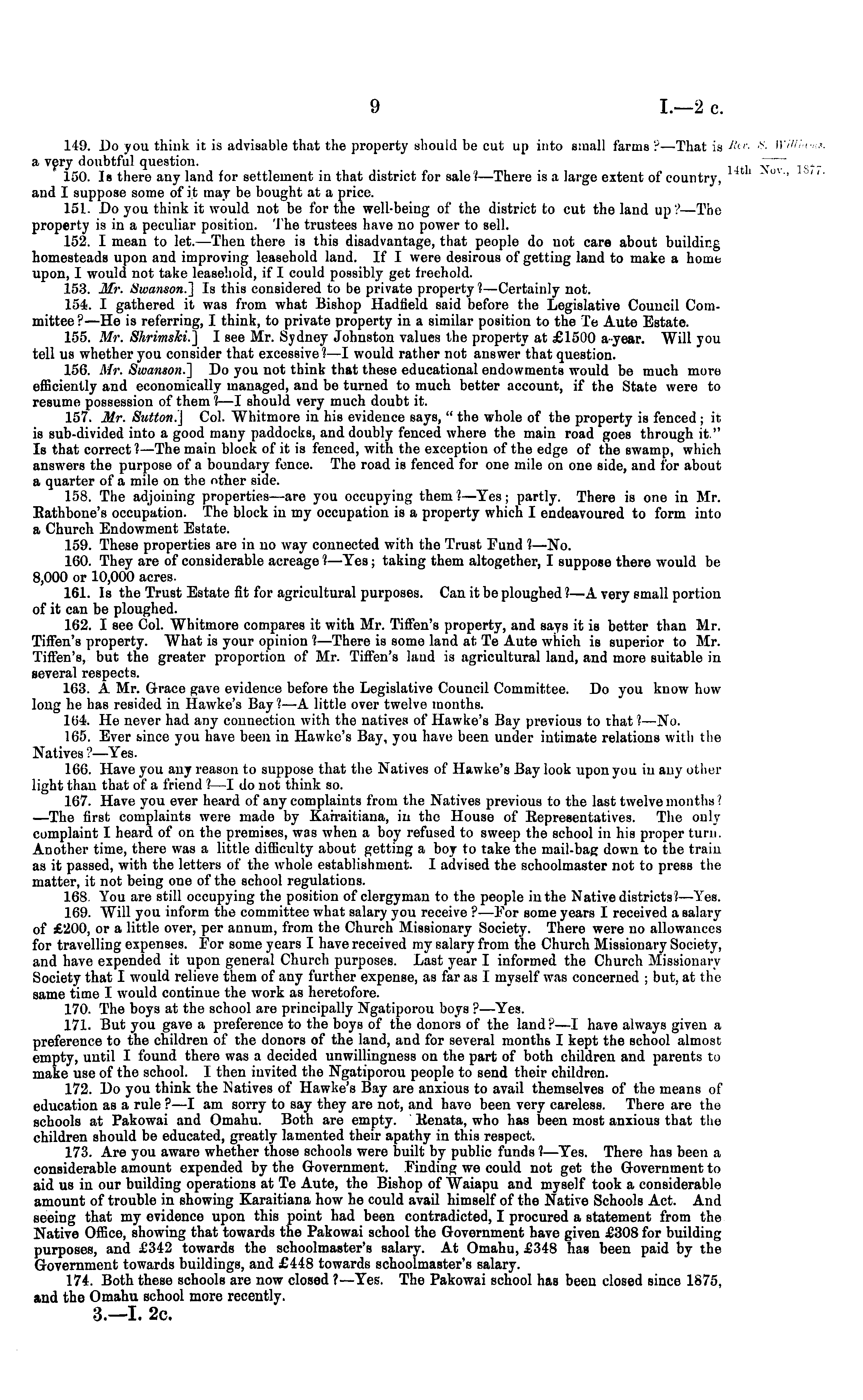 149. Do you think it is advisable that the property should be cut up into small farms P—That is •* a very doubtful question. 150. Is there any land for settlement in that district for sale?— There is a large extent of country, and I suppose some of it may be bought at a price. 161. Do you think it would not be for the well-being of the district to cut the land up?—The property is in a peculiar position. The trustees have no power to sell. 152. I mean to let.—Then there is this disadvantage, that people do not care about building homesteads upon and improving leasehold land. If I were desirous of getting land to make a home upon, I would not take leasehold, if I could possibly get freehold. 153. Mr. Swanson.] Is this considered to be private property ?—Certainly not. 154. I gathered it was from what Bishop Hadfield said before the Legislative Council Committee ?—He is referring, I think, to private property in a similar position to the Te Aute Estate. 155. Mr. Shrimski.] I see Mr. Sydney Johnston values the property at £1500 ayear. AVill you tell us whether you consider that excessive?—I would rather not answer that question. 156. Mr. Swanson.] Do you not think that these educational endowments would be much more efficiently and economically managed, and be turned to much better account, if the State were to resume possession of them ?—I should very much doubt it. 157. Mr. Suttoni] Col. Whitmore in his evidence says, " the whole of the property is fenced ;it is sub-divided into a good many paddocks, and doubly fenced where the main road goes through it." Is that correct ?—The main block of it is fenced, with the exception of the edge of the swamp, which answers the purpose of a boundary fence. The road is fenced for one mile on one side, and for about a quarter of a mile on the other side. 158. The adjoining properties—are you occupying them ?—Yes; partly. There is one in Air. Rathbone's occupation. The block in my occupation is a property which I endeavoured to form into a Church Endowment Estate. 159. These properties are in no way connected with the Trust Fund ?—No. 160. They are of considerable acreage ?—Yes; taking them altogether, I suppose there would be 8,000 or 10,000 acres. 161. Is the Trust Estate fit for agricultural purposes. Can it be ploughed ?—A very small portion of it can be ploughed. 162. I see Col. Whitmore compares it with Mr. Tiffen's property, and says it is better than Mr. Tiffen's property. What is your opinion ?—There is some land at Te Aute which is superior to Air. Tiffen's, but the greater proportion of Mr. Tiffen's laud is agricultural land, and more suitable in several respects. 163. A Mr. Grace gave evidence before the Legislative Council Committee. Do you know how long he has resided in Hawke's Bay ?—A little over twelve months. 104. He never had any connection with the natives of Hawke's Bay previous to that?—No. 165. Ever since you have been in Hawke's Bay, you have been under intimate relations with the Natives ?—Yes. 166. Have you any reason to suppose that the Natives of Hawke's Bay look upon you in any other light than that of a friend ?—I do not think so. 167. Have you ever heard of any complaints from the Natives previous to the last twelvemonths? —The first complaints were made by Kairaitiana, in the House of Representatives. The only complaint I heard of on the premises, was when a boy refused to sweep the school in his proper turn. Another time, there was a little difficulty about getting a boy to take the mail-bag down to the train as it passed, with the letters of the whole establishment. I advised the schoolmaster not to press the matter, it not being one of tho school regulations. 168 You are still occupying the position of clergyman to the people in the Native districts?—Ares. 169. AVill you inform the committee what salary you receive ?—For some years I received a salary of £200, or a little over, per annum, from the Church Alissionary Society. There were no allowances for travelling expenses. For some years I have received my salary from the Church Missionary Society, and have expended it upon general Church purposes. Last year I informed the Church Missionary Society that I would relieve them of any further expense, as far as I myself was concerned ; but, at the same time I would continue the work as heretofore. 170. The boys at the school are principally Ngatiporou boys ?—Yes. 171. But you gave a preference to the boys of the donors of the land?—l have always given a preference to the children of the donors of the land, and for several months I kept the school almost empty, until I found there was a decided unwillingness on the part of both children and parents to make use of the school. I then invited the Ngatiporou people to send their children. 172. Do you think the Natives of Hawke's Bay are anxious to avail themselves of the means of education as a rule ?—I am sorry to say they are not, and have been very careless. There are the schools at Pakowai and Omahu. Both are empty. Renata, who has been most anxious that the children should be educated, greatly lamented their apathy in this respect. 173. Are you aware whether those schools were built by public funds I —Tes. There has been a considerable amount expended by the Government. Finding we could not get the Government to aid us in our building operations at Te Aute, the Bishop of Waiapu and myself took a considerable amount of trouble in showing Karaitiana how he could avail himself of the Native Schools Act. And seeing that my evidence upon this point had been contradicted, I procured a statement from the Native Office, showing that towards the Pakowai school the Government have given £308 for building purposes, and £342 towards the schoolmaster's salary. At Omahu, £348 has been paid by the Government towards buildings, and £448 towards schoolmaster's salary. 174. Both these schools are now closed ?—Tes. The Pakowai sch