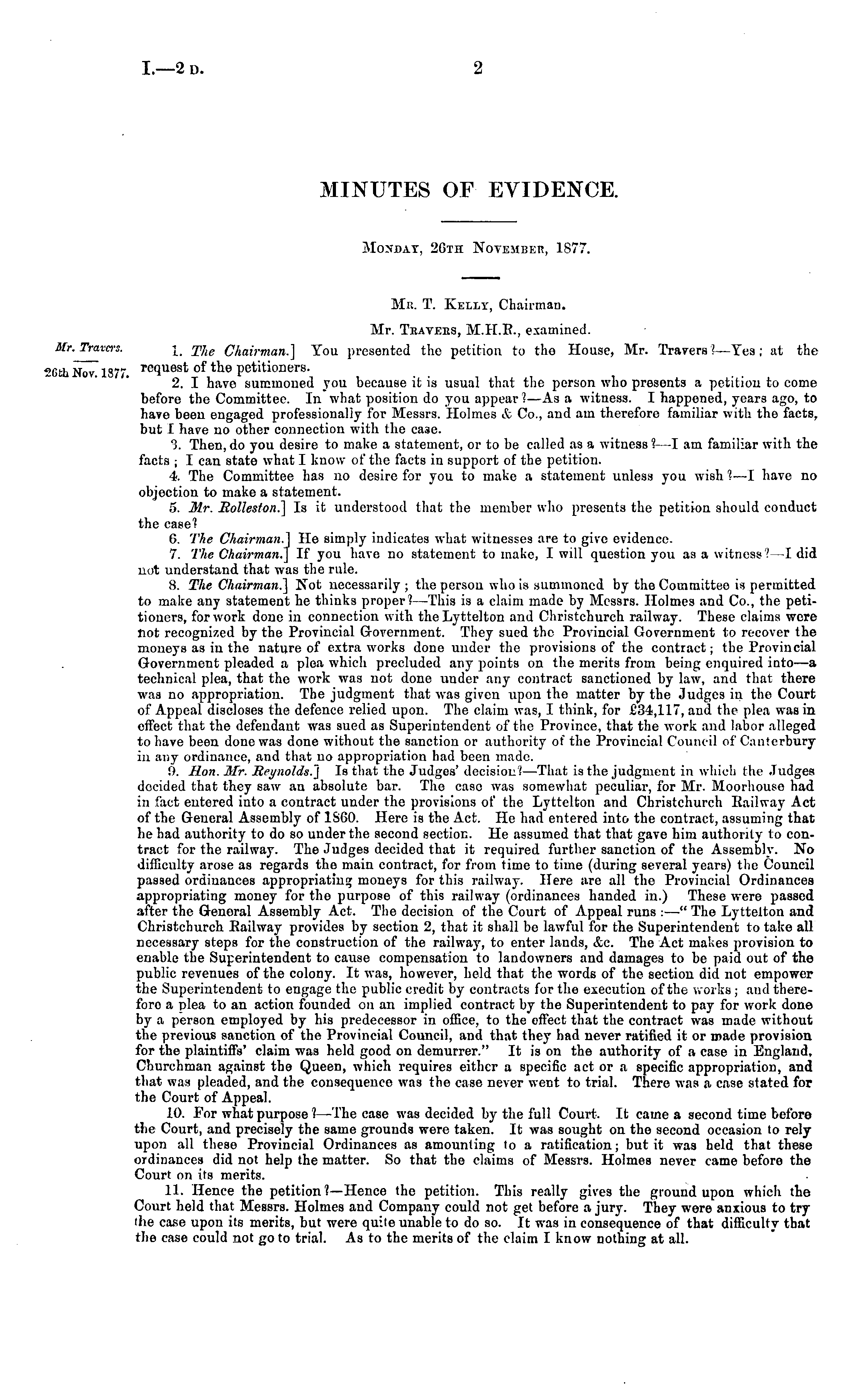 Alk. T. Kelly, Chairman. Air. Teavees, M.11.R., examined. Mr. Travcr:. 2. The Chairman.] You presented the petition to tho House, Mr. Travers ?—Tes; at the 2Gth Nov. 1577. rC(lues t °ftue petitioners. 2. I have summoned you because it is usual that the person who presents a petition to come before the Committee. In what position do you appear ?—As a witness. I happened, years ago, to have been engaged professionally for Messrs. Holmes & Co., and am therefore familiar with the facts, but I have no other connection with the ca3e. 3. Then, do you desire to make a statement, or to be called as a witness ?—I am familiar with the facts ; I can state what I know of the facts in support of the petition. 4. The Committee has no desire for you to make a statement unless you wish ?—I have no objection to make a statement. 5. Mr. Rolleston.] Is it understood that the member who presents the petition should conduct the case1! 6. The Chairman.] Ho simply indicates what witnesses are to give evidence. 7. The Chairman.] If you have no statement to make, I will question you as a witness? —I did not understand that was the rule. 8. The Chairman.] Not necessarily; the person who is summoned by the Committee is permitted to make any statement he thinks proper?— This is a claim made by Messrs. Holmes and Co., the petitioners, for work done in connection with the Lyttelton and Christchurch railway. These claims were Hot recognized by the Provincial Government. Tlrey sued the Provincial Government to recover the moneys as iv the nature of extra works done under the provisions of the contract; the Provincial Government pleaded a plea which precluded an) 7 points on the merits from being enquired into —a technical plea, that the work was not done under any contract sanctioned by law, and that there was no appropriation. The judgment that was given upon the matter by the Judges in tho Court of Appeal discloses the defence relied upon. The claim was, I think, for £34,117, and the plea was in effect that the defendant was sued as Superintendent of the Province, that the work and labor alleged to have been done was done without the sanction or authority of the Provincial Council of Canterbury in any ordinance, and that no appropriation had been made. 9. Hon. Mr. Reynolds.] Is that the Judges' decision?— That is the judgment in which the Judges decided that they saw an absolute bar. The case was somewhat peculiar, for Air. Moorhouso had in fact entered into a contract under the provisions of the Lyttelton and Christchurch Railway Act of the General Assembly of 1860. Here is the Act. He had entered into the contract, assuming that he had authority to do so under the second section. He assumed that that gave him authority to contract for the railway. The Judges decided that it required further sanction of the Assembly. No difficulty arose as regards the main contract, for from time to time (during several years) the Council passed ordinances appropriating moneys for this railway. Here are all the Provincial Ordinances appropriating money for the purpose of this railway (ordinances handed in.) These were passed after the General Assembly Act. The decision of the Court of Appeal runs : —" The Lyttelton and Christchurch Railway provides by section 2, that it shall be lawful for the Superintendent to take all necessary steps for the construction of the railway, to enter lands, &c. The Act makes provision to enable the Superintendent to cause compensation to landowners and damages to be paid out of the public revenues of the colony. It was, however, held that the words of the section did not empower the Superintendent to engage the public credit by contracts for the execution of the works ; arrd therefore a plea to an action founded on an implied contract by the Superintendent to pay for work done by a person employed by his predecessor in office, to the effect that the contract was made without the previous sanction of the Provincial Council, and that they had never ratified it or made provision for the plaintiffs' claim was held good on demurrer." It is on the authority of a case in England, Churchman against the Queen, which requires either a specific act or a specific appropriation, and that was pleaded, and the consequence was the case never went to trial. There was a ease stated for the Court of Appeal. 10. For what purpose ?—The case was decided by the full Court. It came a second time before the Court, and precisely the same grounds were taken. It was sought on the second occasion to rely upon all these Provincial Ordinances as amounting to a ratification; but it was held that these ordinances did not help the matter. So that the claims of Alessrs. Holmes never came before the Court on its merits. 11. Hence the petition'?— Hence the petition. This really gives the ground upon which the Court held that Messrs. Holmes and Company could not get before a jury. They were anxious to try the case upon its merits, but were quite unable to do so. It was in consequence of that difficulty that the case could not go to trial. As to the merits of the claim I know nothing at all.