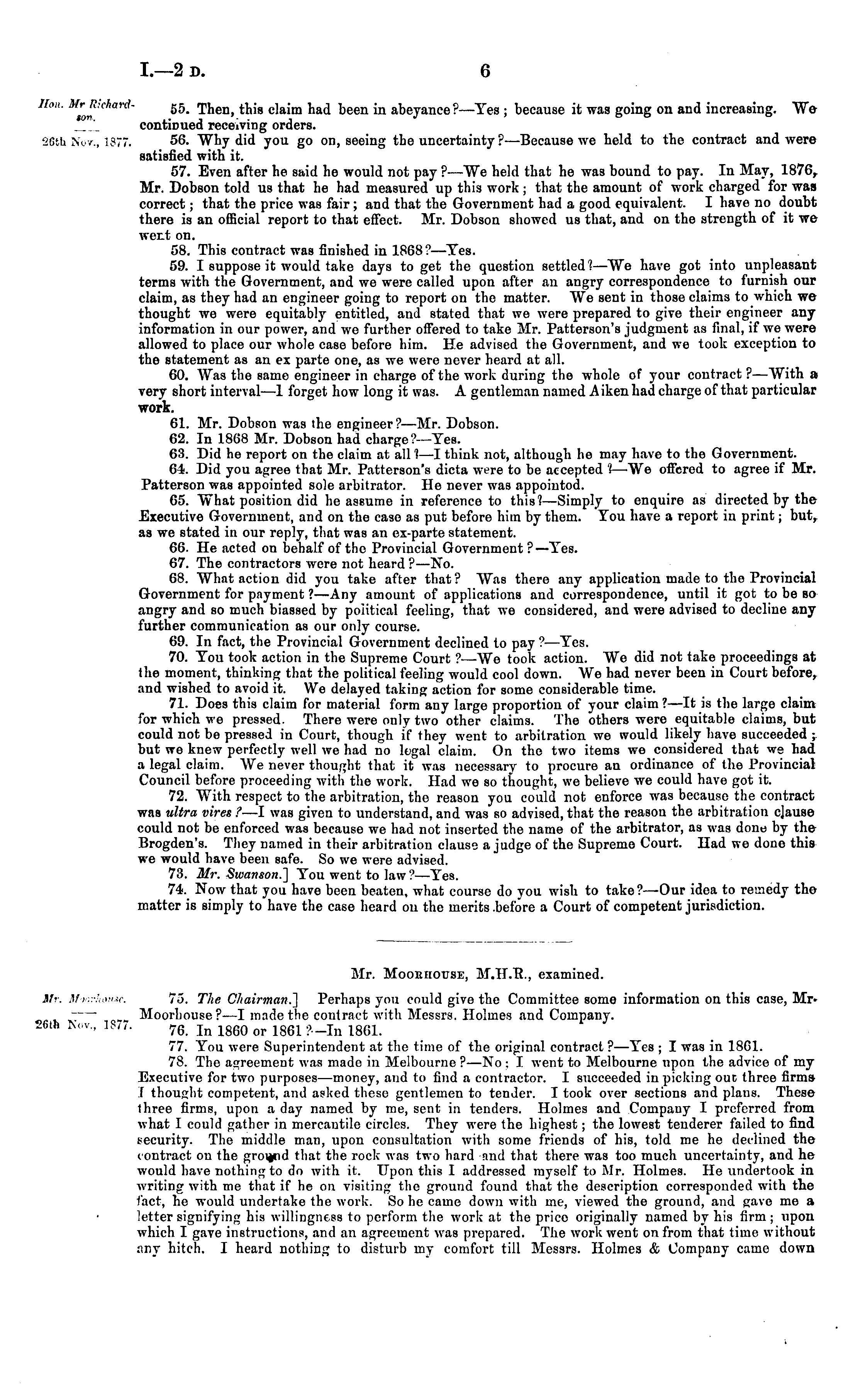 Hon. Mr R-.chard- g s> Then, this claim had been in abeyance?— Yes ; because it was going on and increasing. We ton. ,• 3 ■ ■ , J oo o contmued receiving orders. 26th Nov., 1877. 56. Why did you go on, seeing the uncertainty ?—Because we held to the contract and were satisfied with it. 57. Even after he said he would not pay ? —AVe held that he was bound to pay. In Alay, 1876, Mr. Dobson told us that he had measured up this work; that the amount of work charged for was correct; that the price was fair ; and that the Government had a good equivalent. I have no doubt there is an official report to that effect. Air. Dobson showed us that, and on the strength of it we went on. 58. This contract was finished in 1868:'-—Yes. 59. I suppose it would take days to get the question settled? —We have got into unpleasant terms with the Government, and we were called upon after an angry correspondence to furnish our claim, as they had an engineer going to report on the matter. We sent in those claims to which we thought we were equitably entitled, and stated that we were prepared to give their engineer any information in our power, and we further offered to take Air. Patterson's judgment as final, if we were allowed to place our whole case before him. He advised the Government, and we took exception to the statement as an ex parte one, as we were never heard at all. 60. AVas the same engineer in charge of the work during the whole of your contract ?—With a very short interval —1 forget how long it was. A gentleman named Aiken had charge of that particular work. 61. Air. Dobson was the engineer?— Air. Dobson. 62. In 1868 Air. Dobson had charge ?—Yes. 63. Did he report on the claim at all ?—I think not, although ho may have to the Government. 64. Did you agree that Mr. Patterson's dicta were to be accepted ?—We offered to agree if Mr. Patterson was appointed sole arbitrator. He never was appointed. 65. What position did he assume in reference to this? —Simply to enquire as directed by the Executive Government, and on the case as put before him by them. You have a report in print; but, as we stated in our reply, that was an ex-parte statement. 66. He acted on behalf of the Provincial Government?— Yes. 67. The contractors were not heard ? —No. 68. AVhat action did you take after that? Was there any application made to the Provincial Government for payment ?—Any amount of applications and correspondence, until it got to be so angry and so much biassed by political feeling, that we considered, and were advised to decline any further communication as our only course. 69. In fact, the Provincial Government declined to pay ?—Yes. 70. You took action in the Supreme Court ?—We took action. We did not take proceedings at the moment, thinking that the political feeling would cool down. AYe had never been in Court before, and wished to avoid it. We delayed taking action for some considerable time. 71. Does this claim for material form any large proportion of your claim ?—lt is the largo claim for which we pressed. There were only two other claims. The others were equitable claims, but could not be pressed in Court, though if they went to arbitration we would likely have succeeded ; but we knew perfectly well we had no legal claim. On the two items we considered that we had a legal claim. AYe never thought that it was necessary to procure an ordinance of the Provincial Council before proceeding with the work. Had we so thought, we believe we could have got it. 72. With respect to the arbitration, the reason you could not enforce was because tho contract was ultra vires ? —I was given to understand, and was so advised, that the reason the arbitration clause could not be enforced was because we had not inserted the name of the arbitrator, as was done by the Brogden's. They named in their arbitration clause a judge of the Supreme Court. Had wo done this we would have been safe. So we were advised. 73. Mr. Swanson.] You went to law ? —Yes. 74. Now that you have been beaten, what course do you wish to take?— Our idea to remedy tho matter is simply to have the case heard ou the merits .before a Court of competent jurisdiction.