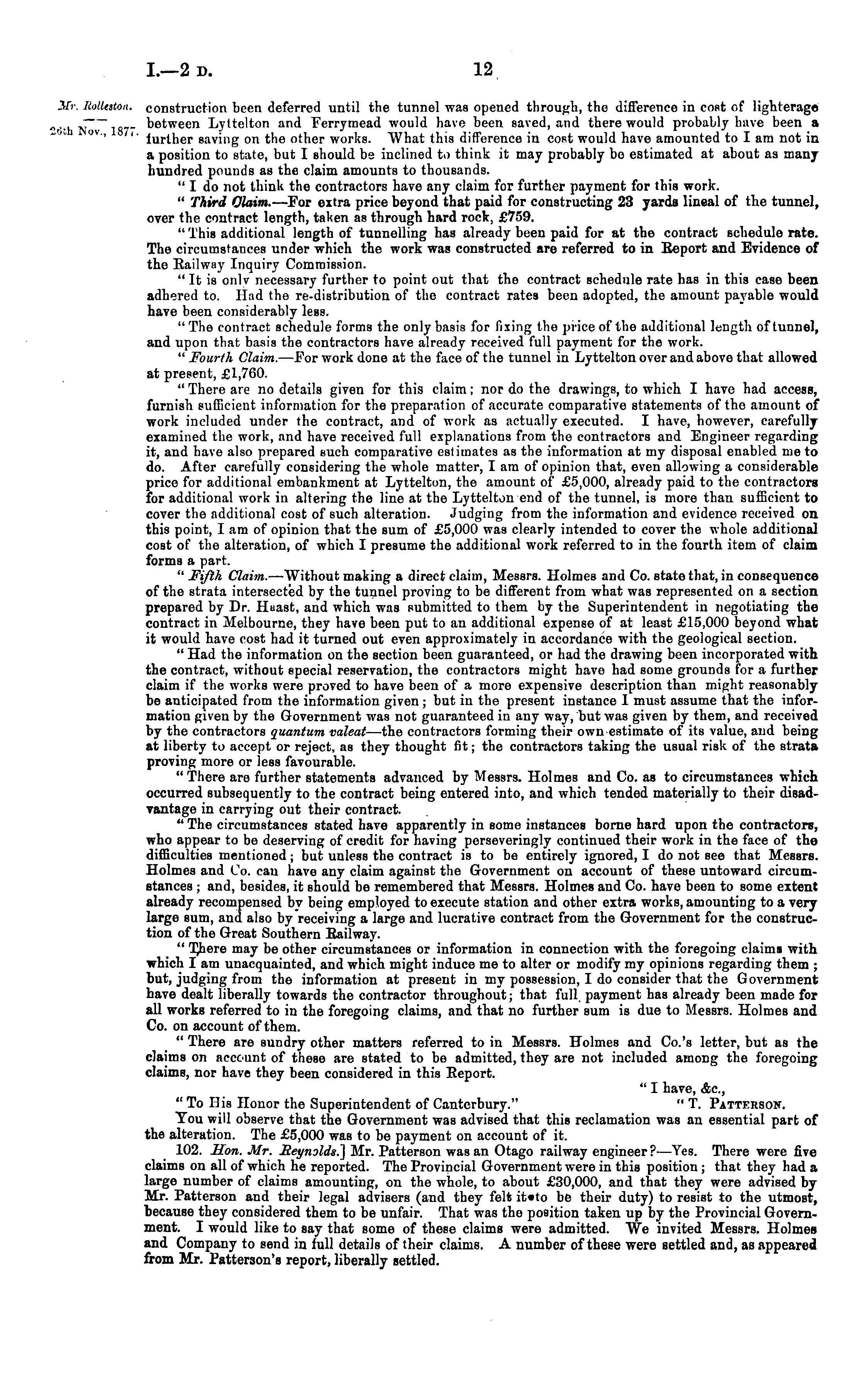 Mr. Rolleston. construction been deferred until the tunnel was opened through, the difference in cost of lighterage " 187- ootween Lyttelton and Ferrymead would have been saved, and there would probably have been a ov '' further saving on the other works. AVhat this difference in cost would have amounted to lam not in a position to state, but I should be inclined to think it may probably bo estimated at about as many hundred pounds as the claim amounts to thousands. " I do not think the contractors have any claim for further payment for this work. " Third Claim. —For extra price beyond that paid for constructing 23 yards lineal of the tunnel, over the contract length, taken as through hard rock. £759. " This additional length of tunnelling has already been paid for at the contract schedule rate. The circumstances under which the work was constructed are referred to in Report and Evidence of the Railway Inquiry Commission. "It is only necessary further to point out that the contract schedule rate has in this case been adhered to. Had the re-distribution of the contract rates been adopted, the amount payable would have been considerably less. "The contract schedule forms the only basis for fixing the price of the additional length of tunnel, and upon that basis the contractors have already received full payment for the work. " Fourth Claim. —For work done at the face of the tunnel in Lyttelton over and above that allowed at present, £1,760. " There are no details given for this claim; nor do the drawings, to which I have had access, furnish sufficient information for the preparation of accurate comparative statements of the amount of work included under the contract, and of work as actually executed. I have, however, carefully examirred the work, and have received full explanations from the contractors and Engineer regarding it, and have also prepared such comparative estimates as the information at my disposal enabled me to do. After carefully considering the whole matter, lam of opinion that, even allowing a considerable price for additional embankment at Lyttelton, the amount of £5,000, already paid to the contractors for additional work in altering the line at the Lyttelton end of the tunnel, is more than sufficient to cover the additional cost of such alteration. Judging from the information and evidence received on this point, I am of opinion that the sum of £5,000 was clearly intended to cover the whole additional cost of the alteration, of which I presume the additional work referred to in the fourth item of claim forms a part. " Fifth Claim. —Without making a direct claim, Messrs. Holmes and Co. state that, in consequence of the strata intersected by the tunnel proving to be different from what was represented on a section prepared by Dr. Huast, and which was submitted to them by the Superintendent in negotiating the contract in Alelbourne, they have been put to an additional expense of at least £15,000 beyond what it would have cost had it turned out even approximately in accordance with the geological section. " Had the information on the section been guaranteed, or had the drawing been incorporated with the contract, without special reservation, the contractors might have had some grounds for a further claim if the works were proved to have been of a more expensive description than might reasonably be anticipated from the information given ; but in the present instance I must assume that the information given by the Government was not guaranteed in any way, but was given by them, and received by the contractors quantum valeat —the contractors forming their own estimate of its value, and being at liberty to accept or reject, as they thought fit; the contractors taking the usual risk of the strata proving more or less favourable. "There are further statements advanced by Alessrs. Holmes and Co. as to circumstances which occurred subsequently to the contract being entered into, and which tended materially to their disadvantage in carrying out their contract. " The circumstances stated have apparently in some instances borne hard upon the contractors, who appear to be deserving of credit for having perseveringly continued their work in the face of the difficulties mentioned ; but unless the contract is to be entirely ignored, I do not see that Messrs. Holmes and Co. can have any claim against the Government on account of these untoward circumstances ; and, besides, it should be remembered that Messrs. Holmes and Co. have been to some extent already recompensed by being employed to execute station and other extra works, amounting to a very large sum, and also by receiving a large and lucrative contract from the Government for the construction of the Great Southern Railway. " There may be other circumstances or information in connection with the foregoing claims with which I am unacquainted, and which might induce me to alter or modify my opinions regarding them ; but, judging from the information at present in my possession, I do consider that the Government have dealt liberally towards the contractor throughout; that full payment has already been made for all works referred to in the foregoing claims, and that no further sum is due to Messrs. Holmes and Co. on account of them. " There are sundry other matters referred to in Messrs. Holmes and Co.'s letter, but as the claims on account of these are stated to be admitted, they are not included among the foregoing claims, nor have they been considered in this Report. " I have, &c, " To His Honor the Superintendent of Canterbury." " T. Patterson. You will observe that the Government was advised that this reclamation was an essential part of the alteration. The £5,000 was to be payment on account of it. 102. Hon. Mr. Reynolds.] Air. Patterson was an Otago railway engineer ?—Yes. There were five claims on all of which he reported. The Provincial Government were in this position ; that they had a large number of claims amo