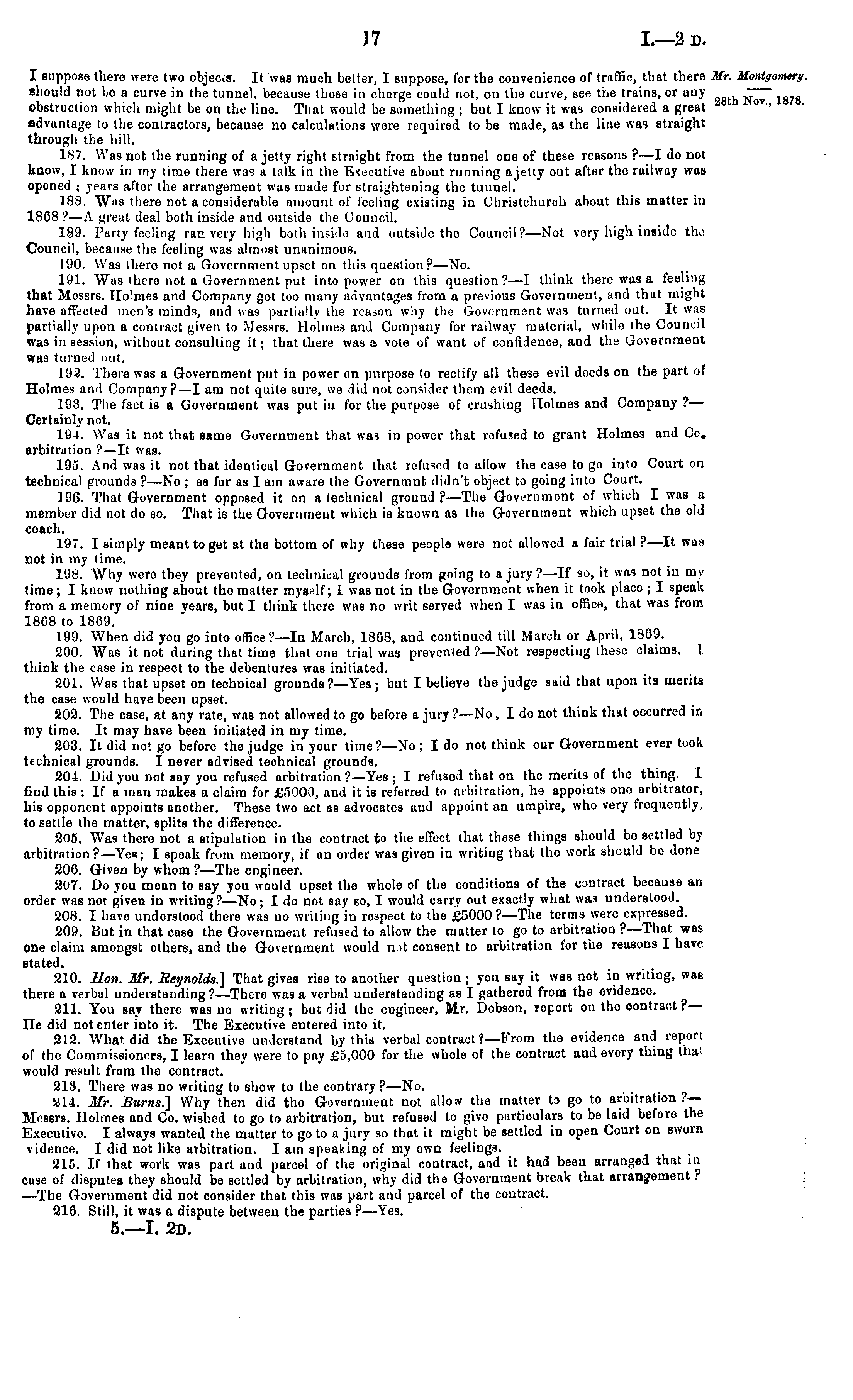 I suppose there were two objec.s. It was much better, I suppose, for the convenience of traffic, that there Mr. Montgomery. should not be a curve in the tunnel, because those in charge could not, on the curve, see the trains, or any - obstruction which might be on the line. That would be something ; but I know it was considered a great advantage to the contractors, because no calculations were required to be made, as the line was straight through the bill. 187. Was not the running of a jetty right straight from the tunnel one of these reasons ?—I do not know, I know in my time there was a talk in the Executive about running ajetty out after the railway was opened ; years after the arrangement was made for straightening the tunnel. 188. Was there not a considerable amount of feeling existing in Christchurch about this matter in 1868?— A great deal both inside and outside the Council. 189. Party feeling ran very high both inside and outside the Council?— Not very high inside the Council, because the feeling was almost unanimous. 190. Was there not a Government upset on this question?— No. 191. Was there not a Government put into power on this question? —I think there was a feeling that Messrs. Homes and Company got too many advantages from a previous Government, and that might have affected men's minds, and was partially the reason why the Government was turned out. It was partially upon a contract given to Messrs. Holmes and Company for railway material, while the Council was in session, without consulting it; that there was a vote of want of confidence, and the Government was turned out. 192. There was a Government put in power on purpose to rectify all these evil deeds on the part of Holmes and Company?—l am not quite sure, we did not consider them evil deeds. 193. The fact is a Government was put in for the purpose of crushing Holmes and Company ?— Certainly not. 194. Was it not that same Government that was in power that refused to grant Holmes and Co. arbitration ?—lt was. 195. And was it not that identical Government that refused to allow the case to go into Court on technical grounds ?—No ; as far as I am aware the Governmnt didn't object to going into Court. 196. Tlrat Government opposed it on a technical ground?— The Government of which I was a member did not do so. That is the Government which is known as the Government which upset the old coach. 197. I simply meant to get at the bottom of why these people were not allowed a fair trial ? —lt was not in my time. 198. Why were tbey prevented, on technical grounds from going to a jury ?—lf so, it was not in mv time; I know nothing about tho matter myself; I was not in the Government when it took place ; I speak from a memory of nine years, but I think there was no writ served when I was iv office, that was from 1868 to 1809. 199. "When did you go into office?—ln March, 1868, and continued till March or April, 1869. 200. Was it not during that time that one trial was prevented ?—Not respecting these claims. 1 think the case in respect to the debentures was initiated. 201. Was that upset on technical grounds?— Yes; but I believe the judge said that upon its merits the case would have been upset. 803. The case, at any rate, was not allowed to go before a jury ?—No, Ido not think that occurred in my time. It may have been initiated in my time. 203. It did not go before the judge in your time?—No; Ido not think our Government ever took technical grounds. I never advised technical grounds. 204. Did you not say you refused arbitration ?—Yes ; I refused that on the merits of the thing. I find this : If a man makes a claim for £5000, and it is referred to arbitration, he appoints one arbitrator, bis opponent appoints another. These two act as advocates and appoint an umpire, who very frequently, to settle the matter, splits the difference. 205. Was there not a stipulation in the contract to the effect that these things should be settled by arbitration?— Yea; I speak from memory, if an order was given in writing that the work should be done 206. Given by whom ?—The engineer. 2u7. Do you mean to say you would upset the whole of the conditions of the contract because an order was not given in writing?—No; I do not say so, I would carry out exactly what was understood. 208. I have understood there was no writing in respect to the £5000 ?—The terms were expressed. 209. But in that case the Government refused to allow the matter to go to arbitration ?—That was one claim amongst others, and the Government would not consent to arbitration for the reasons I have stated. 210. Hon. Mr. Reynolds.] That gives rise to another question ; you say it was not in writing, was there a verbal understanding?— There was a verbal understanding as I gathered from the evidence. 211. You say there was no writing ; but did the engineer, Mr. Dobson, report on the contract ?— He did not enter into it. The Executive entered into it. 212. What did the Executive understand by this verbal contract ?—From the evidence and report of the Commissioners, I learn they were to pay £5,000 for the whole of the contract and every thing that would result from the contract. 213. There was no writing to show to the contrary ? —No. 214. Mr. Burns.] Why then did the Government not allow the matter to go to arbitration?— Messrs. Holmes and Co. wished to go to arbitration, but refused to givo particulars to be laid before the Executive. I always wanted the matter to go to a jury so that it might be settled in open Court on sworn vidence. I did not like arbitration. lam speaking of my own feelings. 215. If that work was part and parcel of the original contract, and it had been arranged that in case of disputes they should be settled by arbitration, why did the Government break that arrangement ? —The Government did not consider that this was part and parcel of the contract. 216. Still, it was a dispute between the parties ?—Yes. 