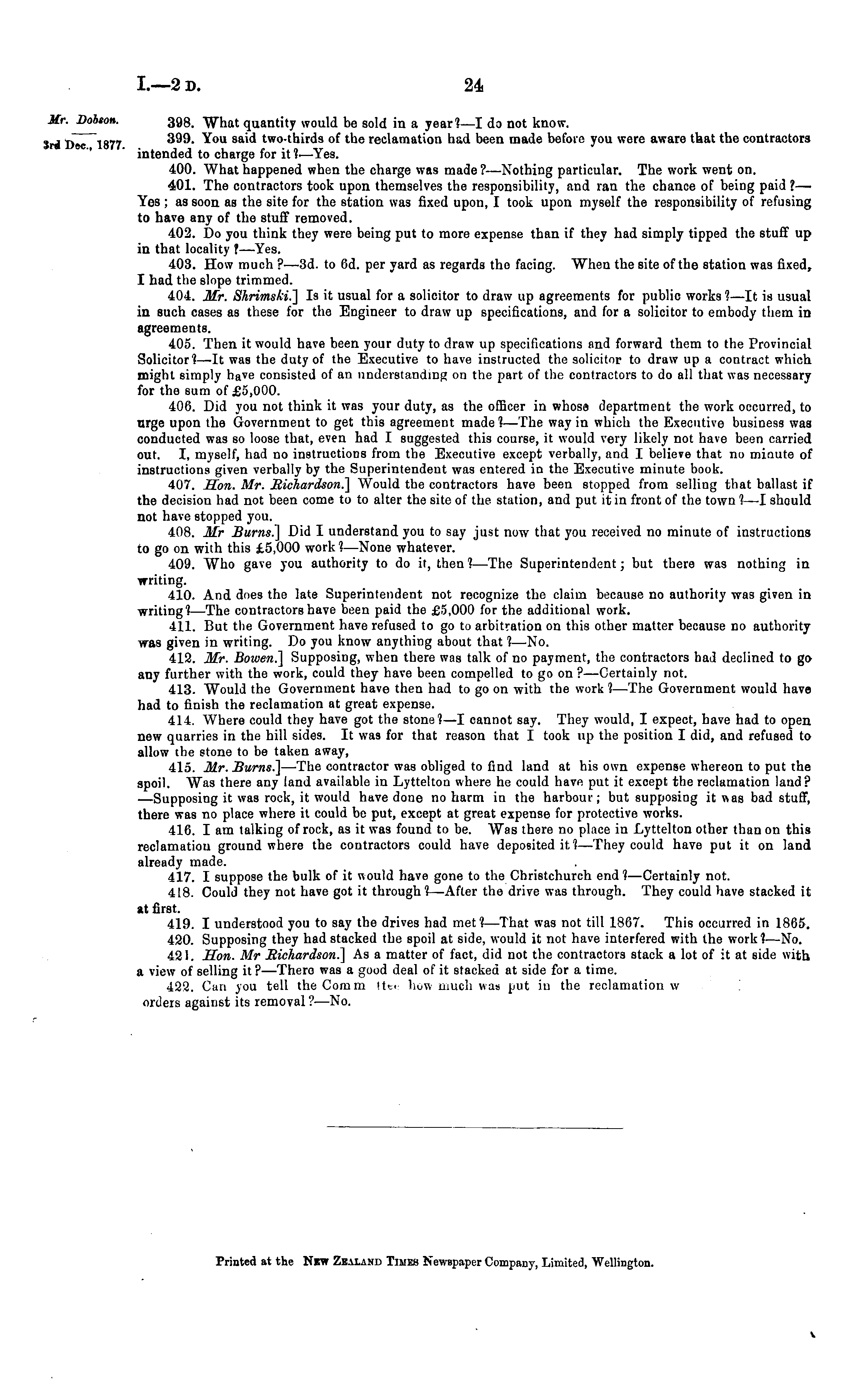 Mr. Dobson. 393. What quantity would be sold in a year?—l do not know. j, T) e<! 1H77 399. You said two-thirds of tbe reclamation had been made before you were aware that tbe contractors intended to charge for it?.—Yes. 400. What happened when tbe charge was made ?—Nothing particular. The work went on. 401. The contractors took upon themselves the responsibility, and ran the chance of being paid ? — Yes ; as soon as the site for tbe station was fixed upon, I took upon myself the responsibility of refusing to have any of the stuff removed. 402. Do you think they were being put to more expense than if they had simply tipped the stuff up in that locality ? —Yes. 403. How much ? —3d. to 6d. per yard as regards tho facing. When the site of the station was fixed, I had the slope trimmed. 404. Mr. Shrimski] Is it usual for a solicitor to draw up agreements for public works?—lt is usual in such cases as these for tbe Engineer to draw up specifications, and for a solicitor to embody them in agreements. 405. Then it would have been your duty to draw up specifications and forward tbem to tbe Provincial Solicitor?—lt was tbe duty of the Executive to have instructed the solicitor to draw up a contract which might simply have consisted of an understanding on the part of the contractors to do all that was necessary for the sum of £5,000. 406. Did you not think it was your duty, as the officer in whose department the work occurred, to urge upon the Government to get this agreement made?— The way in which the Executive business was conducted was so loose that, even had I suggested this course, it would very likely not have been carried out. I, myself, had no instructions from the Executive except verbally, and I believe that no minute of instructions given verbally by the Superintendent was entered in the Executive minute book. 407. Hon. Mr. Richardson.] Would the contractors have been stopped from selling that ballast if the decision had not been come to to alter the site of tbe station, and put it in front of the town ?—I should not have stopped you. 408. Mr Burns] Did I understand you to say just now that you received no minute of instructions to go on with this £5,000 work ?—None whatever. 409. Who gave you authority to do it, then ?—The Superintendent; but there was nothing in writing. 410. And does the late Superintendent not recognize tbe claim because no authority was given in writing?— The contractors have been paid the £5,000 for the additional work. 411. But the Government have refused to go to arbitration on this other matter because no authority was given in writing. Do you know anything about that ?—No. 412. Mr. Bowen] Supposing, when there was talk of no payment, the contractors had declined to go any further with the work, could they have been compelled to go on ? —Certainly not. 413. Would the Government have then had to go on with the work ?—The Government would have had to finish the reclamation at great expense. 414. Where could they have got the stone?—l cannot say. Tbey would, I expect, have had to open new quarries in the hill sides. It was for that reason that I took up the position I did, and refused to allow the stone to be taken away, 415. Mr. Burns.] —The contractor was obliged to find land at his own expense whereon to put the spoil. Was there any land available in Lyttelton where he could have put it except the reclamation land? —Supposing it was rock, it would have done no barm in the harbour; but supposing it was bad stuff, there was no place where it could be put, except at great expense for protective works. 416. lam talking of rock, as it was found to be. Was there no place in Lyttelton other than on this reclamation ground where the contractors could have deposited it?— They could have put it on land already made. 417. I suppose the bulk of it would have gone to the Christchurch end?— Certainly not. 418. Could tbey not have got it through?—-After the drive was through. They could have stacked it at first. 419. I understood you to say tbe drives bad met?— That was not till 1867. This occurred in 1865. 420. Supposing they had stacked tbe spoil at side, would it not have interfered with the work?— No. 421. Hon. Mr Richardson] As a matter of fact, did not the contractors stack a lot of it at side with a view of selling it ? —There was a good deal of it stacked at side for a time. 422. Can you tell the Comm Itee bow much was put in the reclamation w orders against its removal ?—No.