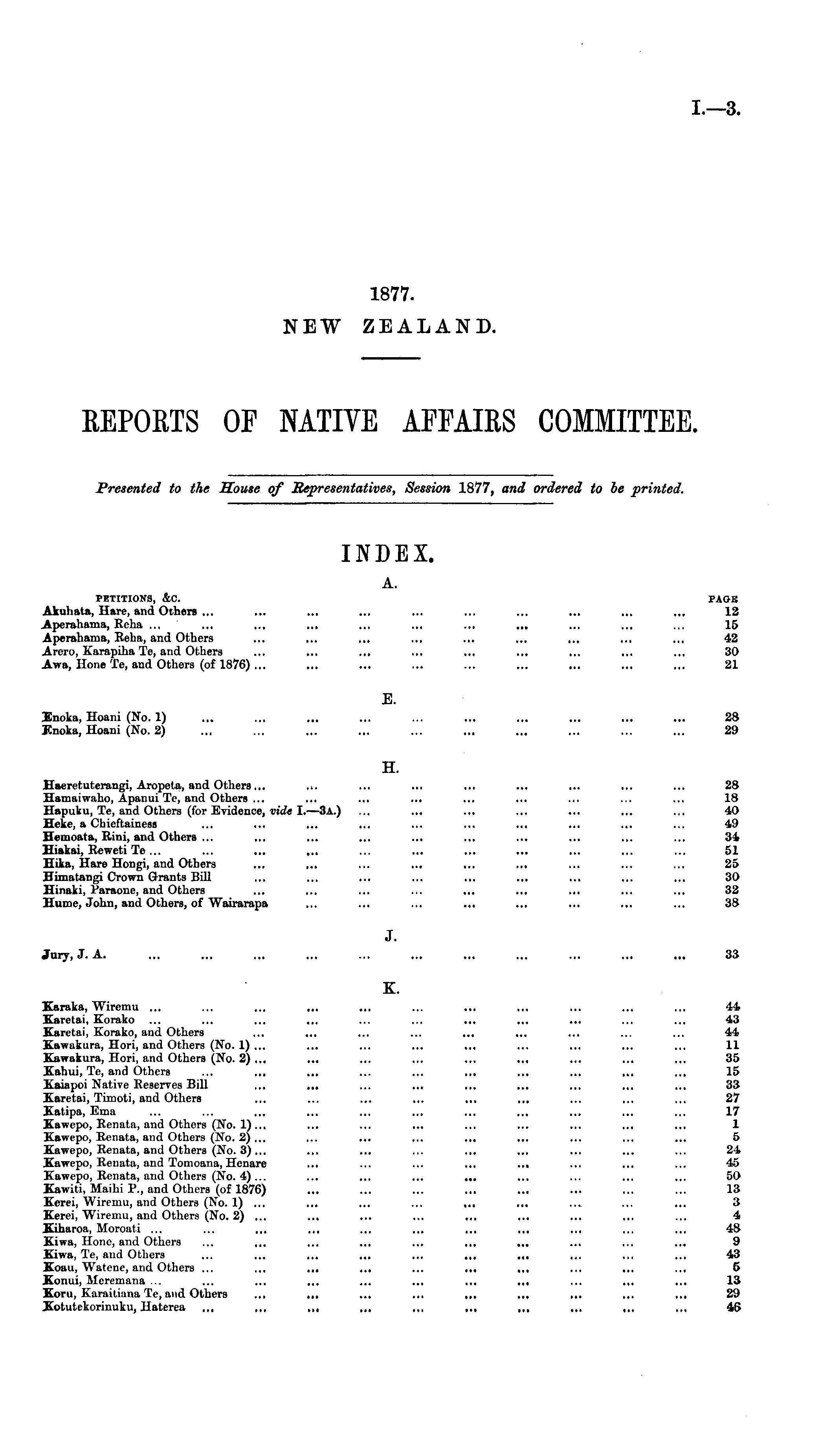 INDEX. A. PETITIONS, iC. PAGE Akuhata, Hare, and Others ... ... ... ... ... ... ... ... ... ... 12 Aperahama, Reha ... ... ... ... ... ... ... ... ... ... ... 15 Aperahama, Reha, and Others ... ... ... ... ... ... ... ... ... 42 Arero, Karapiha Te, and Others ... ... ... ... ... ... ... ... ... 30 Awa, Hone Te, and Others (of 1876)... ... ... ... ... ... ... ... ... 21 E. Enoka, Hoani (No. 1) ... ... ... ... ... ... ... ... ... ... 28 Enoka, Hoani (No. 2) ... ... ... ... ... ... ... ... ... ... 29 H. Haeretuterangi, Aropeta, and Others... ... ... ... ... ... ... ... ... 28 Hamaiwaho, Apanui Te, and Others ... ... ... ... ... ... ... ... ... 18 Hapuku, Te, and Others (for Evidence, vide 1.—3 a.) ... ... ... ... ... ... ... 40 Heke, a Cbieftainess ... ... ... ... ... ... ... ... ... ... 49 Hemoata, Rini, and Others ... ... ... ... ... ... ... ... ... ... 34 Hiakai, RewetiTe... ... ... ... ... ... ... ... ... ... ... 51 Hika, Hare Hongi, and Others ... ... ... ... ... ... ... ... ... 25 Himatangi Crown Grants Bill ... ... ... ... ... ... ... ... ... 30 Hinaki, Paraone, and Others ... ... ... ... ... ... ... ... ... 32 Hume, John, and Others, of Wairarapa ... ... ... ... ... ... ... ... 38 J. Jury, J. A. ... ... ... ... ... ... ... ... ... ... ... 33 K. Karaka, Wiremu ... ... ... ... ... ... ... ... ... ... ... 44, Karetai, Korako ... ... ... ... ... ... ... ... ... ... ... 43 Karetai. Korako, and Others ... ... ... ... ... ... ... ... ... 44, Kawakura, Hori, and Others (No. 1) ... ... ... ... ... ... ... ... ... 11 Kawakura, Hori, and Others (No. 2) ... ... ... ... ... ... ... ... ... 35 Kahui, Te, and Others ... ... ... ... ... ... ... ... ... ... 15 Kaiapoi Native Reserves BiU ... ... ... ... ... ... ... ... ... 33 Karetai, Timoti, and Others ... ... ... ... ... ... ... ... ... 27 Katipa, Ema ... ... ... ... ... ... ... ... ... ... ... 17 Kawepo, Renata, and Others (No. 1)... ... ... ... ... ... ... ... ... 1 Kawepo, Renata, and Others (No. 2) ... ... ... ... ... ... ... ... ... 5 Kawepo, Renata, and Others (No. 3)... ... ... ... ... ... ... ... ... 24 Kawepo, Renata, and Tomoana, Henare ... ... ... ... ... ... ... ... 45 Kawepo, Renata, and Others (No. 4)... ... ... ... ... ... ... ... ... 50 Kawiti, Maihi P., and Others (of 1876) ... ... ... ... ... ... ... ... 13 Kerei, Wiremu, and Others (No. 1) ... ... ... ... ... ... ... ... ... 3 Kerei, Wiremu, and Others (No. 2) ... ... ... ... ... ... ... ... ... 4 Kiharoa, Moroati ... ... ... ... ... ... ... ... ... ... ... 48 Kiwa, Hone, and Others ... ... ... ... ... ... ... ... ... ... 9 Kiwa, Te, and Others ... ... ... ... ... ~, ... ... ... ... 43 Koau, Watene, and Others ... ... ... ... ... ... ... ... ... ... 5 Konui, Meremana ... ... ... ... ... ... ... ... ... ... ... 13 Koru, Karaitiana Te, and Others ... ... ... ... ... ... ... ... ... 29 Xotutekorinuku, Haterea ... ... ~, ... ... ... ... ... ... ... 46