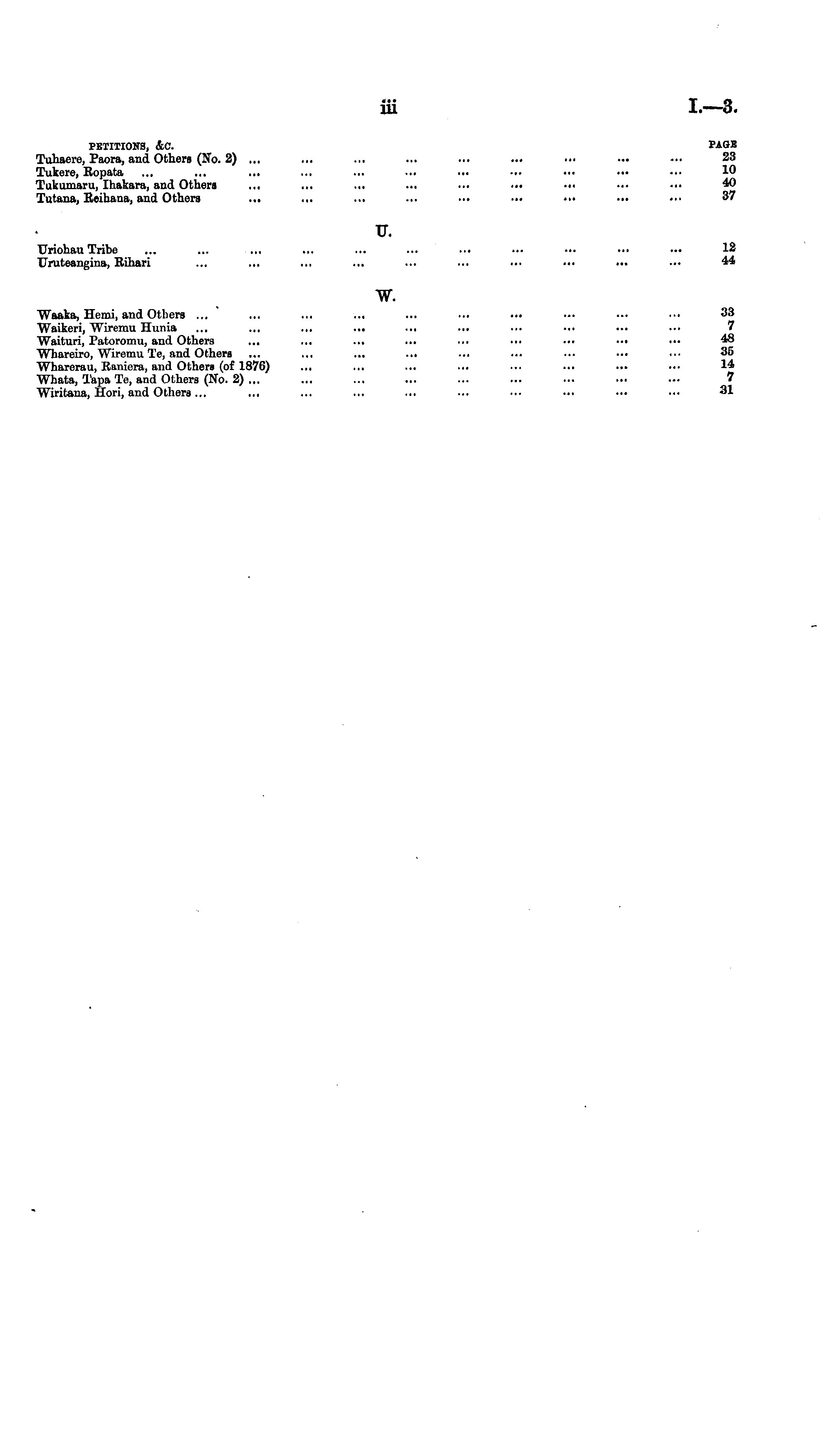 PETITIONS, &C. TAGS Tuhaere, Paora, and Others (No. 2) ... ... ... ... ... ... ... ... ••• 23 Tukere, Ropata ... ... ... ... ... ... ... ... ••• ••■ -•• 10 Tukumaru, Ihakara, and Others ... ... ... ... ... ••• ... ••• ••■ 40 Tutana, Reihana, and Others ... ... ... ... ... ... •■• ... ••• 37 v. TJriohau Tribe ... ... ... ... ... ... •■• ••• ... ••• — 12 TJruteangina, Rihari ... ... ... ... ... ... ... ... ... ... 44 w. Waaka, Hemi, and Others ... ... ... ... ... ... ••• ••• ■•■ ••• 33 Waikeri, Wiremu Hunia ... ... ... ... ... ... ... ... ... ... 7 Waituri, Patoromu, and Others ... ... ... ... ... ... ... ... ... 48 Whareiro, Wiremu Te, and Others ... ... ... ... ... ... ... ••• ••• 35 Wharerau, Raniera, and Others (of 1876) ... ... ... ... ... ... ... ••• 14 Whata, Tapa Te, and Others (No. 2) ... ... ... ... ... ... ... ... ... 7 Wiritana, Hori, and Others... ... ... ... ... ... ■•• ••• ••■ •■• 31
