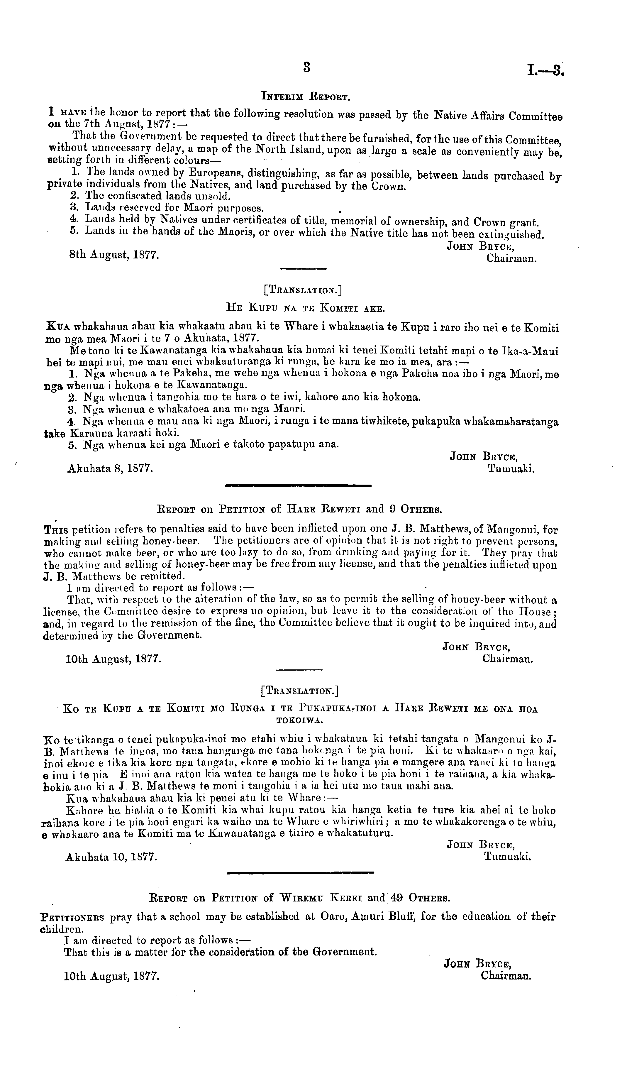 [Translation.] He Kupu na te Komiti ake. Kua whakahaua ahau kia whakaatu ahau kite Whare i whakaaetia te Kupu i raro iho nei c te Komiti mo nga mea Maori i te 7 o Akuhata, 1877. Me tono kite Kawanatanga kia whakahaua kia homai ki tenei Komiti tetahi mapi o te Ika-a-Maui hei te mapi nui, me mau enei whakaaturanga ki runga, he kara ke mo ia mea, ara : — 1. Nga whenua a te Pakeha, me wehe nga whenua i hokona c nga Pakeha noa iho i nga Maori, me nga whenua i hokona c te Kawanatanga. 2. Nga whenua i tangohia mo te hara o te iwi, kahore ano kia hokona. 3. Nga whenua c whakatoea ana mo nga Maori. 4. Nga whenua c mau ana ki nga Maori, i runga ite mana tiwhikete, pukapuka whakamaharatanga take Karauna karaati hoki. 5. Nga whenua kei nga Maori c takoto papatupu ana. John Bryce, Akuhata 8, 1577. Tumuaki.