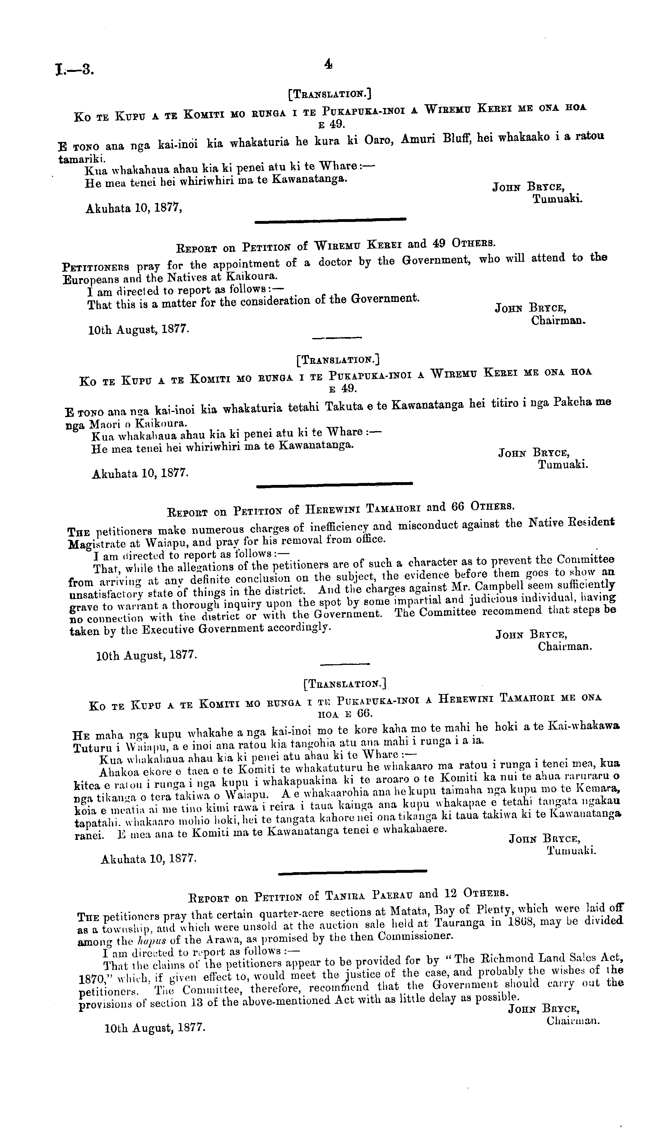 [Translation.] Ko te Kupu a te Komiti mo runga i th Pukapuka-inoi a Herewini Tamahori me ona HOA E 66. He maha nga kupu whakahe a nga kai-inoi mo te kore kahamo te mahi he hoki ate Kai-whakawa Tuturu i Waiapu, a o inoi ana ratou kia tangohia atu ana mahi i runga i a ia. Kin, whakahaua ahau kia ki penei atu ahau kite Whare : , . Ahakoaeko cMea etc Komiti te whakatuturu he whakaaro ma ratou i runga i tenet mea, kua kitea er iZL i nga kupu i whakapuakina kite aroaro ote Komiti ka nui te ahua raruraru o »«ti?-an To te ratal twa o Waiapu. A a whakaarohia ana hekupu ta.maha nga kupu mo te kemara, SS a me to kimi rawa . reira i taua kainga ana kupu whakapae c tetah, tangata ngakau to P at?air;vhakaar:. N.ohio hoki,hei te tangata kahorenei ona tikanga ki taua takiwa kite Kawanatanga ranei. E mea ana te Komiti ma te Kawanatanga tenei c whakahaere. ,„ , n -~ Tumuaki. Akuhata 10, 1877.