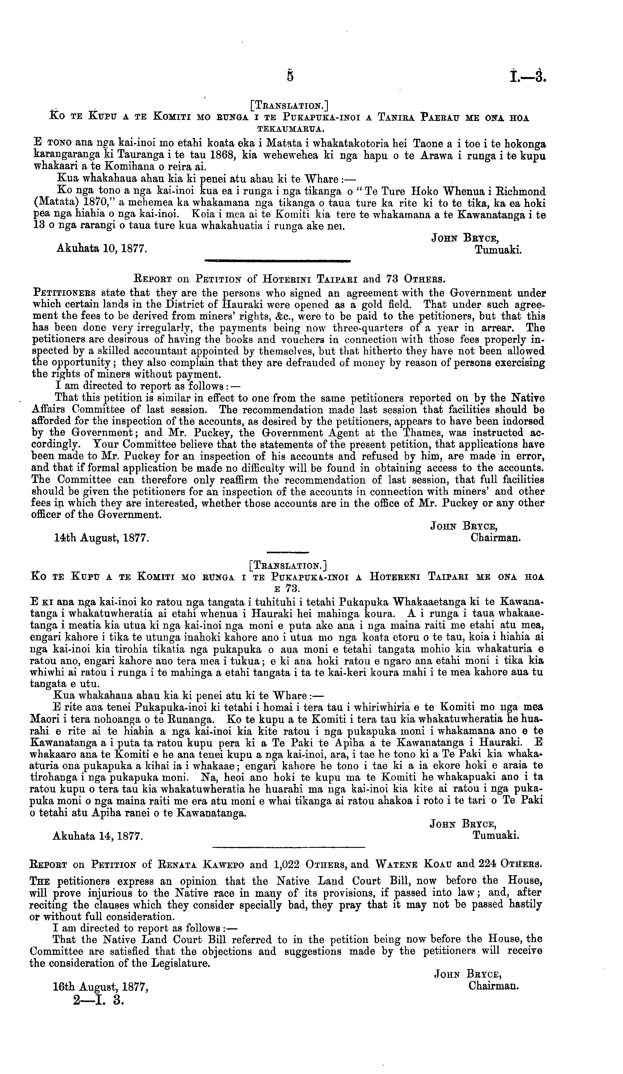 [Translation.] Ko te Kupu a te Komiti mo runga i te Pukapuka-inoi a Hotereni Taipari me ona hoa c 73. E ki ana nga kai-inoi ko ratou nga tangata i tuhituhi i tetahi Pukapuka Whakaaetanga kite Kawanatanga i whakatuwheratia ai etahi whenua i Hauraki hei mahinga koura. A i runga i taua whakaaetanga i meatia kia utua ki nga kai-inoi nga moni c puta ake ana i nga mama raiti me etahi atu mea, engari kahore i tika te utunga inahoki kahore ano i utua mo nga koata etoru o te tau, koia i hiahia ai nga kai-inoi kia tirohia tikatia nga pukapuka o aua moni c tetahi tangata mohio kia whakaturia c ratou ano, engari kahore ano tera mea i tukua; eki ana hoki ratou c ngaro ana etahi moni i tika kia whiwhi ai ratou i runga i te mahinga a etahi tangata i ta te kai-keri koura mahi i te mea kahore aua tv tangata c utu. Kua whakahaua ahau kia ki penei atu kite Whare: — E rite ana tenei Pukapuka-inoi ki tetahi i homai i tera tau i whiriwhiria c te Komiti mo nga mea Maori i tera nohoanga ote Eunanga. Ko te kupu ate Komiti i tera tau kia whakatuwheratia he huarahi c rite ai te hiahia a nga kai-inoi kia kite ratou i nga pukapuka moni i whakamana ano c te Kawanatanga a i puta ta ratou kupu pera ki aTe Paki te Apiha ate Kawanatanga i Hauraki. E whakaaro ana te Komiti c he ana tenei kupu a nga kai-inoi, ara, i tae he tono ki a Te Paki kia whaka* aturia ona pukapuka a kihai ia i whakaae; engari kahore he tono i tae ki a ia ekore hoki c araia te tirohanga i nga pukapuka moni. Na, heoi ano hoki te kupu ma te Komiti he whakapuaki ano ita ratou kupu o tera tau kia whakatuwheratia he huarahi ma nga kai-inoi kia kite ai ratou i nga pukapuka moni o nga mama raiti me era atu moni c whai tikanga ai ratou ahakoa i roto i te tari o Te Paki o tetahi atu Apiha ranei o te Kawanatanga. John Bryce, Akuhata 14,1877. Tumuaki.