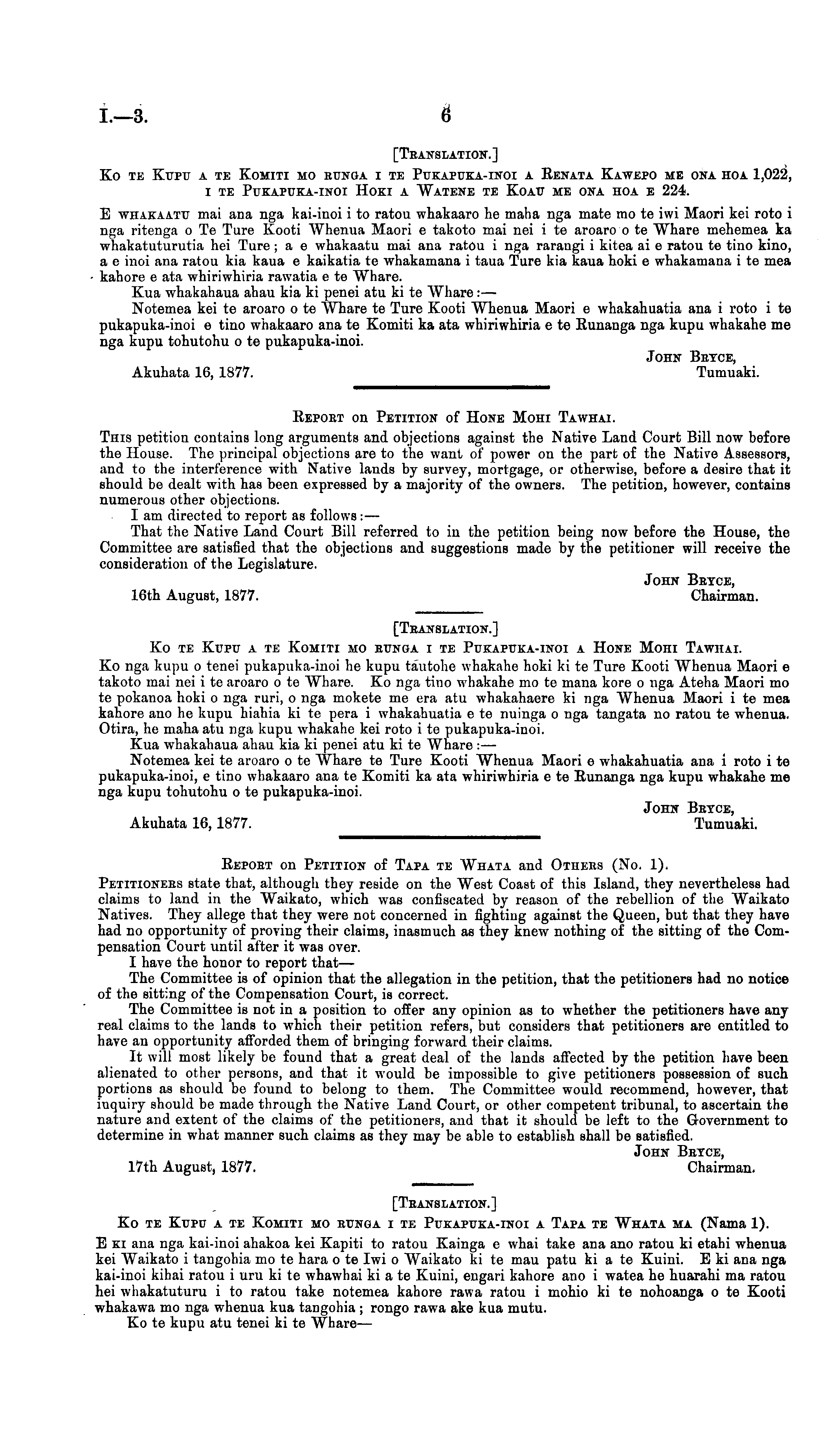 [Translation.] Ko te Kupu a te Komiti mo runga i te Pukapuka-inoi a Hone Mohi Tawhai. Ko nga kupu o tenei pukapuka-inoi he kupu tautohe whakahe hoki kite Ture Kooti Whenua Maori c takoto mai nei ite aroaro ote Whare. Ko nga tino whakahe mo te mana kore o nga Ateha Maori mo te pokanoa hoki o nga ruri, o nga mokete me era atu whakahaere ki nga Whenua Maori i te mea kahore ano he kupu hiahia kite pera i whakahuatia c te nuinga o nga tangata no ratou te whenua. Otira, he maha atu nga kupu whakahe kei roto i te pukapuka-inoi. Kua whakahaua ahau kia ki penei atu kite Whare : — Notemea kei te aroaro o te Whare te Ture Kooti Whenua Maori c whakahuatia ana i roto i te pukapuka-inoi, c tino whakaaro ana te Komiti ka ata whiriwhiria c te Eunanga nga kupu whakahe me nga kupu tohutohu o te pukapuka-inoi. John Bryce, Akuhata 16, 1877. Tumuaki.