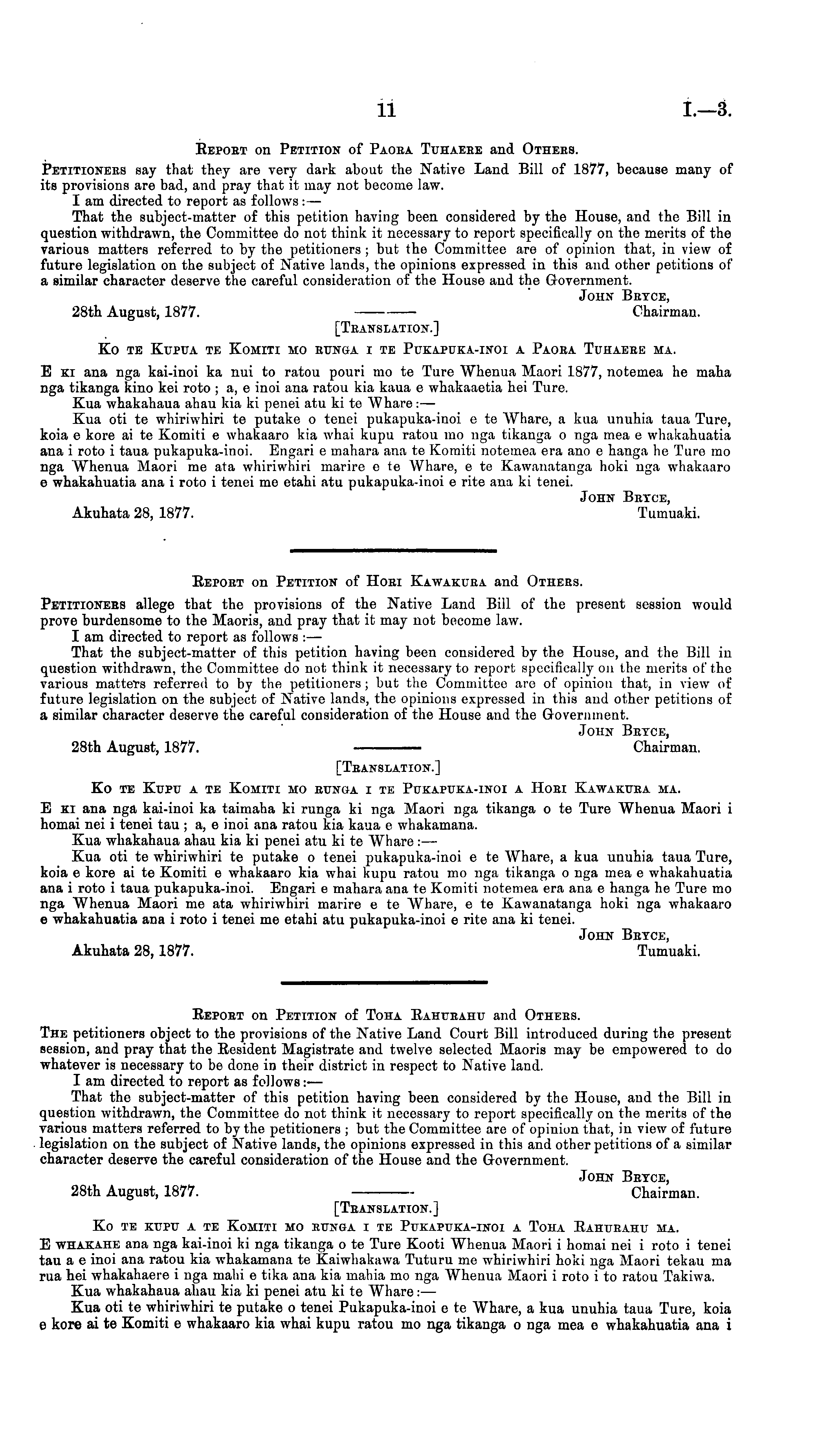 [Translation.] Ko te Kupu a te Komiti mo runga i te Pukapuka-inoi a Hori Kawakura ma. E ki ana nga kai-inoi ka taimaha ki runga ki nga Maori nga tikanga o te Ture Whenua Maori i homai nei i tenei tau ; a, c inoi ana ratou kia kaua c whakamana. Kua whakahaua ahau kia ki penei atu kite Whare : — Kua oti te whiriwhiri te putake o tenei pukapuka-inoi c te Whare, a kua unuhia taua Ture, koia c kore ai te Komiti c whakaaro kia whai kupu ratou mo nga tikanga o nga mea c whakahuatia ana i roto i tana pukapuka-inoi. Engari c mahara ana te Komiti notemea era ana c hanga he Ture mo nga Whenua Maori me ata whiriwhiri marire c te Whare, c te Kawanatanga hoki nga whakaaro c whakahuatia ana i roto i tenei me etahi atu pukapuka-inoi c rite ana ki tenei. John Bryce, Akuhata 28,1877. Tumuaki.