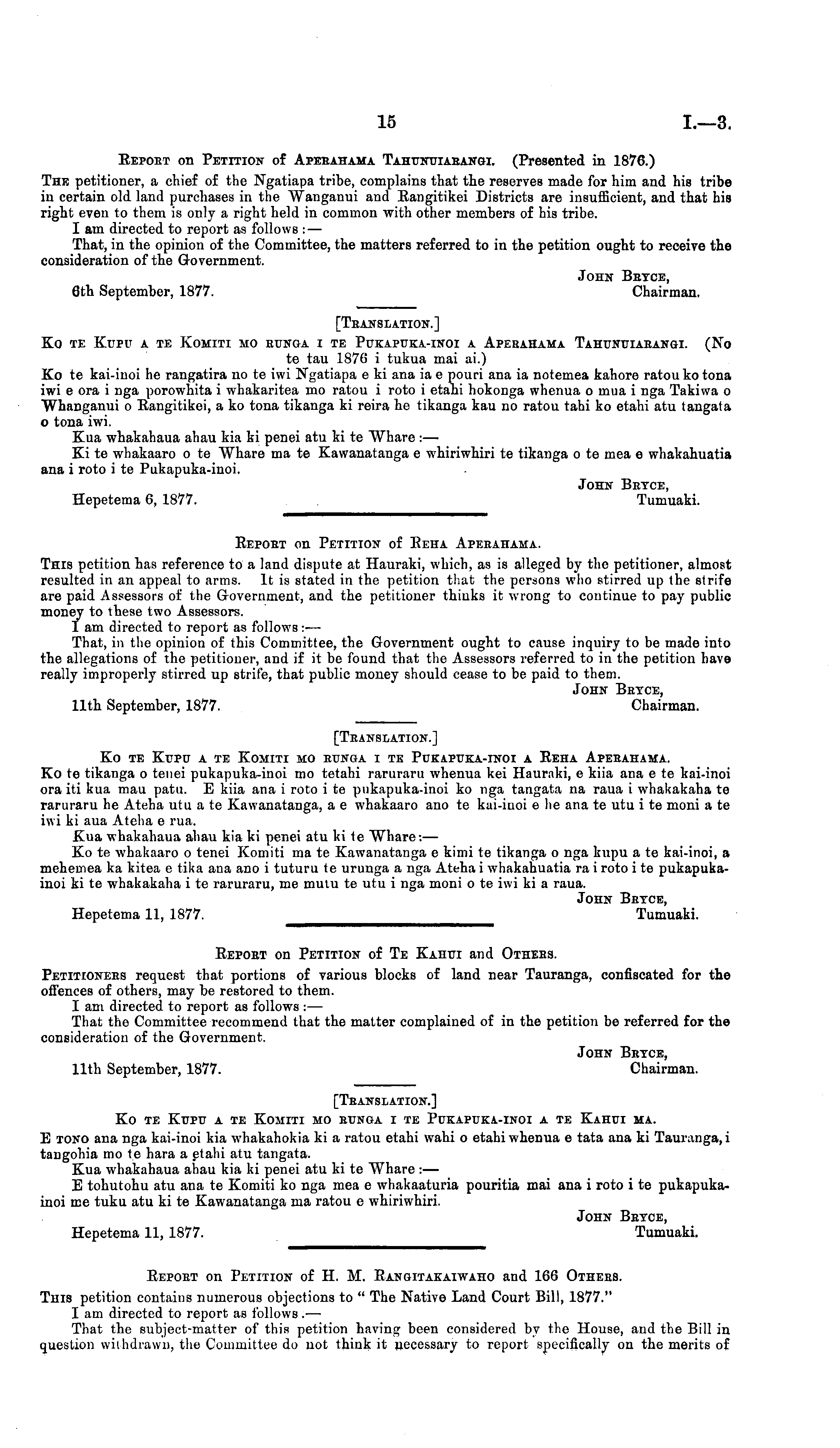[Translation.] Ko te Kupu a te Komiti mo runga i te Pukapuka-inoi a Eeha Aperahama. Ko te tikanga o tenei pukapuka-inoi mo tetahi raruraru whenua kei Hauraki, c kiia ana c te kai-inoi ora iti kua mau patu. E kiia ana i roto ite pukapuka-inoi ko nga tangata na raua i whakakaha te raruraru he Ateha utu a te Kawanatanga, a c whakaaro ano te kai-inoi c he ana te utu i te moni a te iwi ki aua Ateha c rua. Kua whakahaua ahau kia ki penei atu kite Whare:— Ko te whakaaro o tenei Komiti ma te Kawanatanga c kimi te tikanga o nga kupu a te kai-inoi, a mehemea ka kitea c tika ana ano i tuturu te urunga a nga Ateha i whakahuatia ra i roto i te pukapukainoi kite whakakaha i te raruraru, me mutu te utu i nga moni o te iwi ki a raua. John Bryce, Hepetema 11, 1877. Tumuaki.