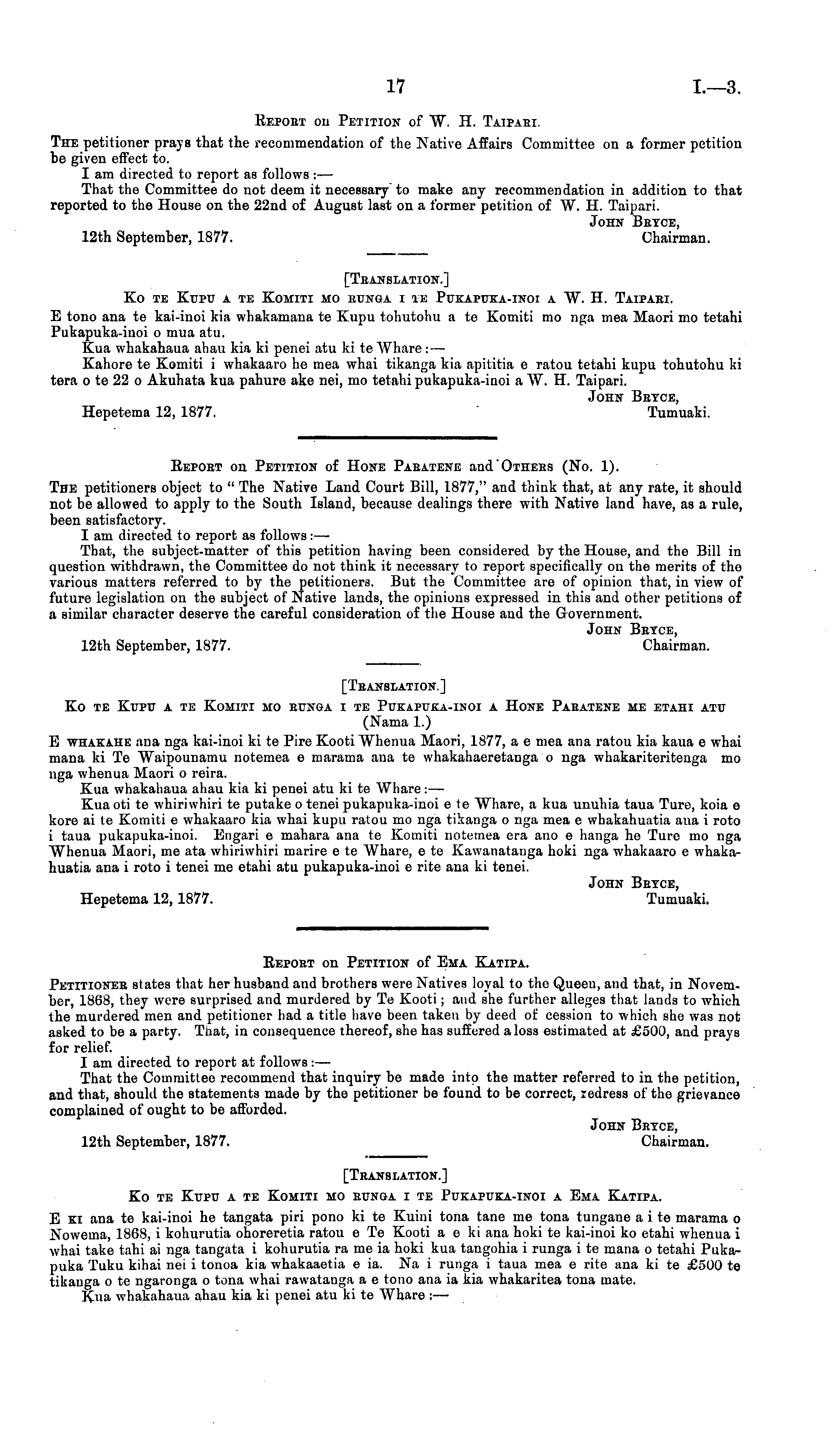 [Translation.] Ko te Kupu a te Komiti mo runga i te Pukapuka-inoi a Hone Paratene me etahi atu (Nama 1.) E whakahe ana nga kai-inoi kite Pire Kooti Whenua Maori, 1877, a c mea ana ratou kia kaua c whai mana ki Te Waipounamu notemea c marama ana te whakahaeretanga o nga whakariteritenga mo nga whenua Maori o reira. Kua whakahaua ahau kia ki penei atu kite Whare: — Kua oti te whiriwhiri te putake o tenei pukapuka-inoi c te Whare, a kua unuhia taua Ture, koia c kore ai te Komiti c whakaaro kia whai kupu ratou mo nga tikanga o nga mea c whakahuatia ana i roto i taua pukapuka-inoi. Engari c mahara ana te Komiti notemea era ano c hanga he Ture mo nga Whenua Maori, me ata whiriwhiri marire c te Whare, c te Kawanatanga hoki nga whakaaro c whakahuatia ana i roto i tenei me etahi atu pukapuka-inoi c rite ana ki tenei. John Bryce, Hepetema 12, 1877. Tumuaki.