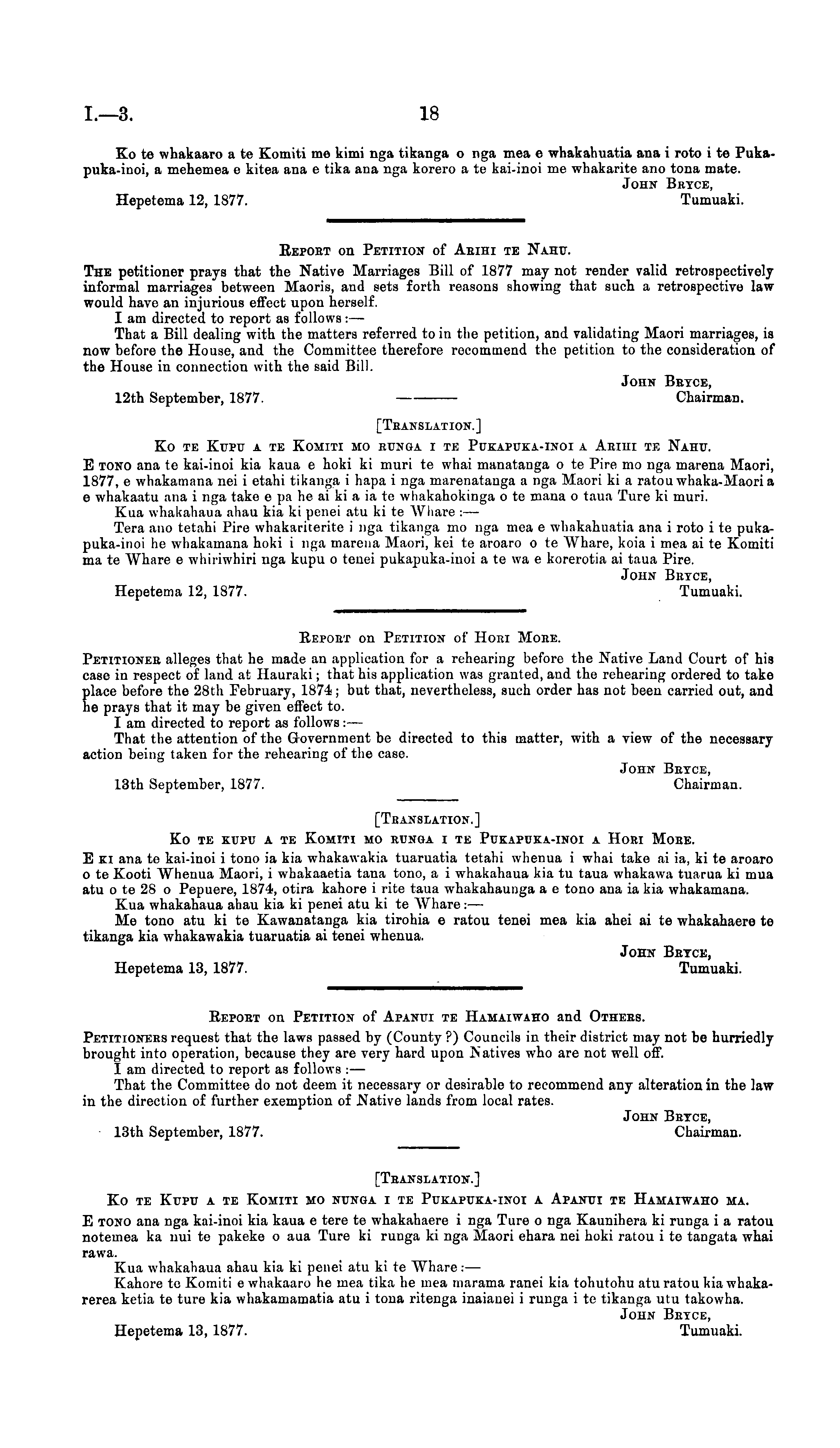 Ko te whakaaro a te Komiti me kimi nga tikanga o nga mea c whakahuatia ana i roto i te Puka-puka-inoi, a mehemea c kitea ana c tika ana nga korero a te kai-inoi me whakarite ano tona mate. John Bryce, Hepetema 12, 1877. Tumuaki.