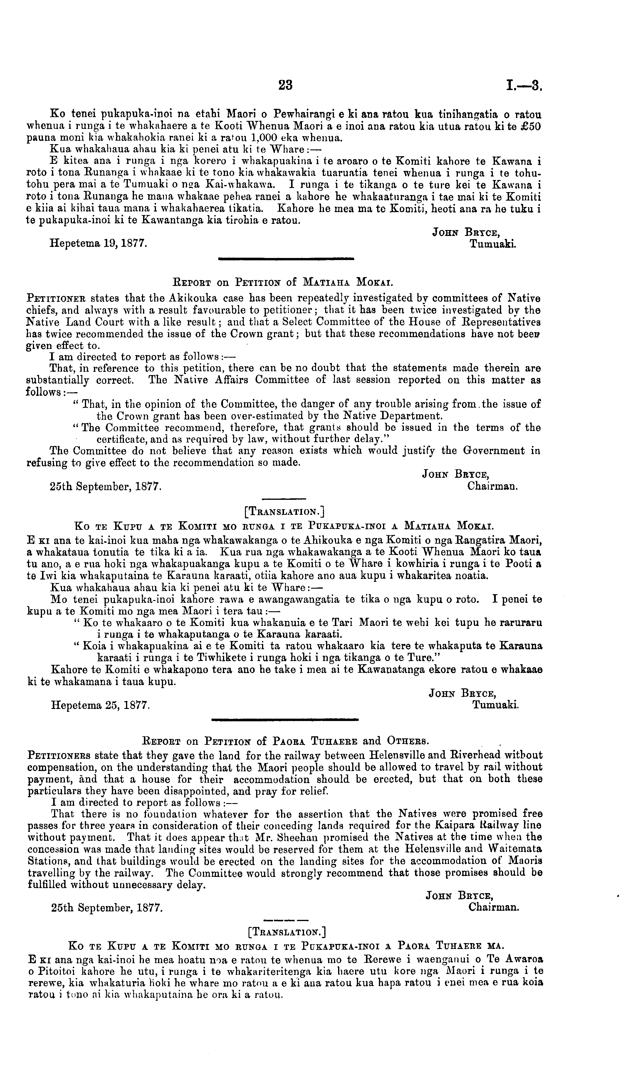 [Translation.] Ko te Kupu a te Komiti mo runga i te Pukapuka-inoi a Matiaha Mokai. E ki ana te kai-inoi kua maha nga whakawakanga o te Ahikouka c nga Komiti o nga Eangatira Maori, a whakataua tonutia te tika ki a ia. Kua rua nga whakawakanga ate Kooti Whenua Maori ko taua tv ano, a c rua hoki nga whakapuakanga kupu a te Komiti o te Whare i kowhiria i runga i te Pooti a te Iwi kia whakaputaina te Karauna karaati, otiia kahore ano aua kupu i whakaritea noatia. Kua whakahaua ahau kia ki penei atu kite Whare: — Mo tenei pukapuka-inoi kahore rawa c awangawangatia te tika o nga kupu o roto. I penei te kupu a te Komiti mo nga mea Maori i tera tau: — " Ko te whakaaro o te Komiti kua whakanuia c te Tari Maori te wehi kei tupu he raruraru i runga i te whakaputauga o te Karauna karaati. " Koia i whakapuakina ai c te Komiti ta ratou whakaaro kia terete whakaputa te Karauna karaati i runga i te Tiwhikete i runga hoki i nga tikanga o te Ture." Kahore te Komiti c whakapono tera ano he take i mea ai te Kawanatanga ekore ratou c whakaae kite whakamana i taua kupu. John Bryce, Hepetema 25, 1877. Tumuaki.